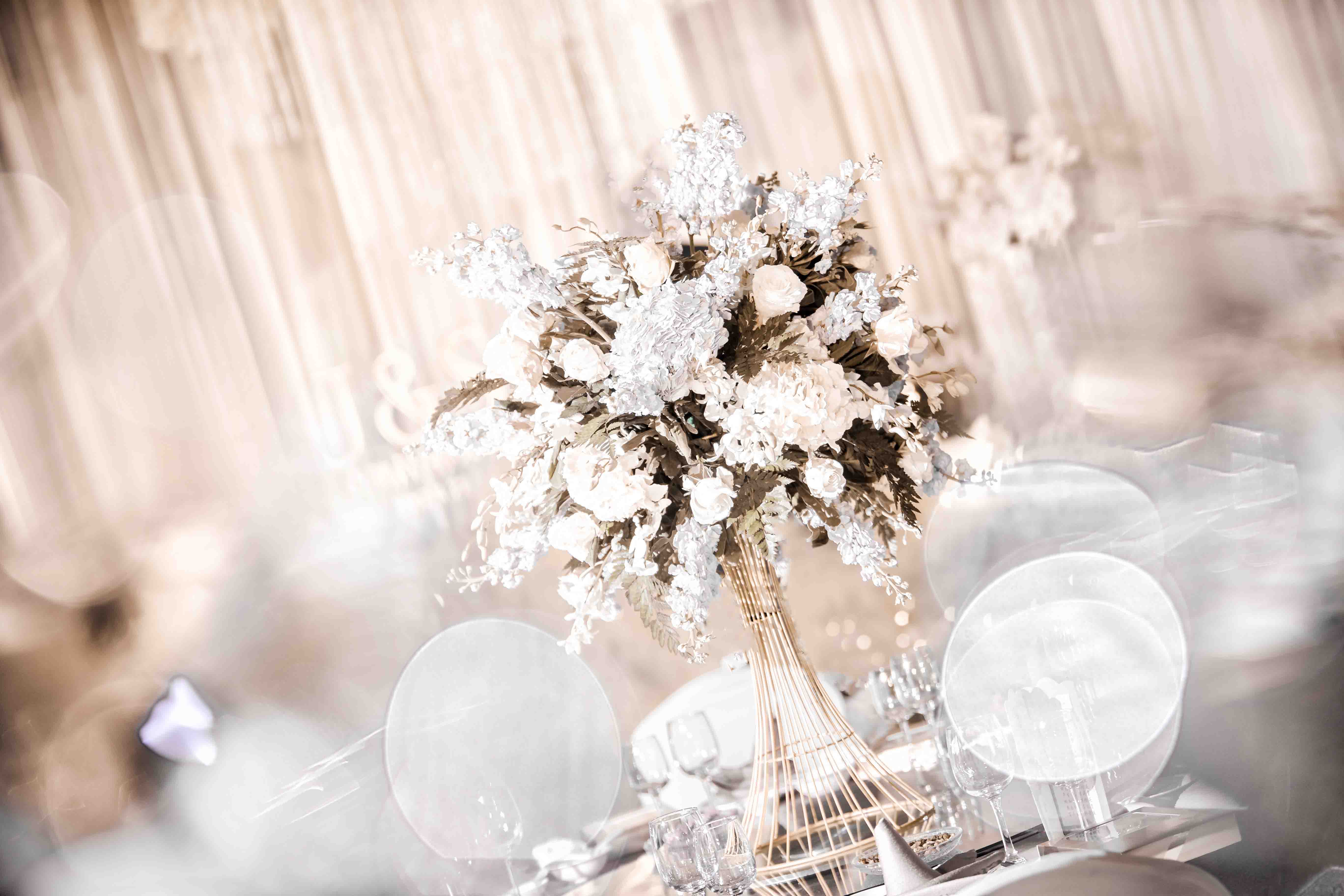 轻透的纱幔,起伏的花艺搭配透明亚克力。