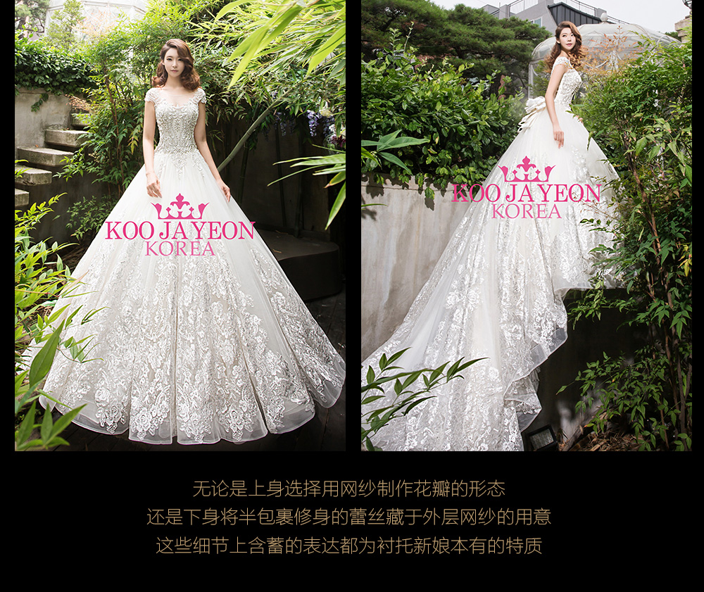 温婉,纯净 是这件婚纱给人的第一感觉 也是这件婚纱设计的灵感来源 无论是上身选择用网纱制作花瓣的形态 还是下身将半包裹修身的蕾丝藏于外层网纱的用意 这些细节上含蓄的表达都为衬托新娘本有的特质。