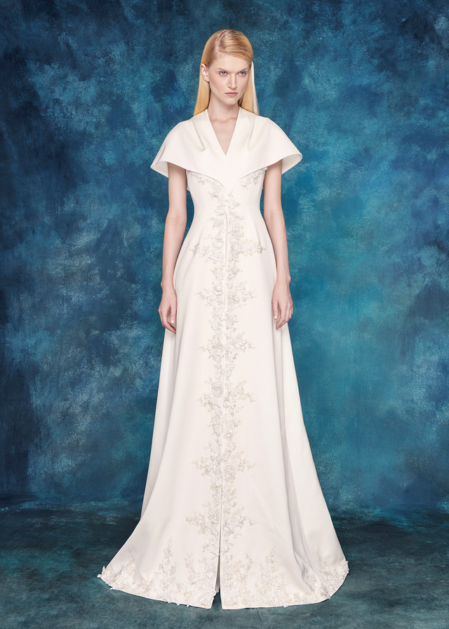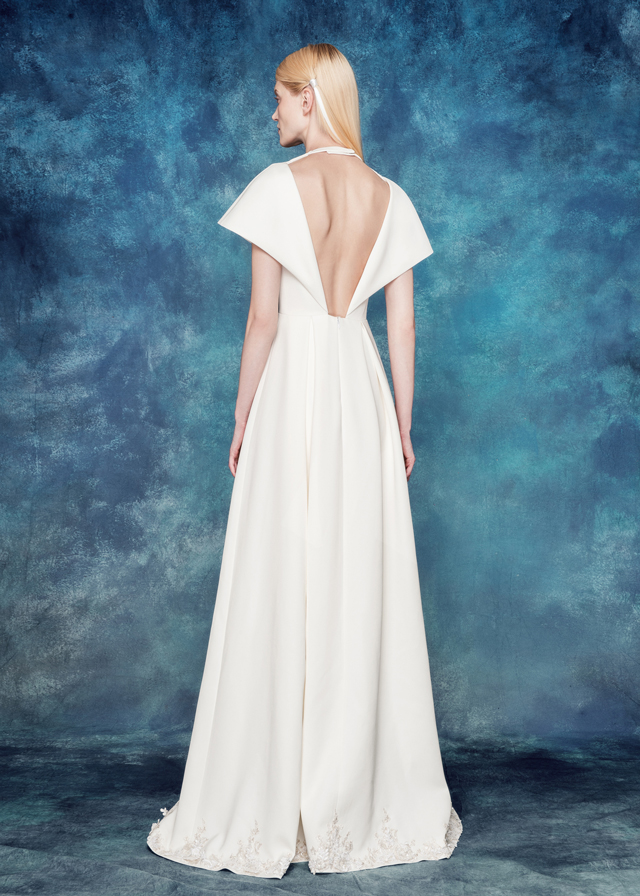 复古宫廷式裤装婚纱。深V造型结合连肩袖的搭配设计,结构线一直延伸至前中腰部,自然敞开,视觉上突显腰部的纤细。开衩两边立体蕾丝有层次的装饰,宫廷范十足。薄而透的雪纺压褶阔腿长裤,在行走间浮游流动。大露背的设计结合颈带的造型,丰富细节的同时,性感和优雅兼备。