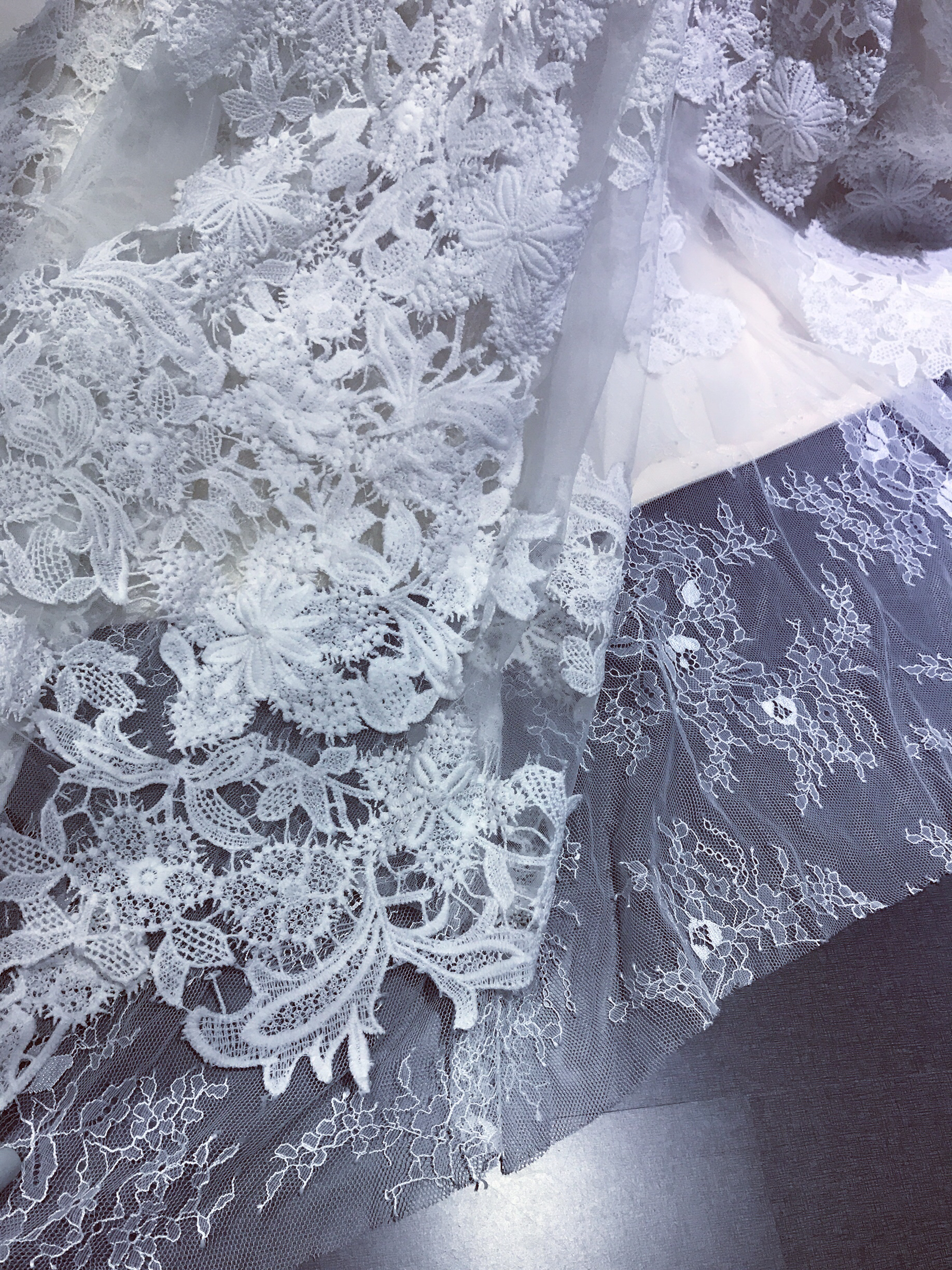 内衬为进口软缎 贴肤透气舒适光滑 底衬为浅香槟色 覆盖法国蕾丝 最外一层覆盖牛奶水溶蕾丝 效果极佳 灯光下更立体 别致