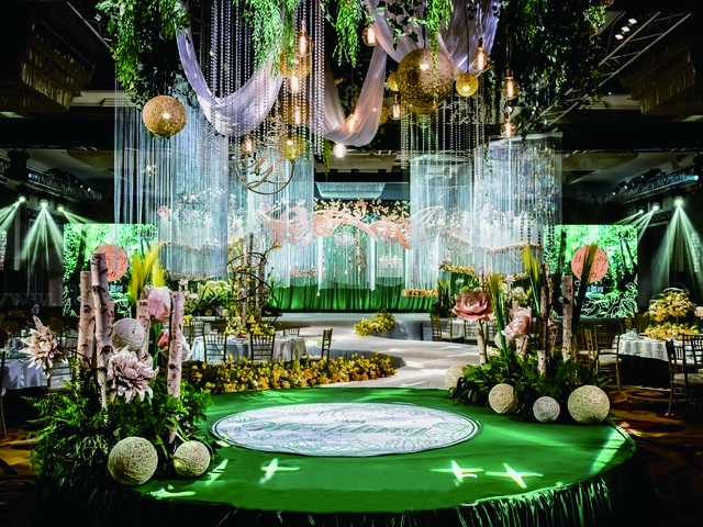 超大豪华布艺帷幔背景(复式三块背景)结合 KT 板造型/豪华布艺帷幔,高清写真喷绘,组合背景/豪华布艺背景和 KT 板造型组合背景/豪华飘顶一个,结合 KT 板造型;精美定制雪弗板花瓣装饰 1 组;设计师一对一专设计属设计 KT 板造型;豪华金色罗马盆路引和花艺装饰 8 个/花瓣龙珠灯路引 8 个(二选一);欧式时尚铁艺贵妃椅 1 套和花艺装饰;豪华浪漫高仿真樱花树 1 棵;专业钢结构 T 台 ;T 台末端方形交接仪式舞台;T 台两侧高仿真花艺花排;红地毯或主题色地毯或镜面地毯;T 台交接仪式区樱花拱门 1 座;高档水晶吊灯 2 盏;精美亚克力直筒玻璃花瓶 24个;水晶珠帘数串。