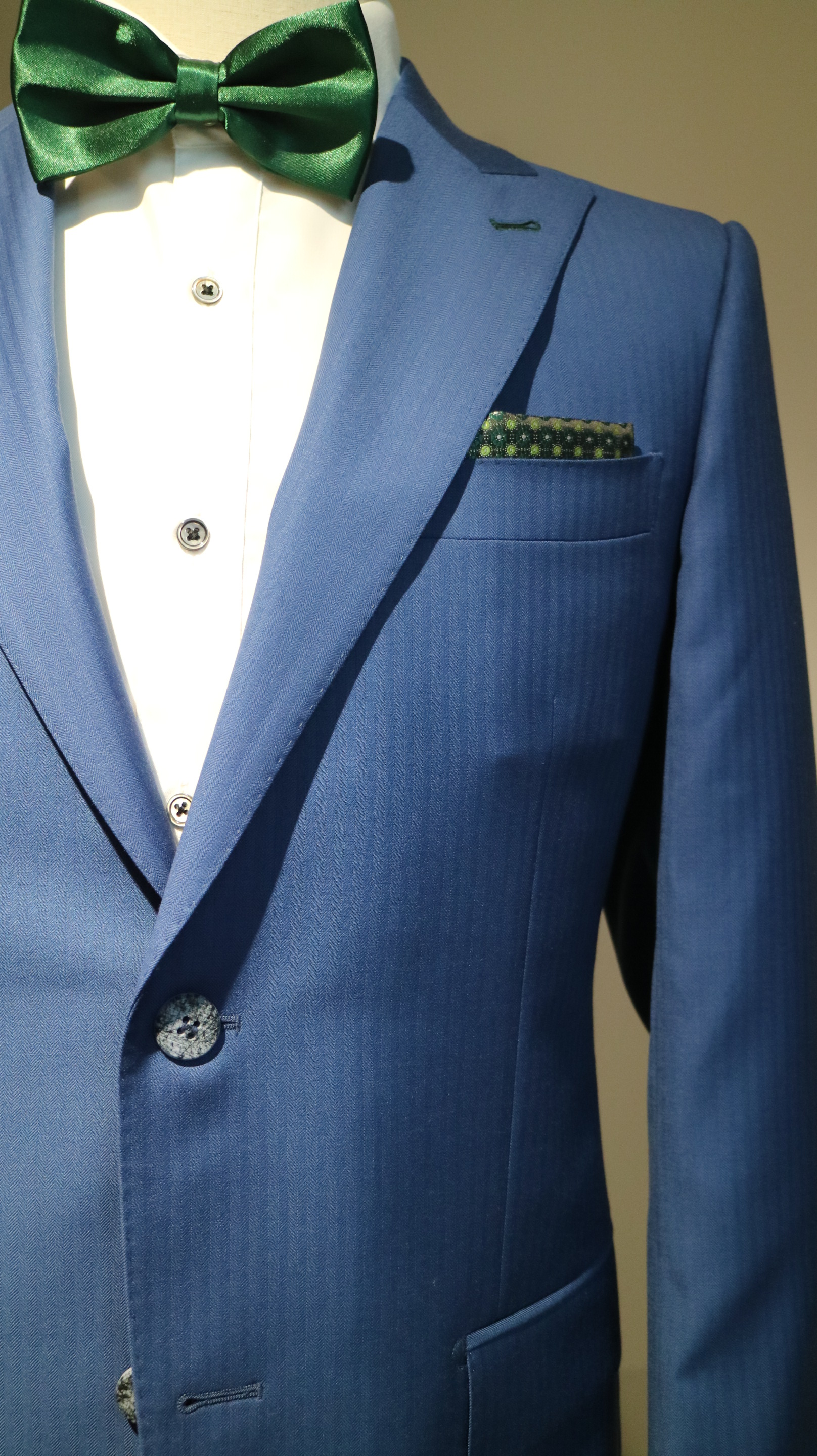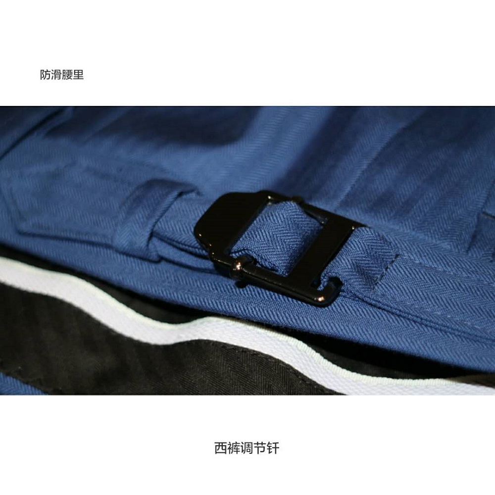 此款西服面料为蓝色暗条纹,具有修身的效果,宽宽的戗驳领型专为顾客量身打造,复古又符合潮流。袖口末粒纽扣的材质拼接设计,打破了西服以往的沉闷感。单排两粒扣,简约且有拉长身型的效果。西服内里的圆形汗托、水滴形笔袋及西服防滑带和调节钎的设计更是人性化的体现,为一般西服无法达到的工艺细节。另外,衬衣袖口的LOGO设计也是别具一格,增添光彩!
