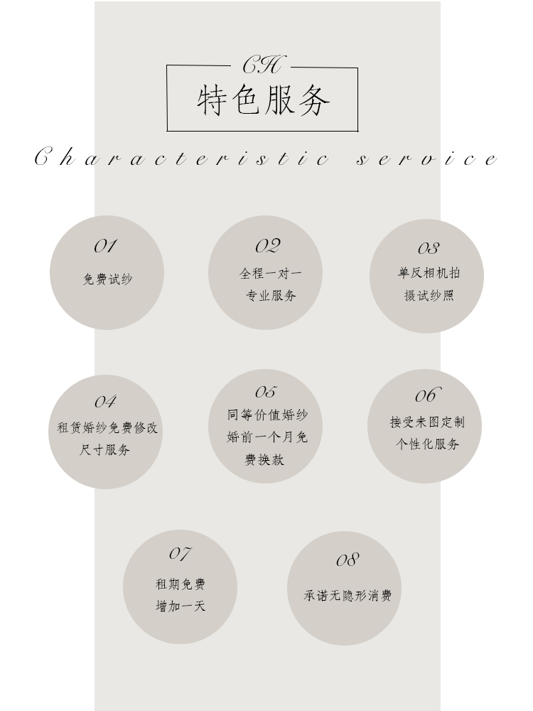1.免费试纱:店内婚纱均可以免费试穿 2.拍照留念:试纱过程中可以拍照留念 3.专属服务:设计师驻店,支持设计修改,支持来图定制