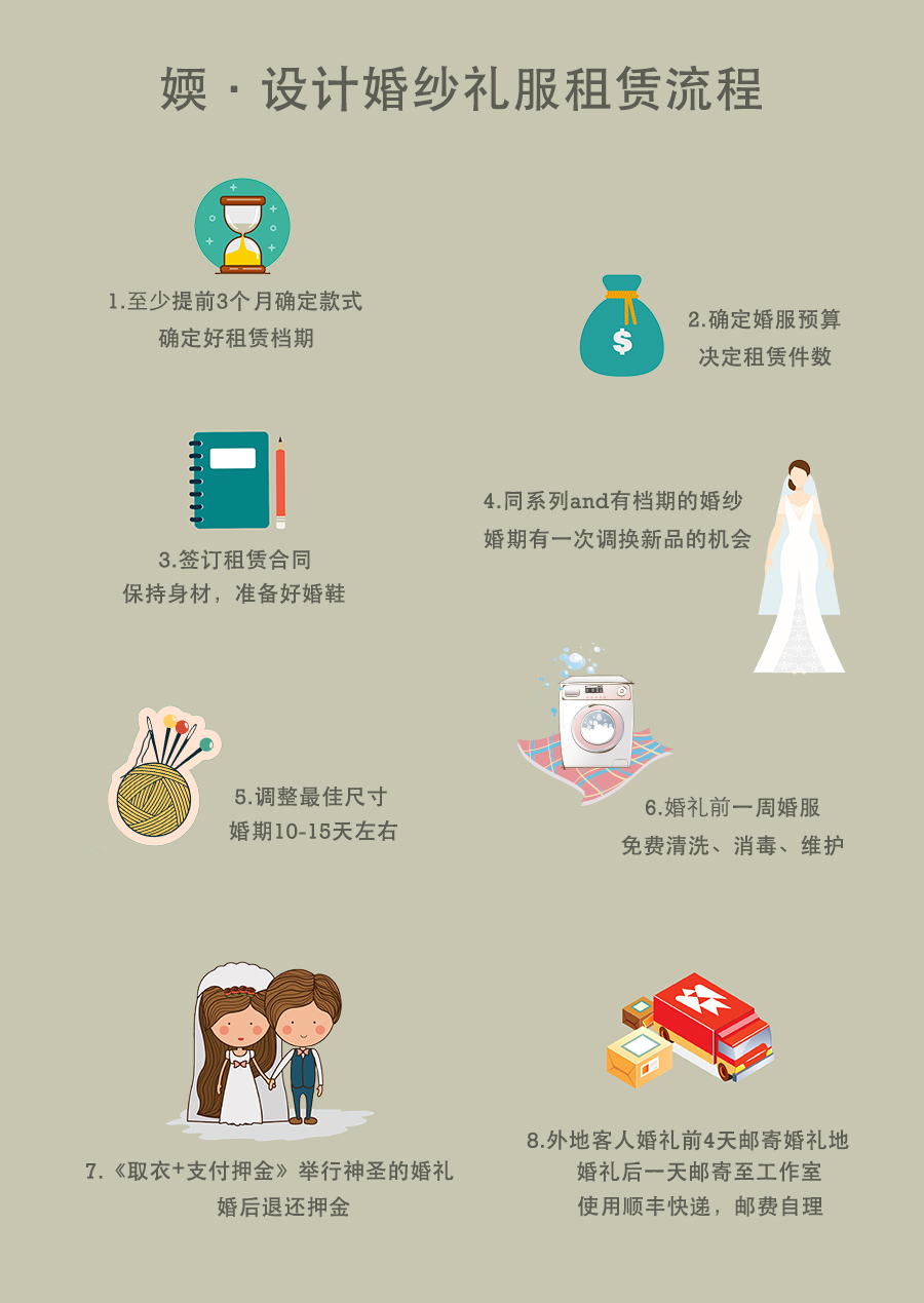 1、婚纱使用前后免费清洗,熨烫 2、婚纱礼服均在婚礼前免费为新娘进行修改尺寸 3、婚期前免费调换新款机会一次