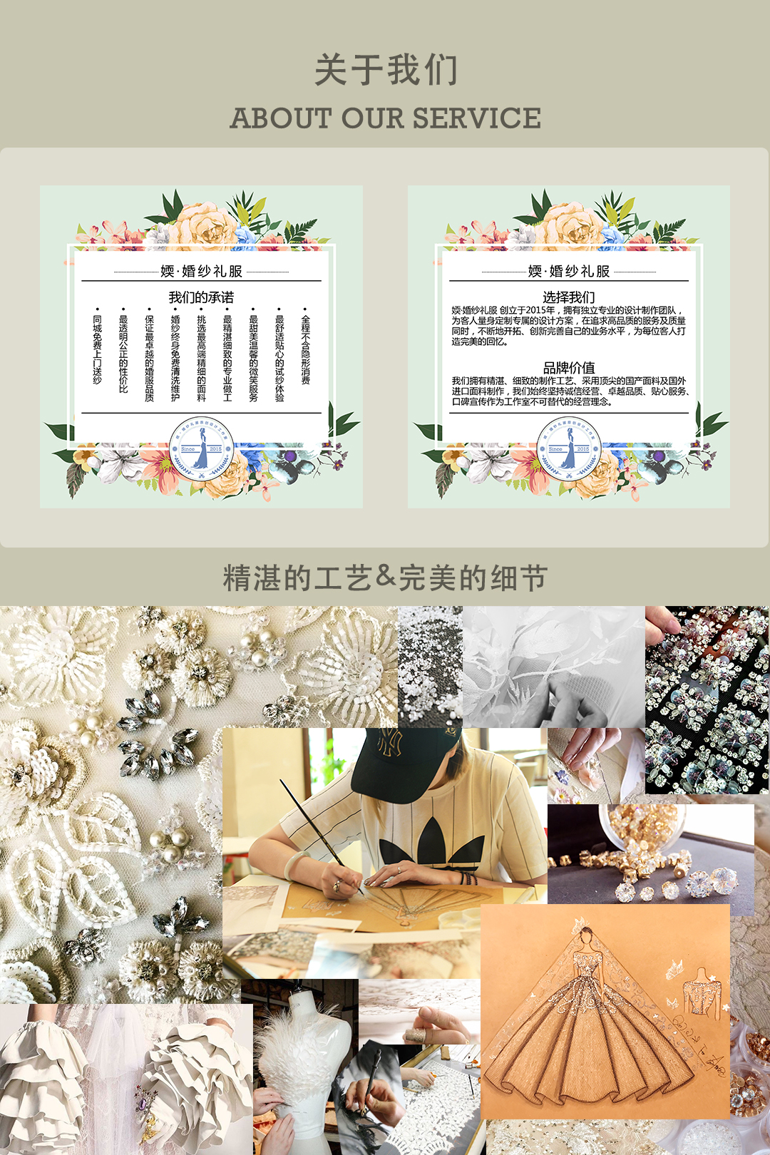 1.免费试纱:专属VIP服务,全成礼服师二对一尊贵服务 2.图片均为工作室实物拍摄,所有款式全部可以定制。 3.接受新娘来图定制,详情可联系工作室。