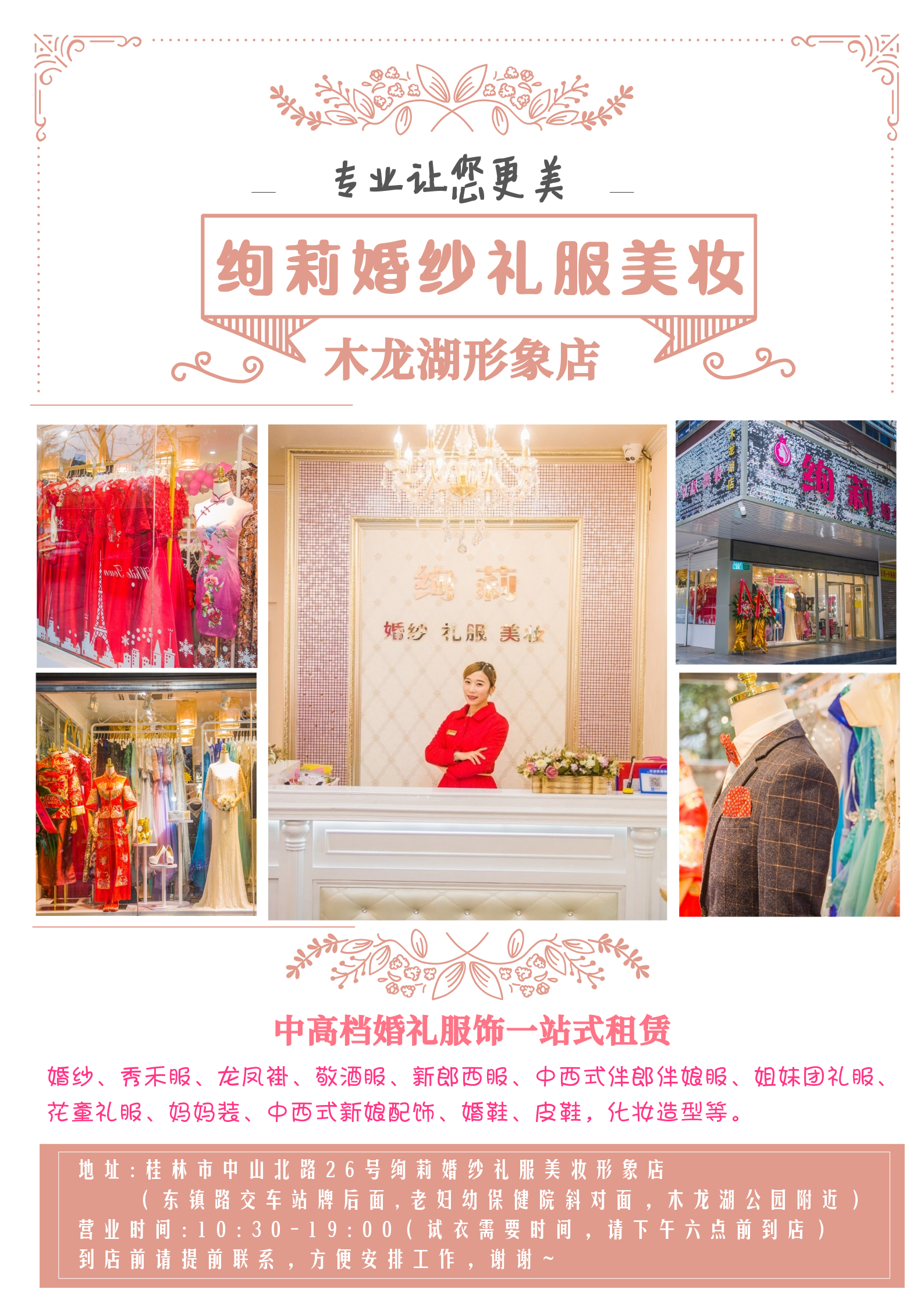 新款婚纱租价:齐地婚纱300-580元;拖尾婚纱480-1280元,含头纱,裙撑。 特价出清婚纱:100-280元出售 更多款式欢迎到店挑选试穿~ 绚莉婚纱礼服美妆馆 【绚莉】是桂林本地一家专门租赁婚纱,礼服,配饰的店。意在为桂林人提供高性价比,高品质服务的婚纱礼服租赁。 [绚莉]品牌创立于2014年,品质老店,专业值得信赖~ 资深婚礼人,【绚莉】品牌创始人莉莉坐镇店铺,专业让您更美! 我们的目标:将【绚莉】打造成桂林婚纱礼服租赁行业的标杆品牌。 经营范围: 婚纱·礼服·配饰租赁 (婚纱、秀禾服、敬酒服、主持礼服、宴会礼服、伴娘服、妈妈装、男士礼服、童装礼服配饰、礼仪服、旗袍、头饰、披肩、领结、皮鞋、高跟鞋、宴会手包等) 店内服装干净整洁,郑重承诺:租一次,洗一次,熨一次,您可放心穿着。价格实惠,租赁时间自由,欢迎到店观摩试衣! 化妆造型 (新娘妆,伴娘妆,妈妈妆,主持妆,宴会妆,舞台妆,摄影妆等) 专业化妆师精心描绘专属于您的精致妆容,所用化妆品为国内一线专业彩妆品牌,清透服帖,不伤肤,上色佳。 一站式婚礼,宴会整体造型专家,专业让您更美! 到店试衣前务必提前咨询预约。 咨询时,请告知想要租的服饰,以及婚期。 因为是实体店,每天要接待很多客人,以及处理店铺事宜,所以回复会没那么快,看到后会及时回复。 另外,服装款式很多,尺码不同,款式也会不断上新,所以本店不发图。 亲们可以预约到店挑选试衣,专业礼服师会根据您的身材气质甄选合适的服饰。 人少时,一对一服务,无时长限制。 人多时,需要交叉\排队试衣,请耐心等待。 店铺不间断会有优惠活动,具体到店详聊。