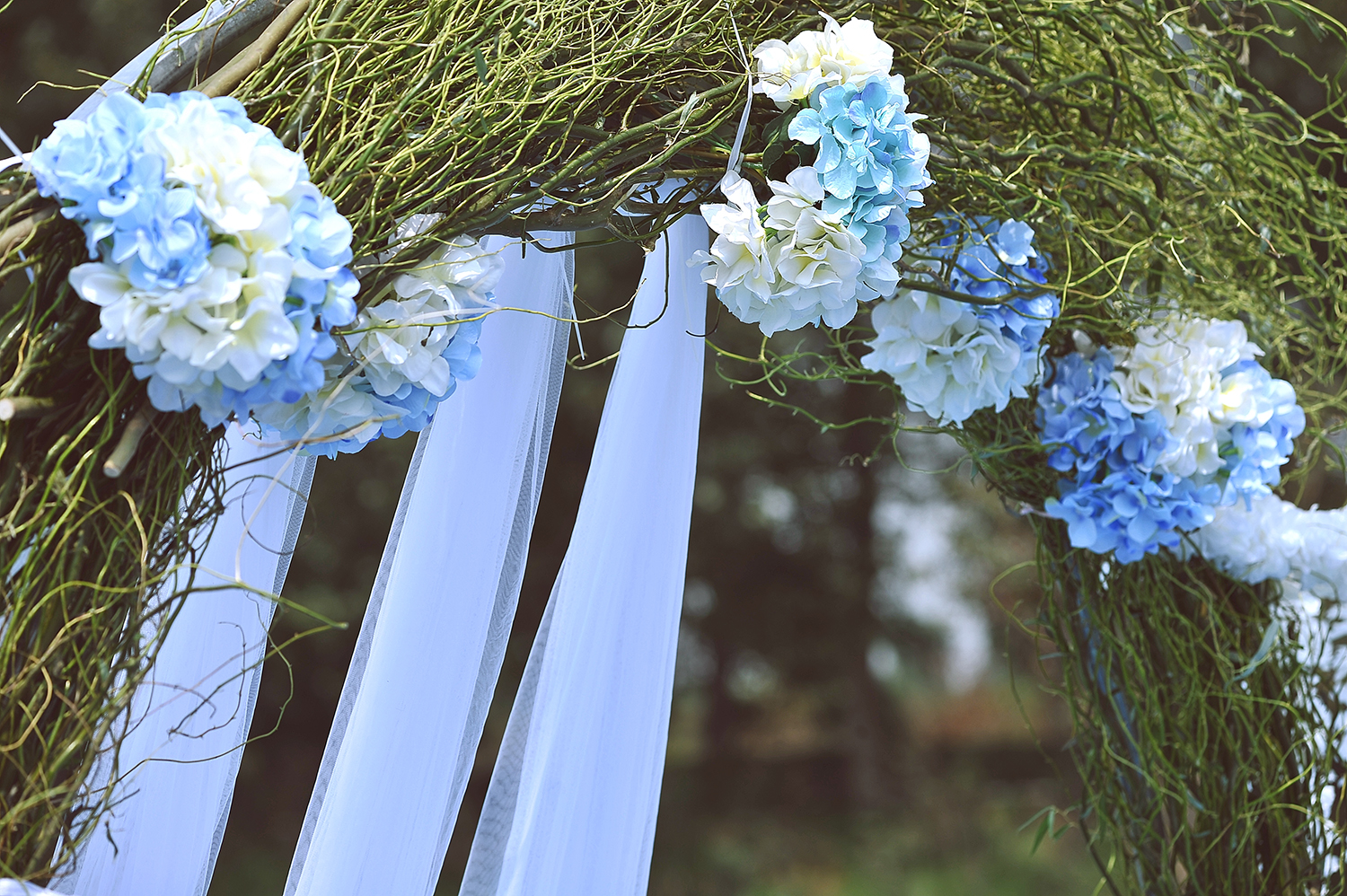 绢花半拱门2个 绢花造型装饰3套 龙柳圆形造型1套 氦飘气球60个 路引2套