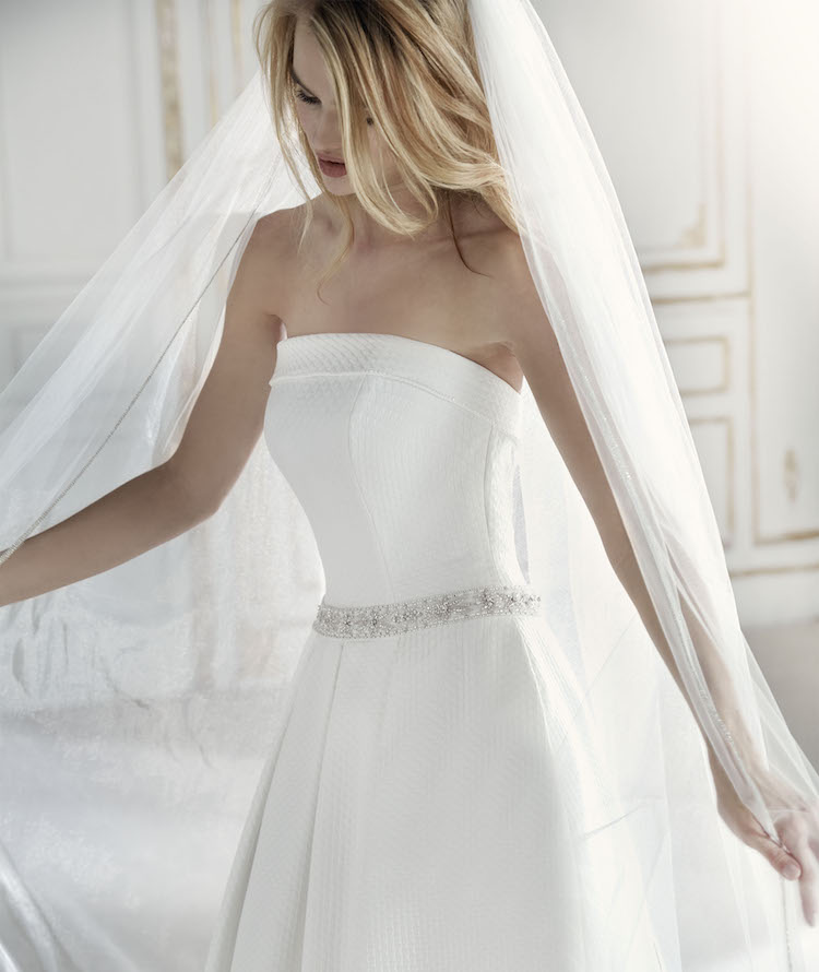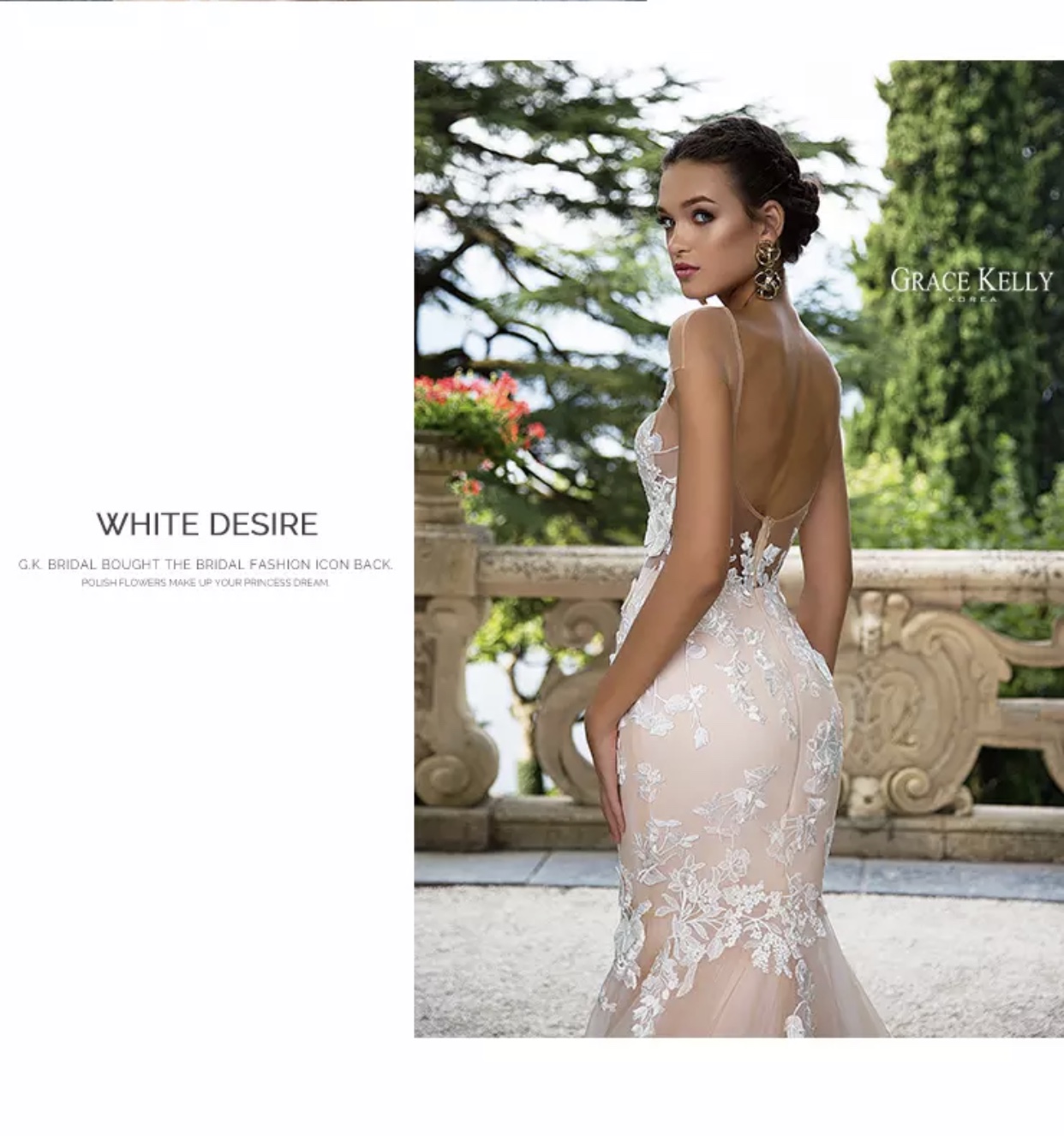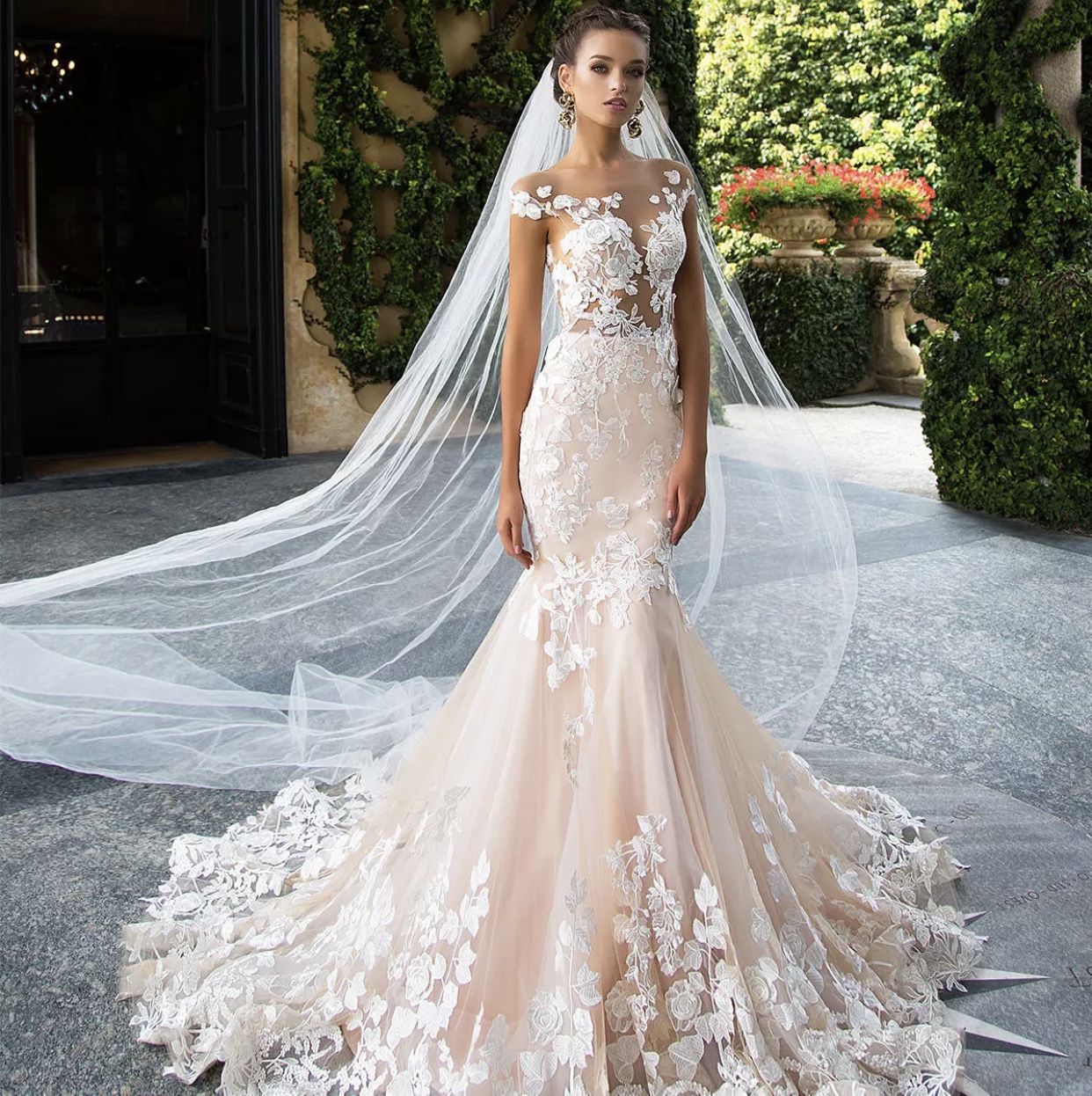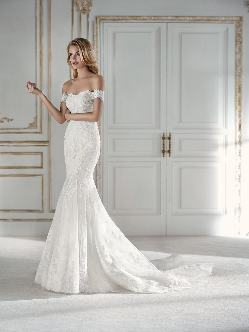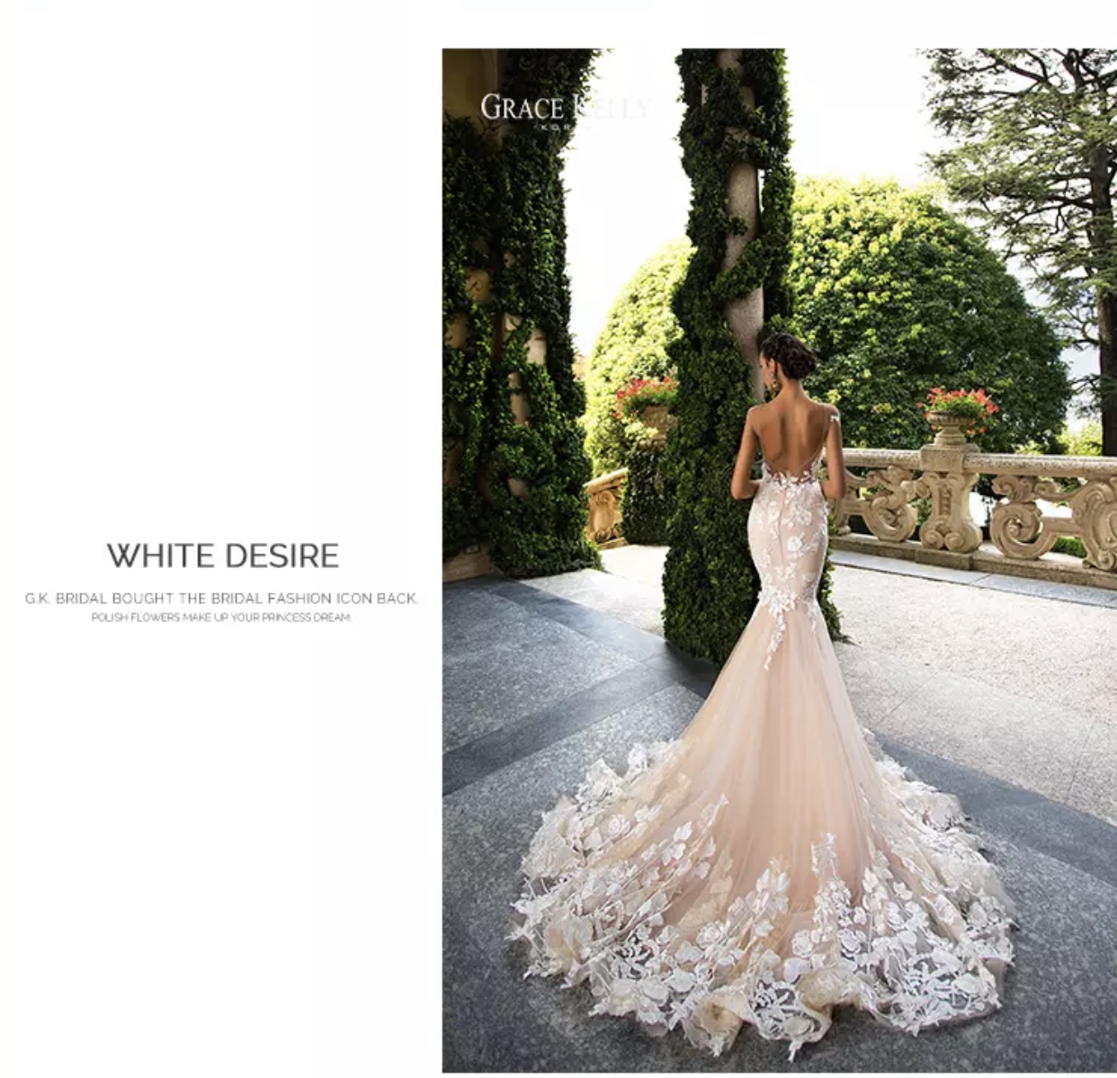 此款婚纱鱼尾裙,凸显女性的优雅线条,恰到好处的裁剪可显示新娘的修长体形,是纤细的腰肢与撑起的胯部形成对比。对于身材比例和曲线较好的新娘是个展现身材的好机会。