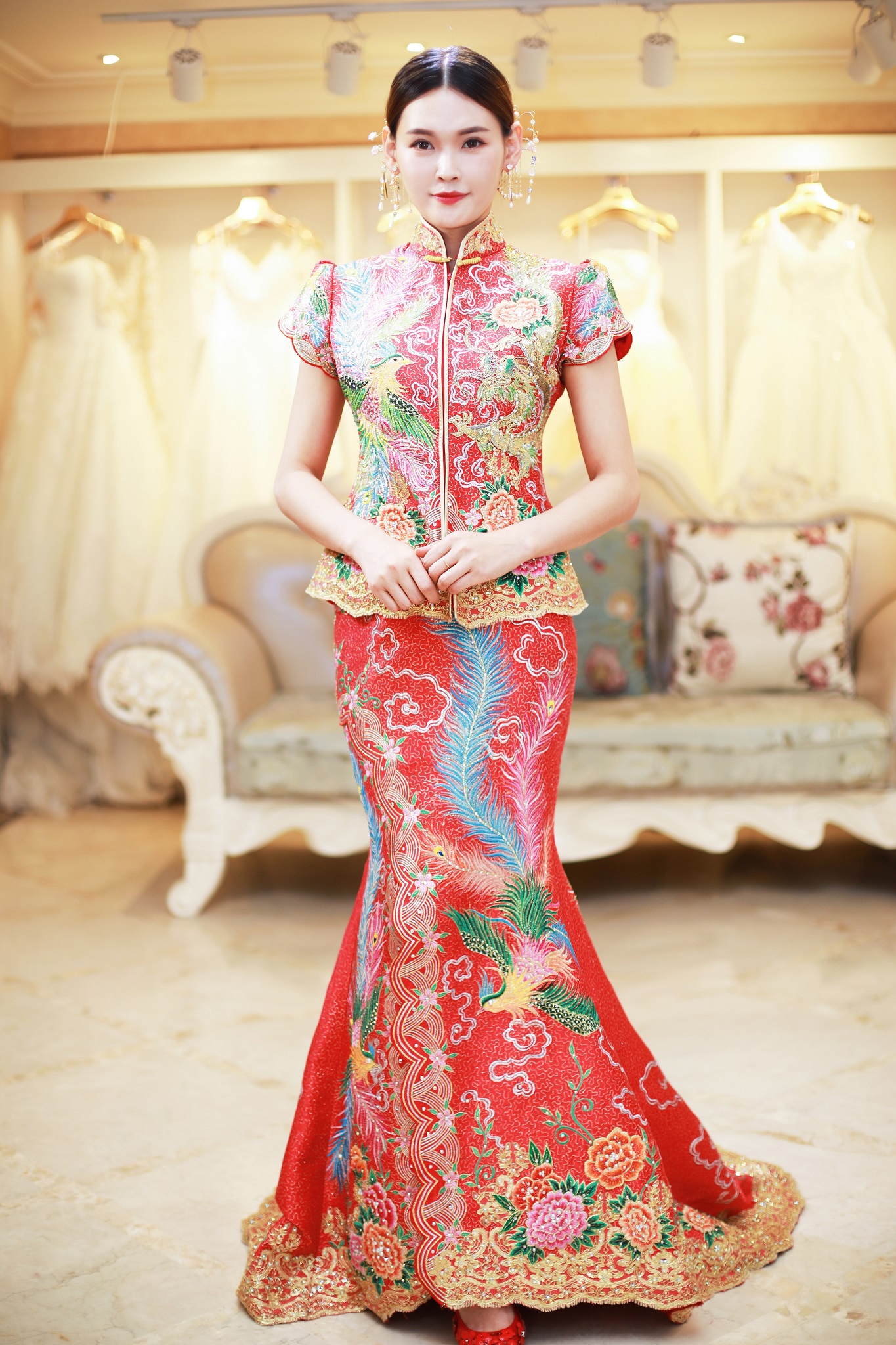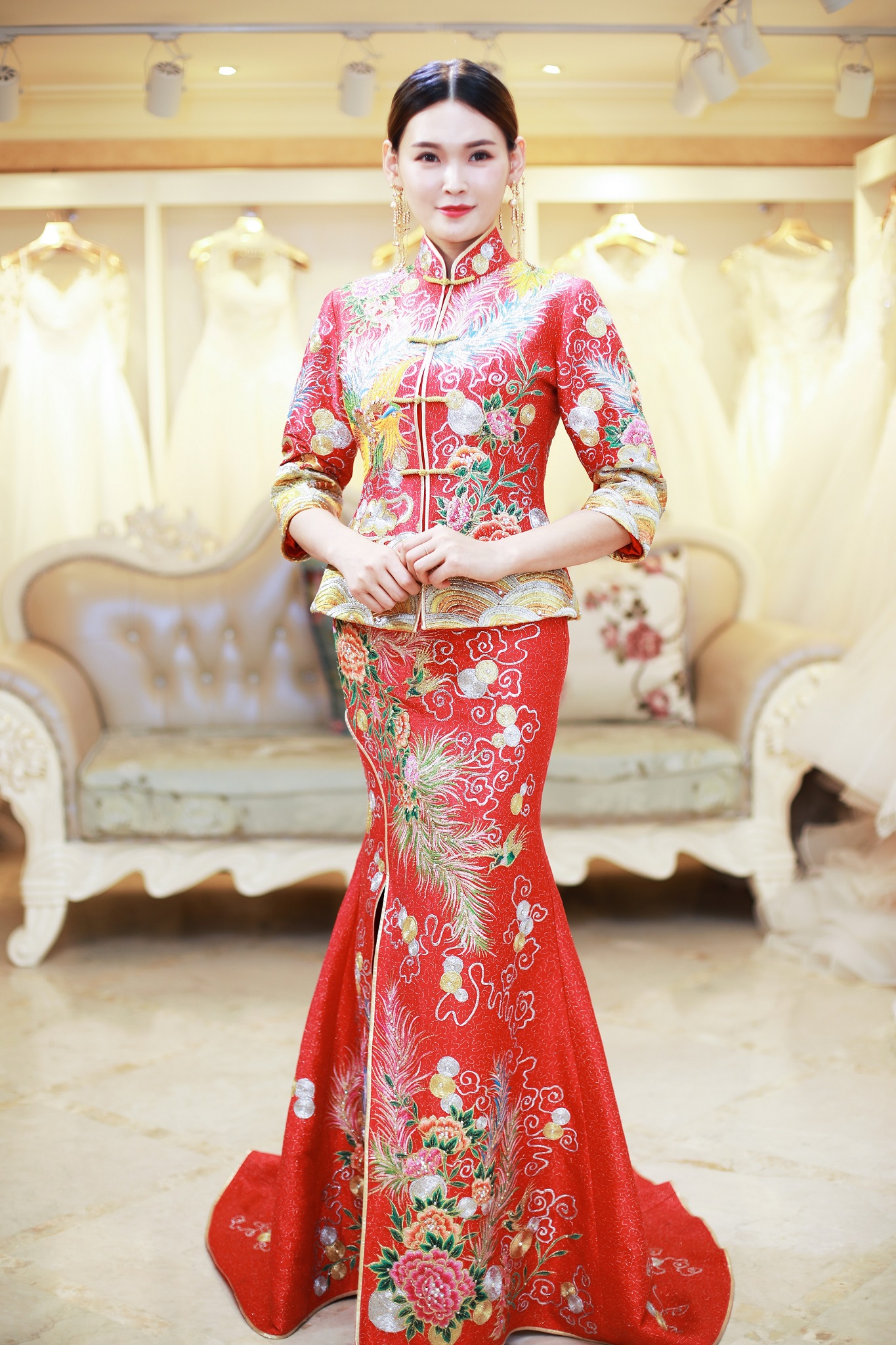 套餐包括: 1.婚礼主仪式纱一件 2.出门龙凤褂一件(或秀禾服) 3.婚礼敬酒服一件 4.伴娘服两件