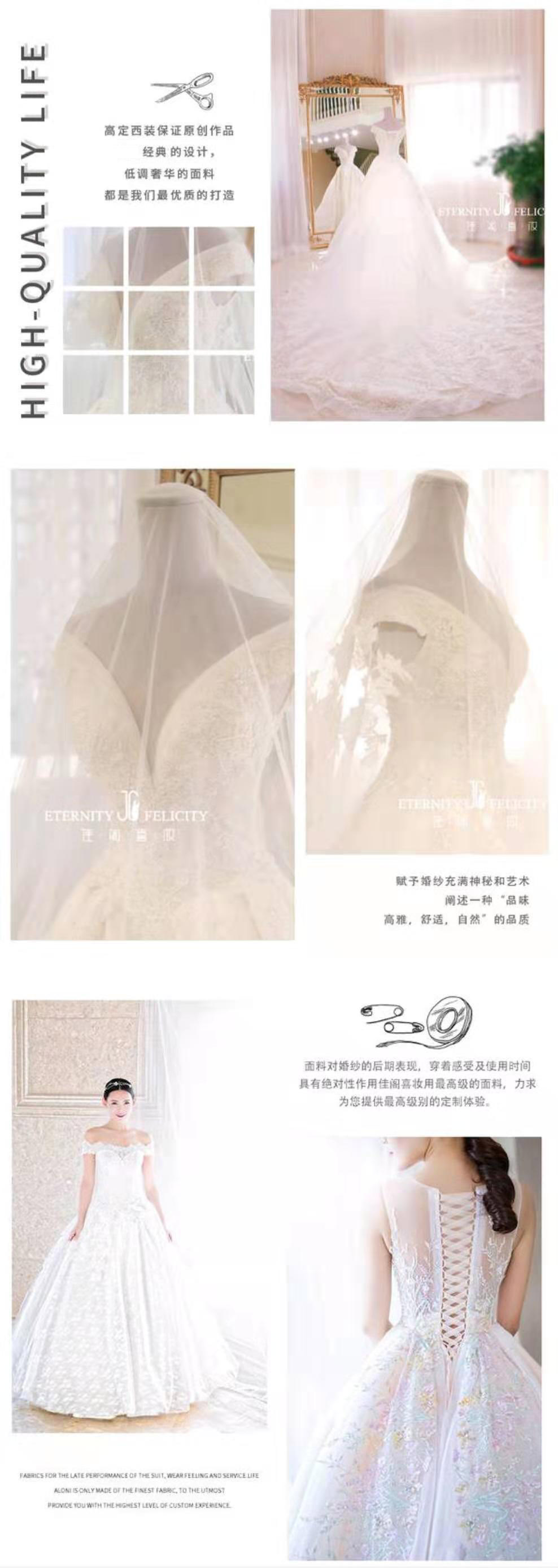 全程试纱约2个小时,有2-3名店员服务一位新娘,店里试纱配备饰品,隐形文胸贴(可自带),为了达到试纱体验效果会在试纱前给新娘画一个淡妆,简单的造型,约10-15分钟,如有近视建议佩戴隐形眼镜