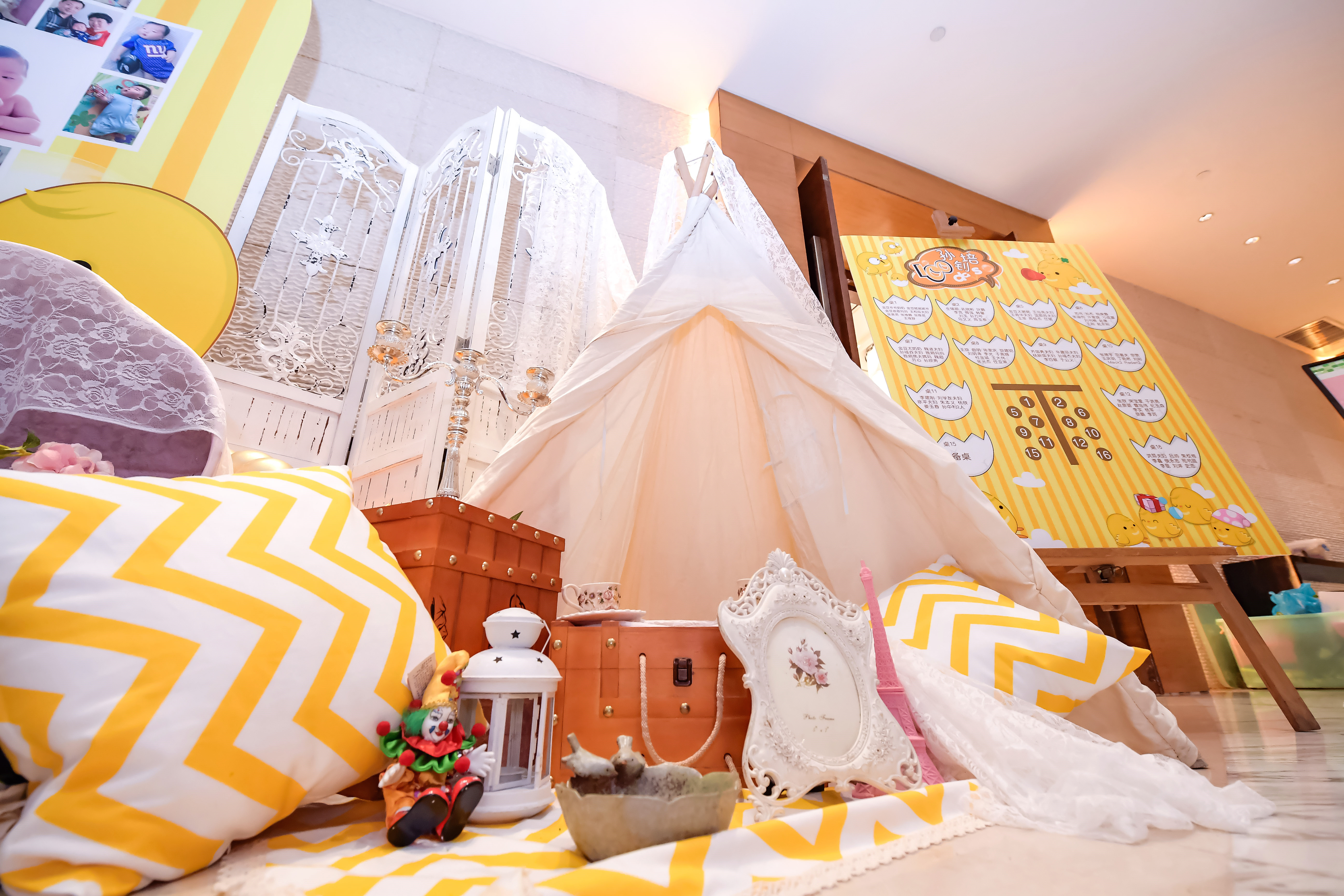 签到区背景搭建 签到桌摆台 签到区道具装饰 嘉宾座次表背景搭建 引导牌制作 展示区背景搭建 展示区背景平面设计 展示区道具装饰 宝宝宴主题logo设计 主题定制礼金箱