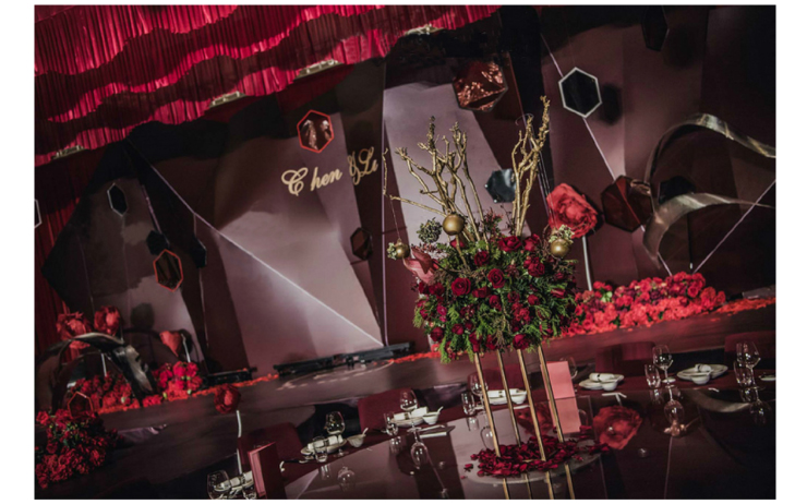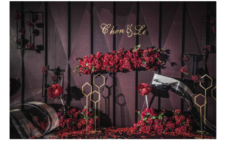 主题定制道具与花艺的结合,为婚礼场地布置的设计注入更加鲜活的生命力。