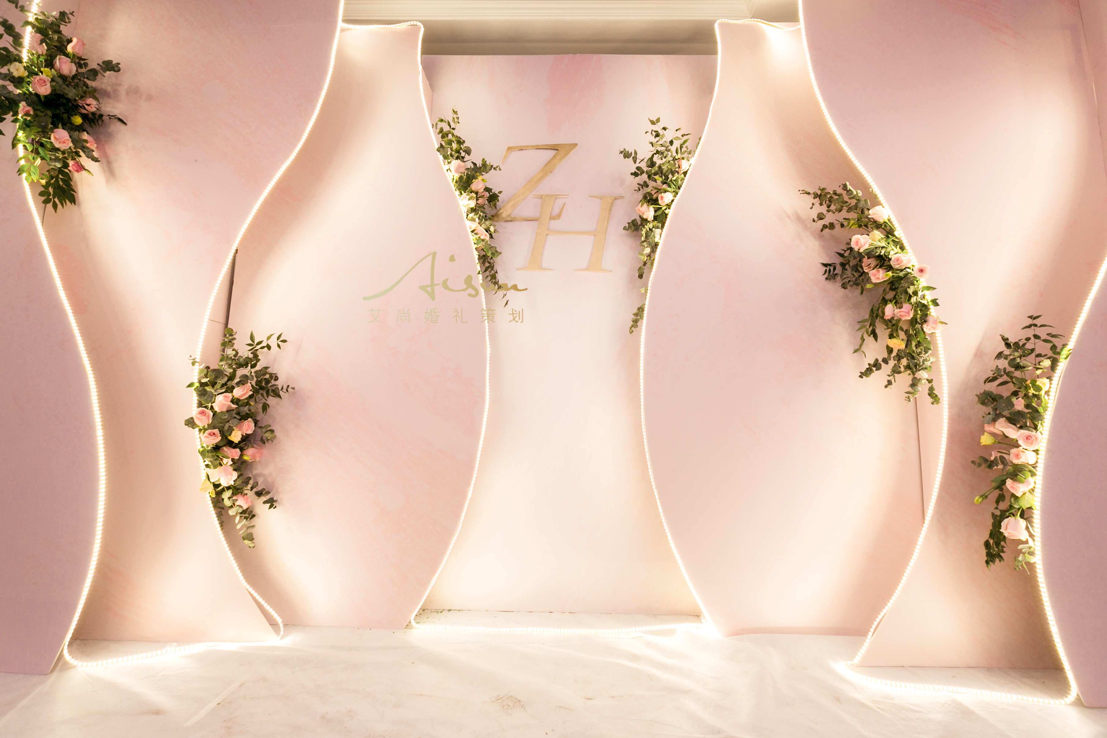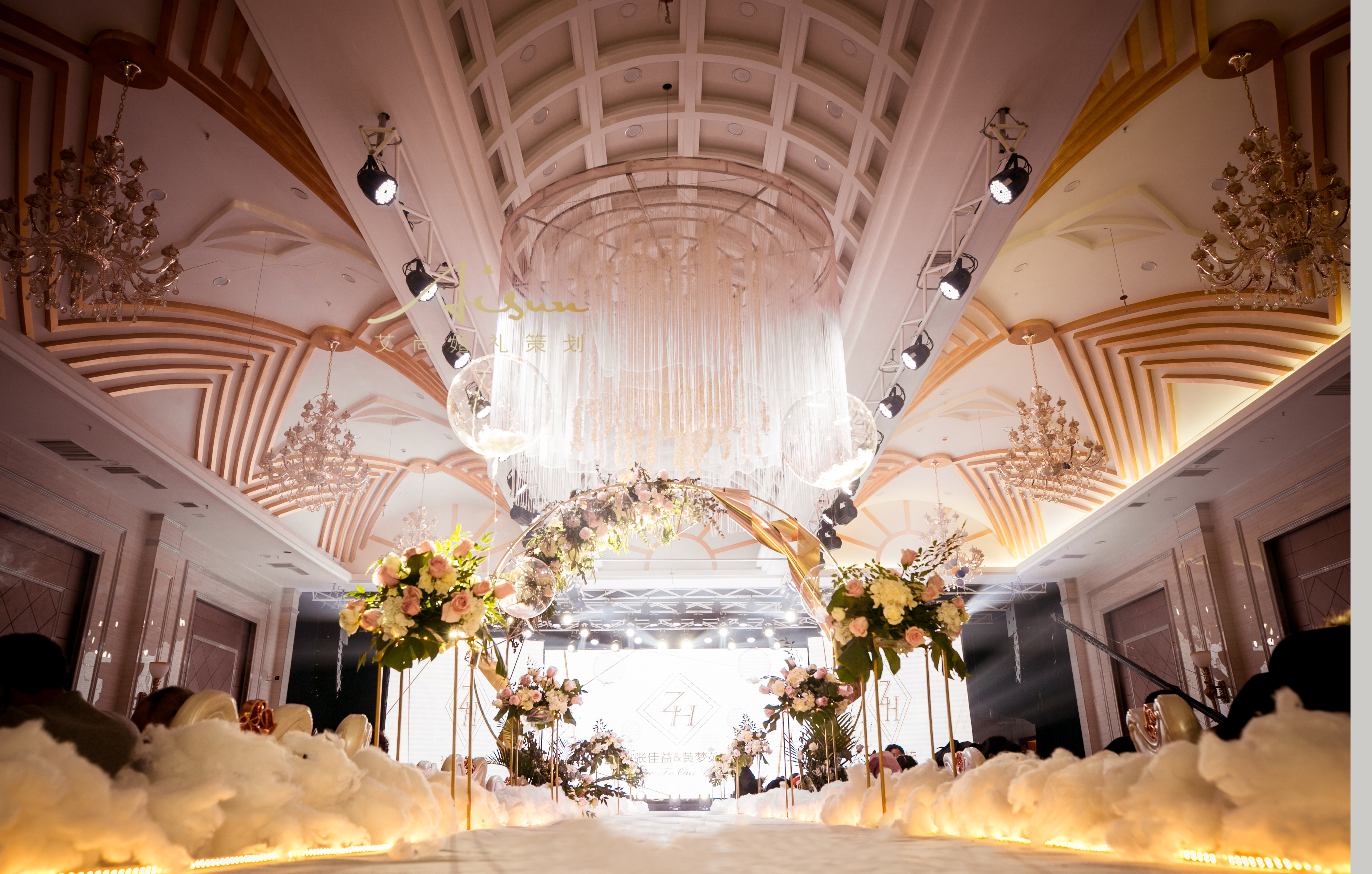 主通道路引10个 花艺拱门 舞台白地毯 椅背丝带300个