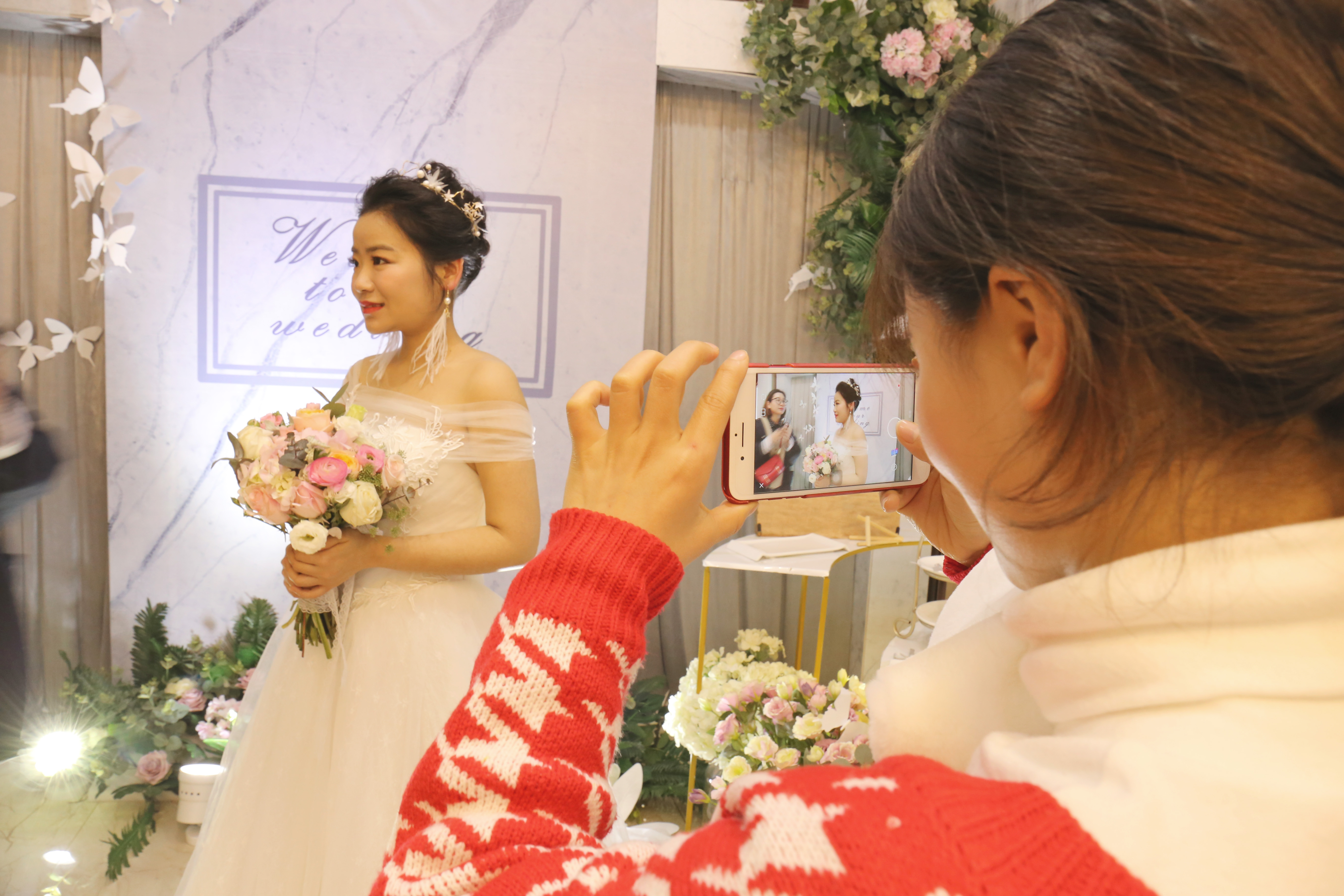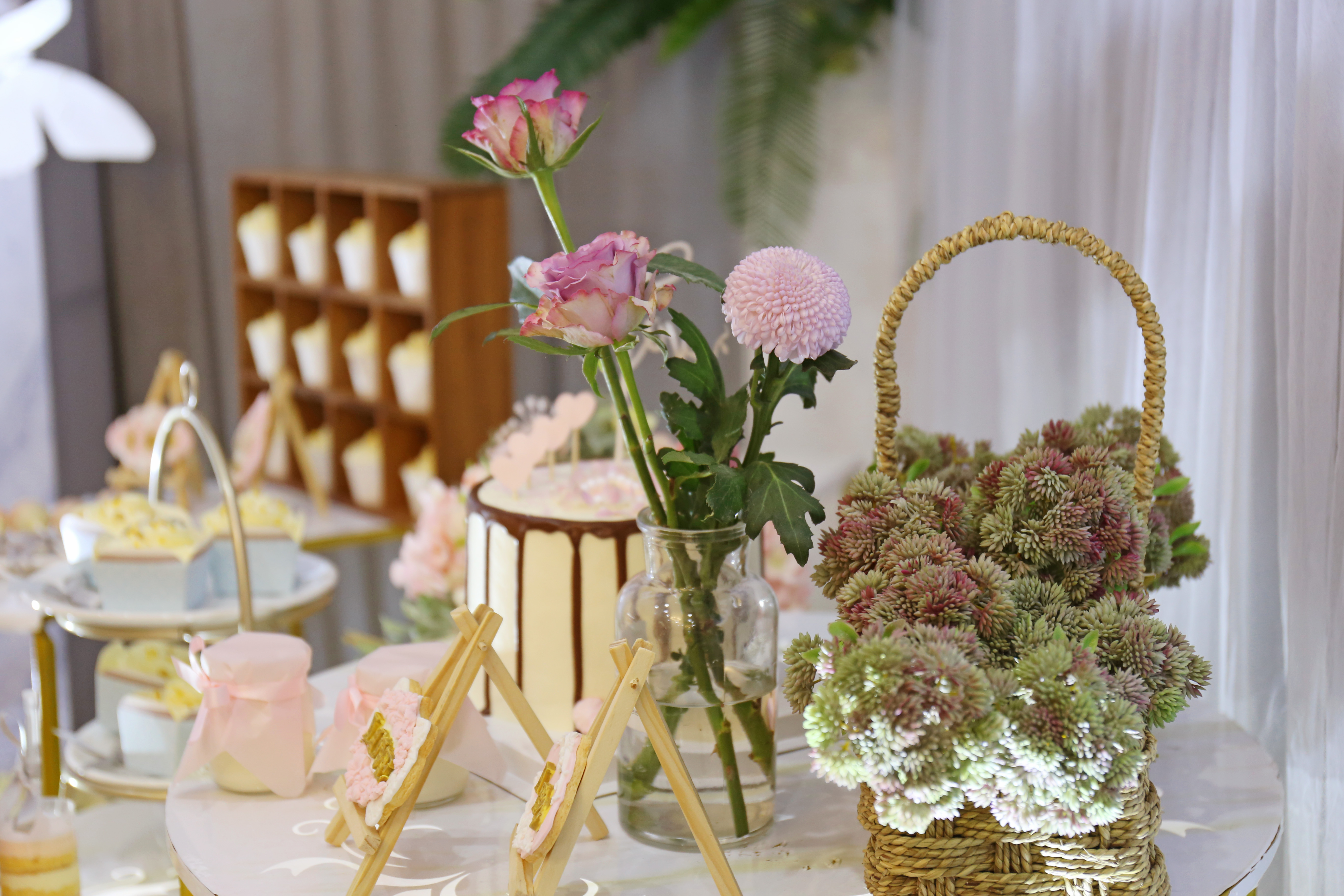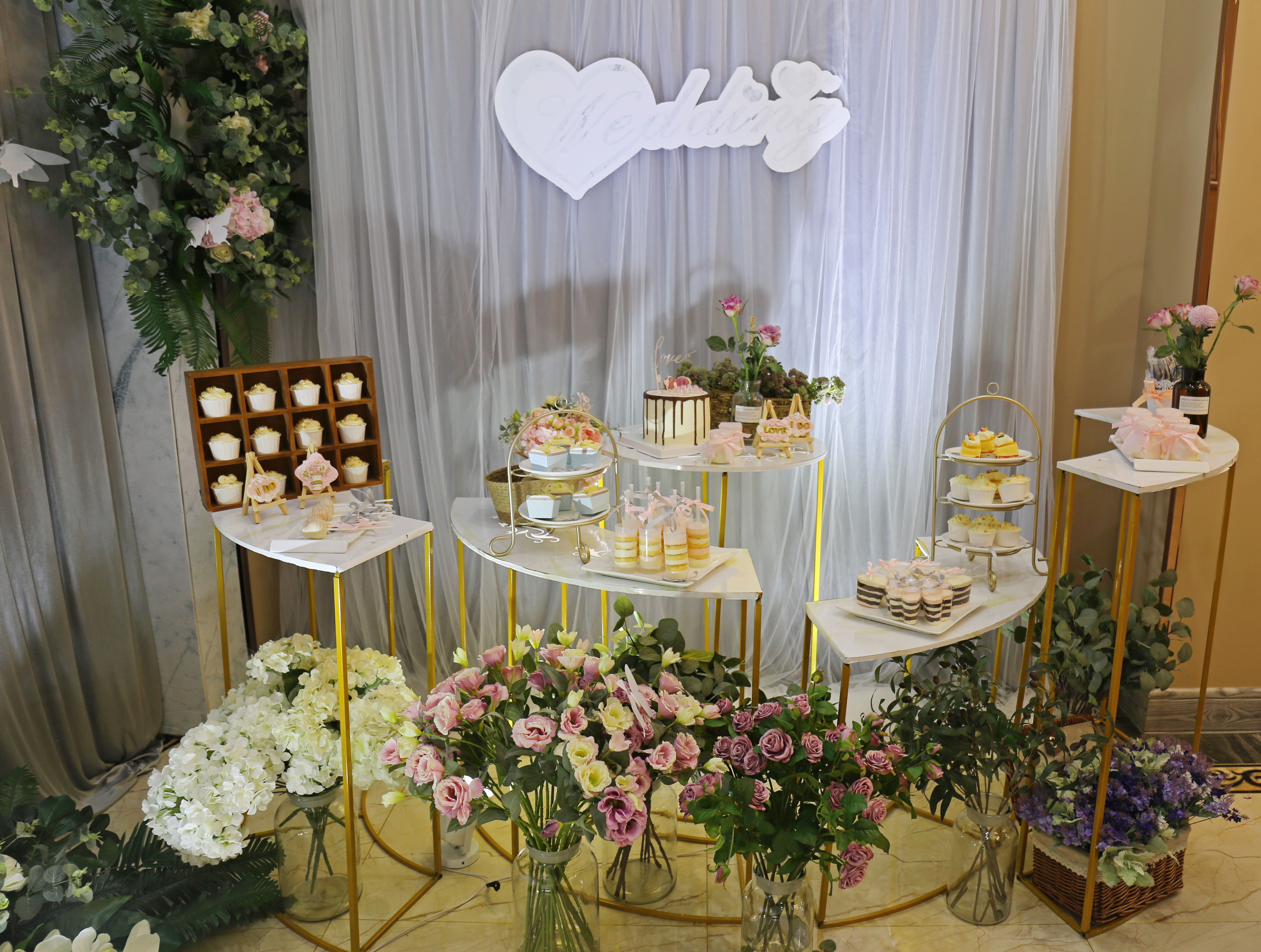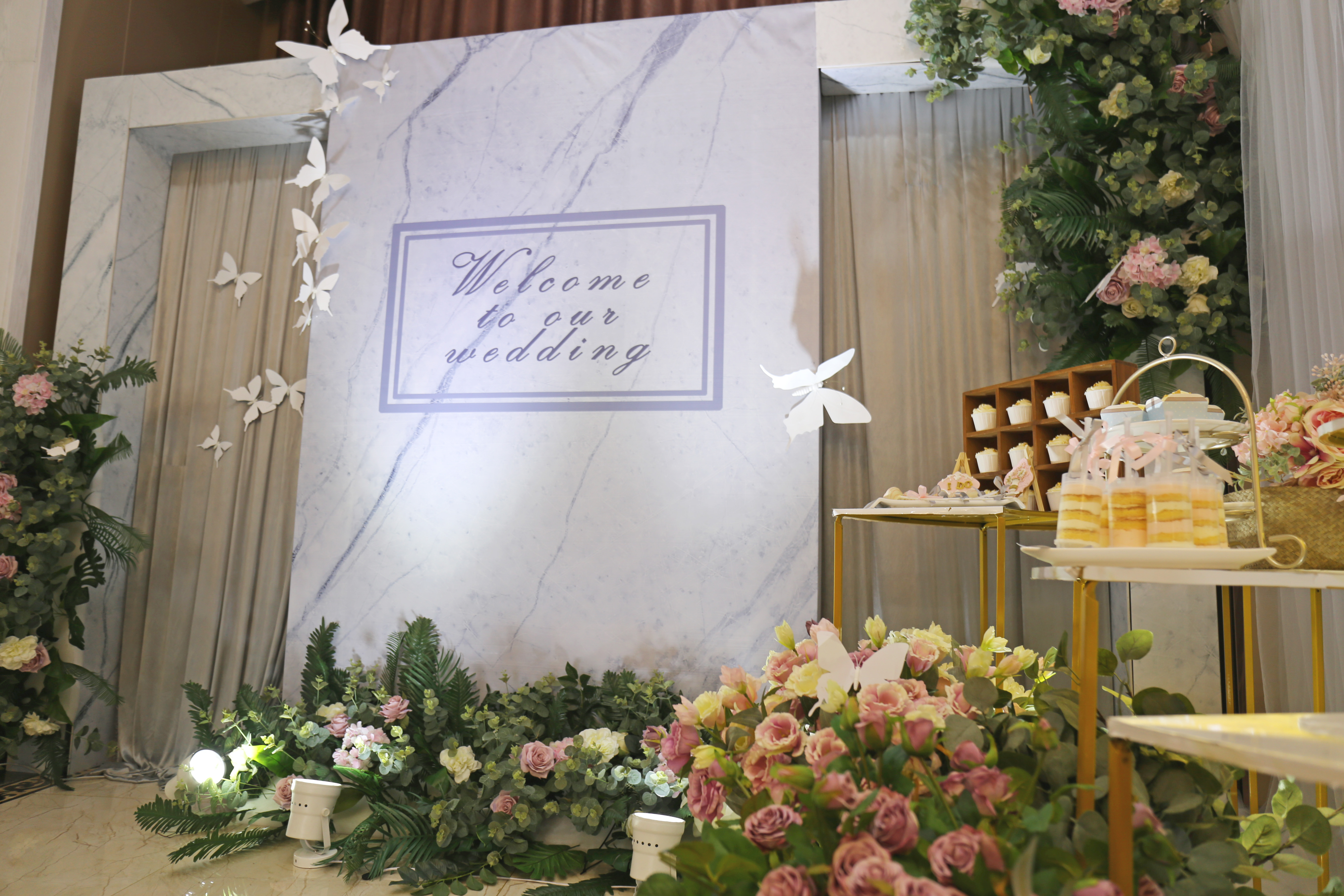 L型迎宾区与甜品区结合 喷绘与灰色帷幔的结合 大量的仿真花装饰 加上飞舞其间的蝴蝶 整个空间清新灵动