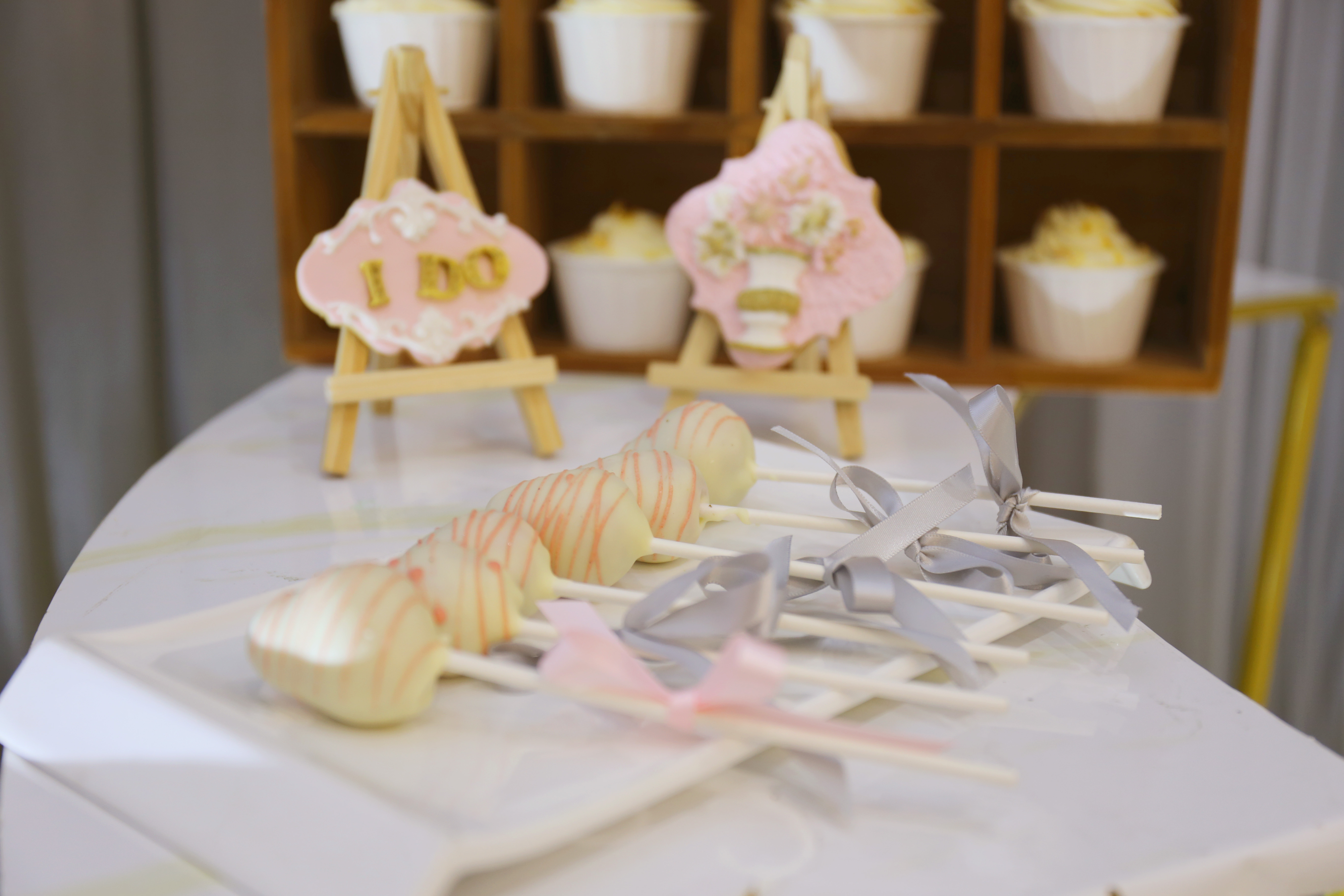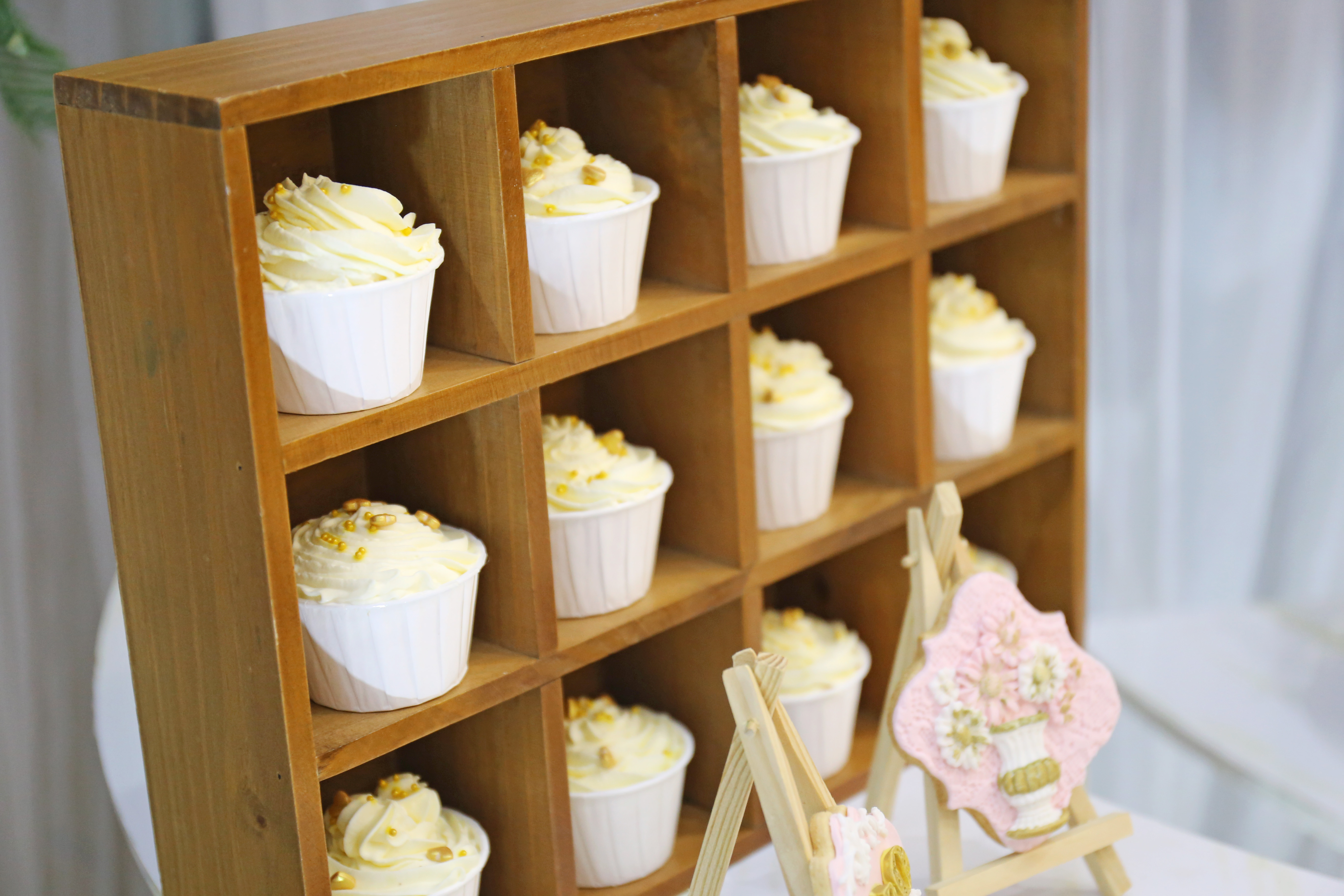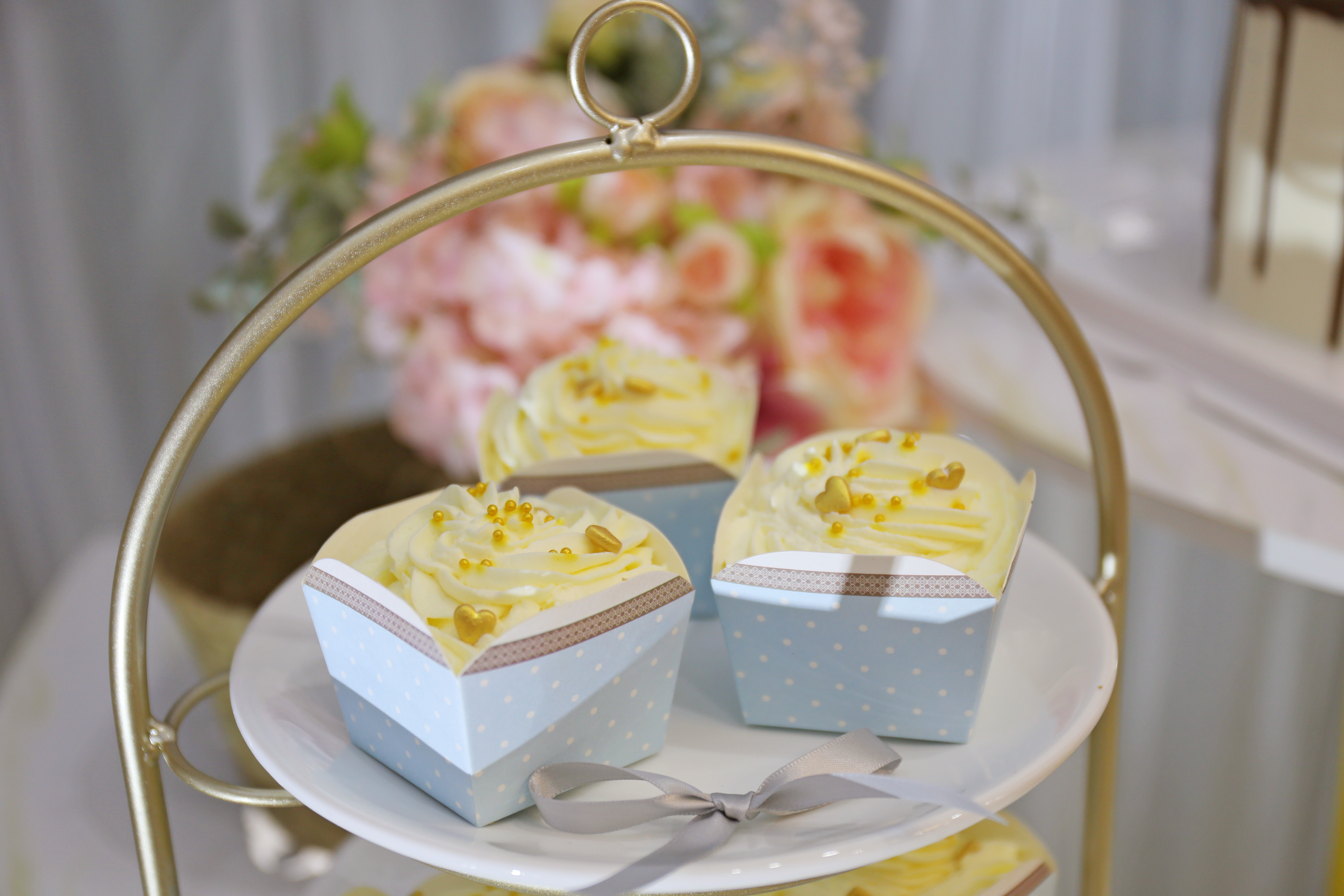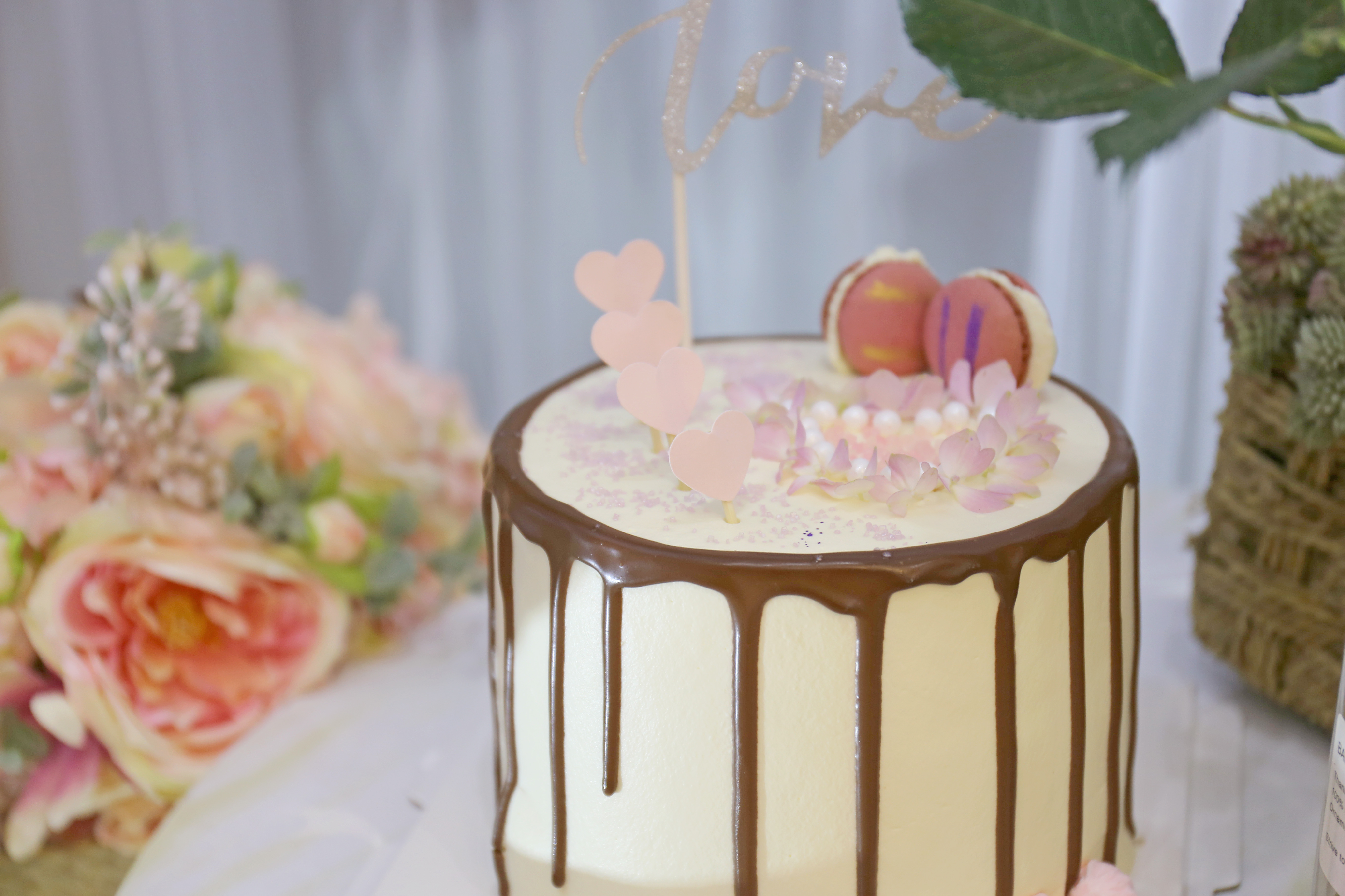 L型迎宾区与甜品区结合 喷绘与灰色帷幔的结合 大量的仿真花装饰 加上飞舞其间的蝴蝶 整个空间清新灵动