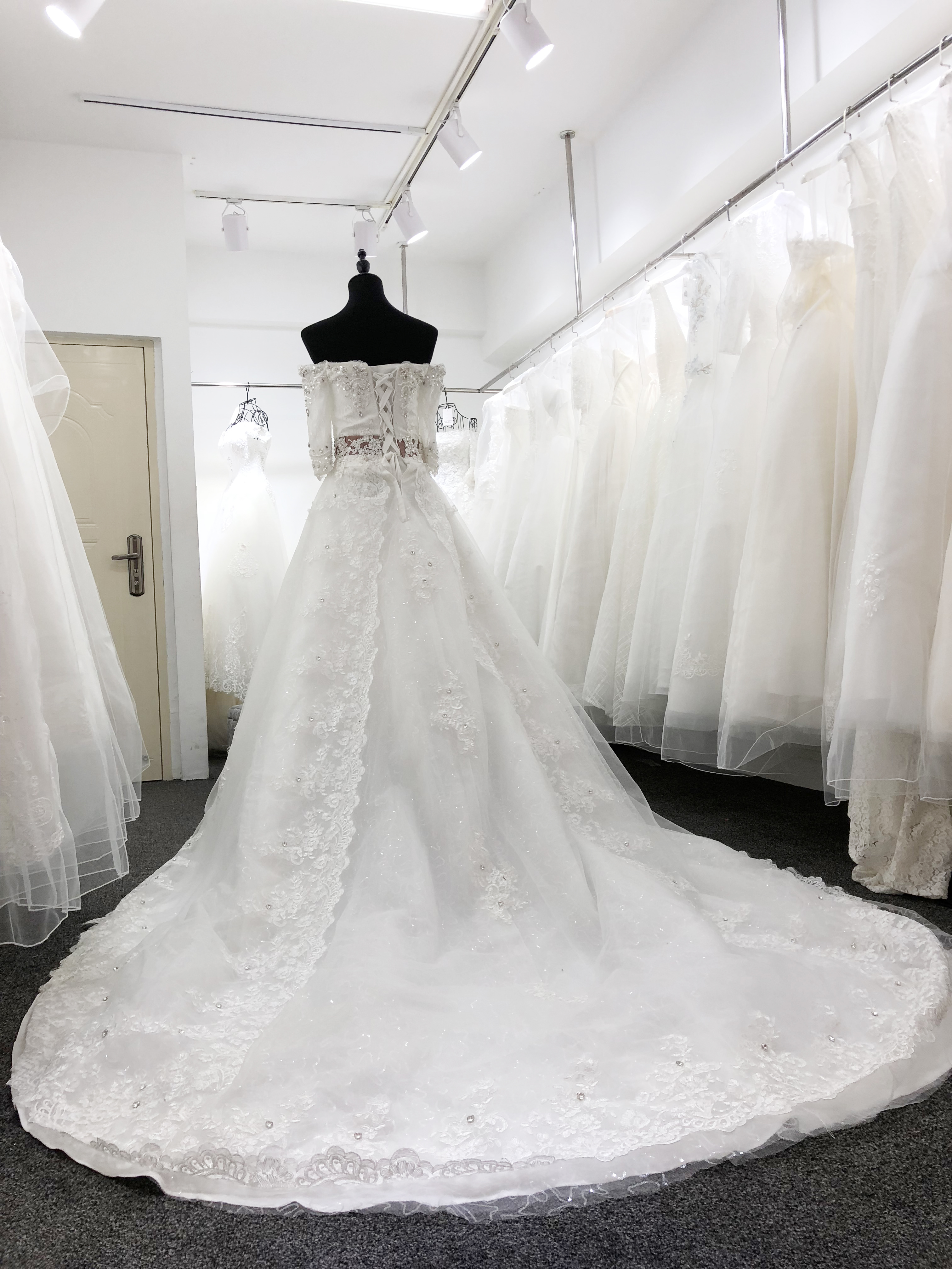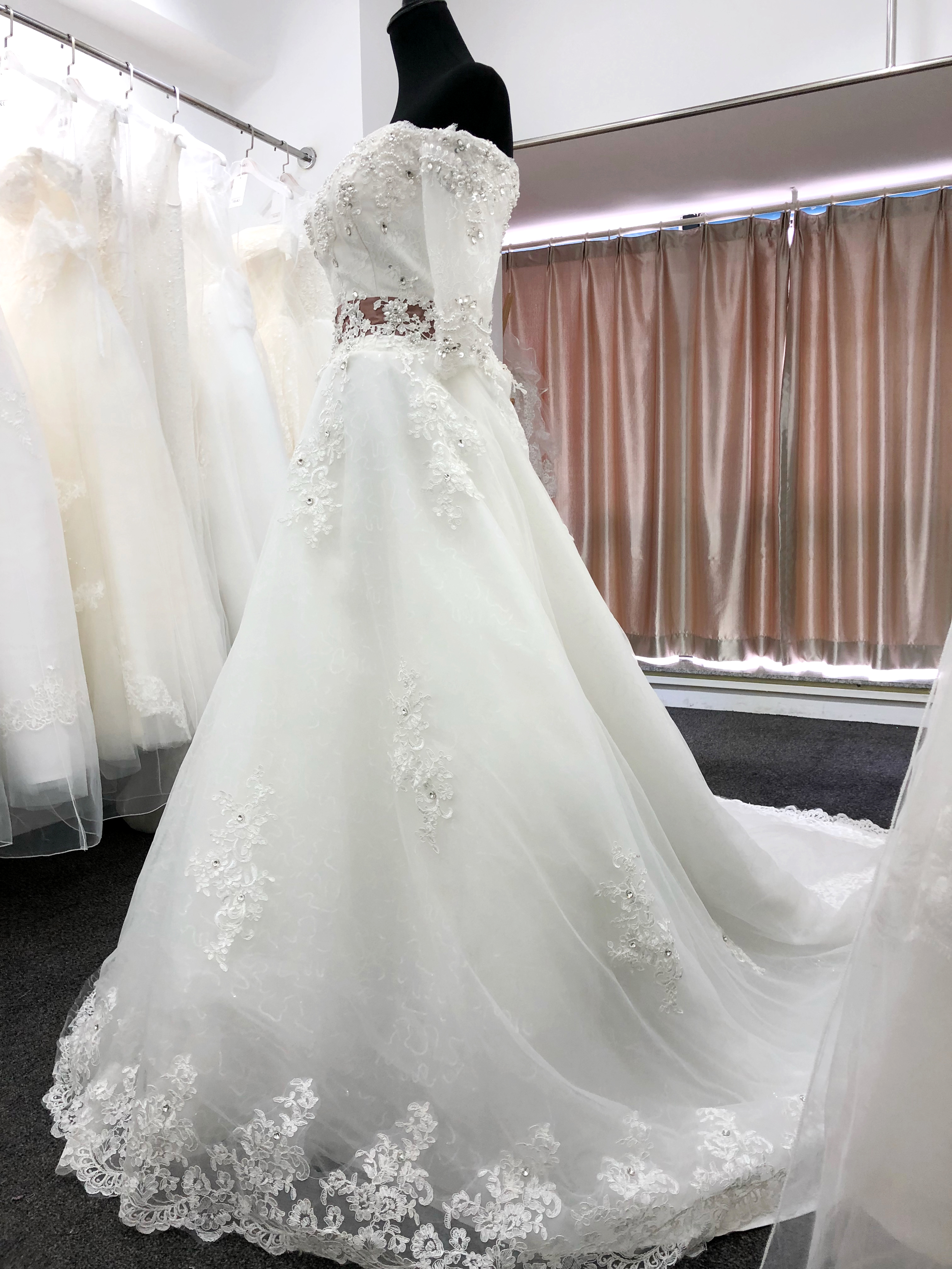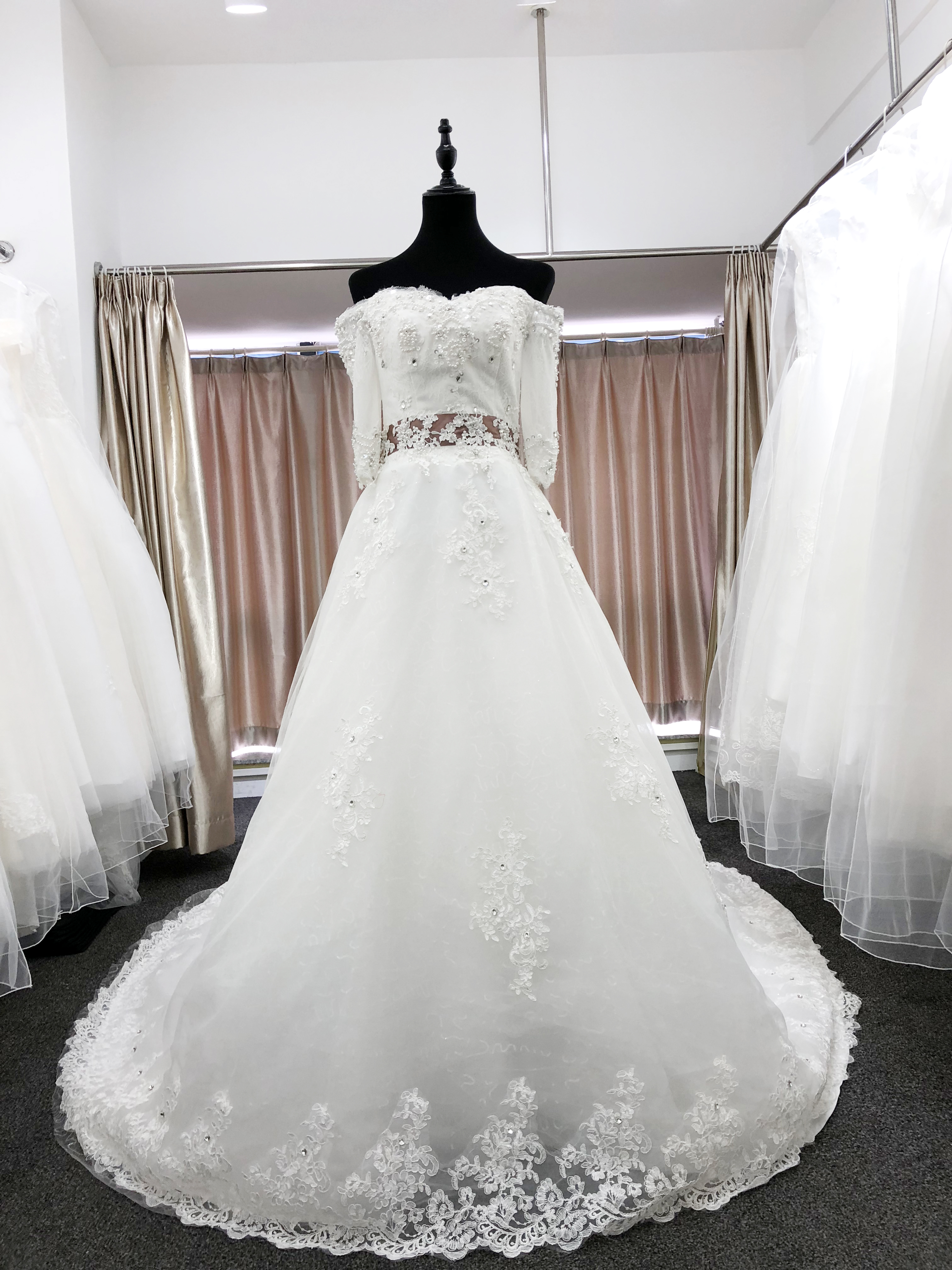 【超值租赁】长袖一字肩大拖尾婚纱