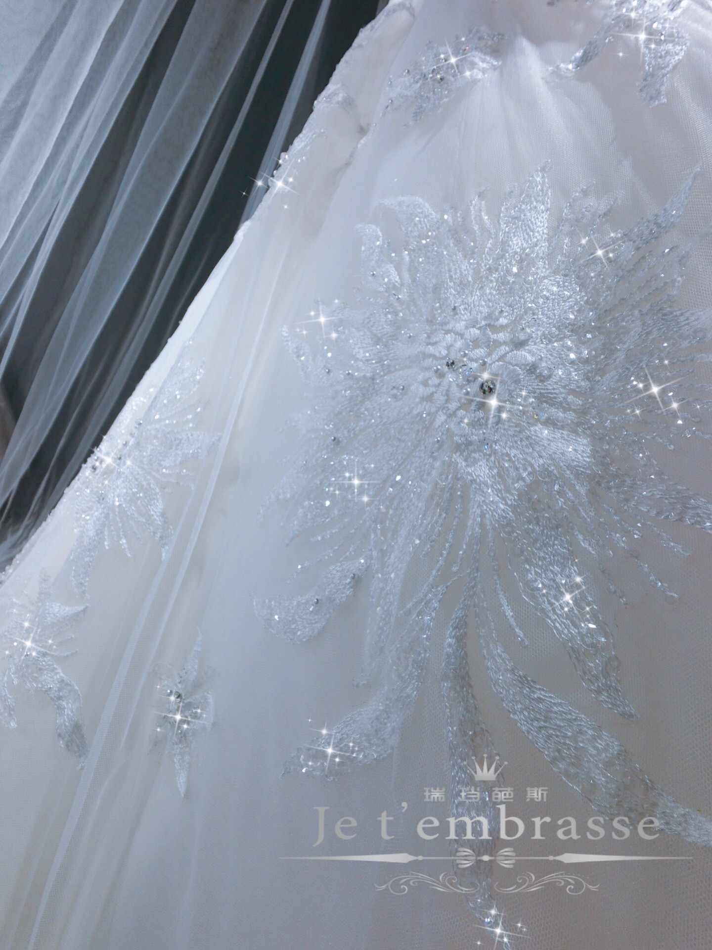 层层叠叠轻纱弥漫,点缀着蕾丝织成的精致花朵和璀璨的宝石,仿佛与生俱来的高贵气质,告诉世人真挚爱情的神圣不可侵犯