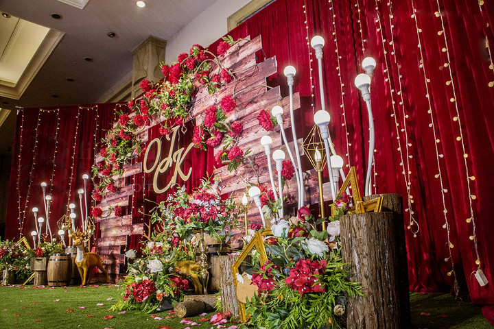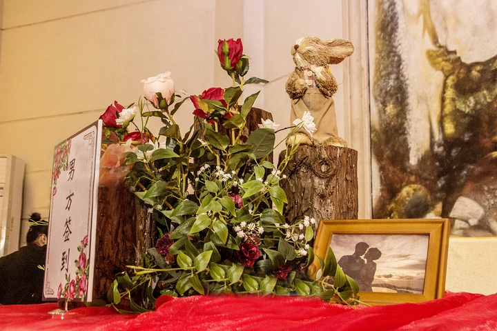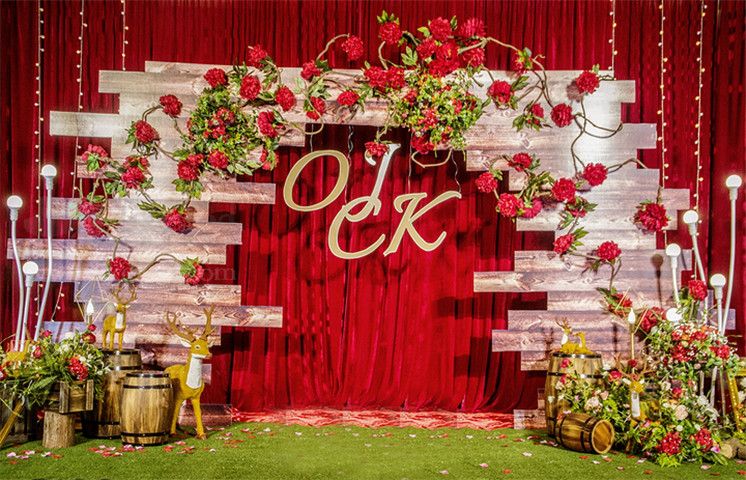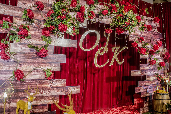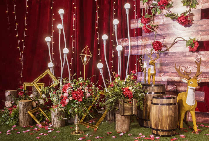 白色背景布缦+红色花艺。 精美白色签到桌布,多色可选,4~5处精致鲜花花艺。