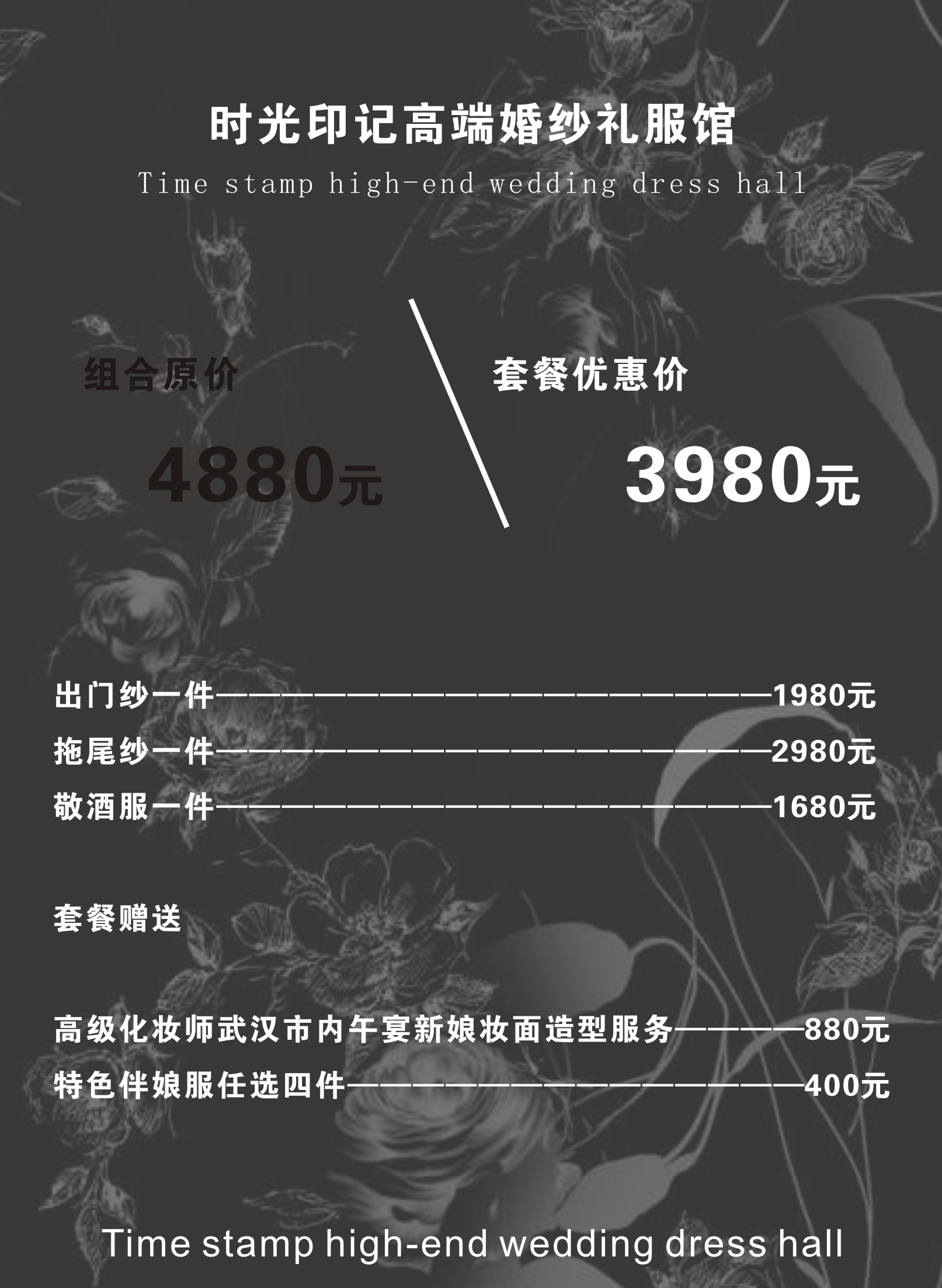 出门纱1件------------1980元 拖尾纱1件------------2980元 敬酒服1件------------1680元 套餐赠送: 高级化妆师武汉市内午宴新娘妆面造型服务------880元 特色伴娘服任选4件 店内头纱首饰任选