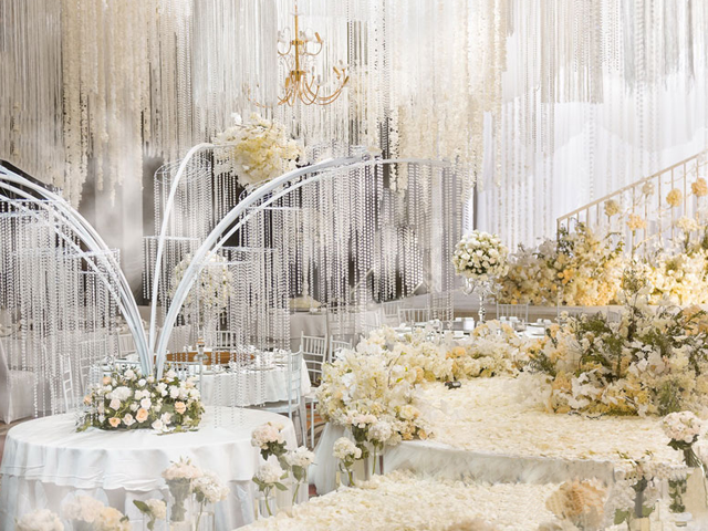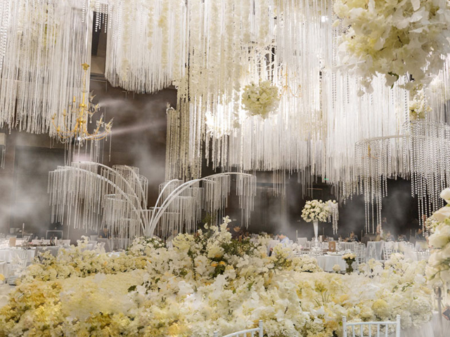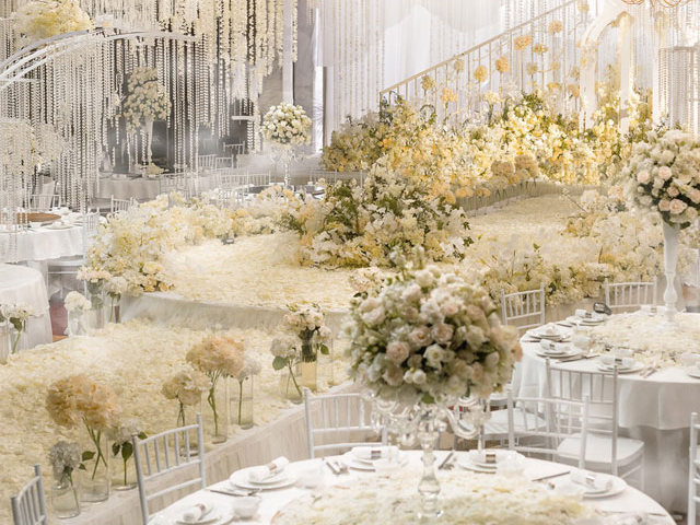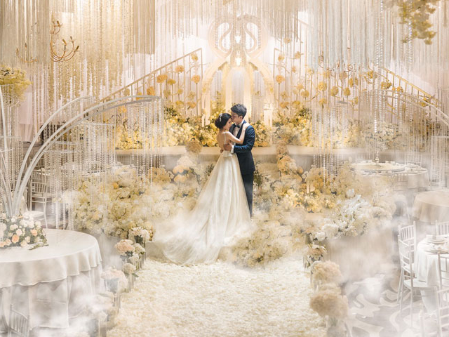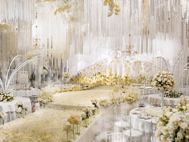 超大豪华布艺帷幔背景(复式三块背景)结合 KT 板造型/豪华布艺帷幔,高清写真喷绘,组合背景/豪华布艺背景和 KT 板造型组合背景/豪华飘顶一个,结合 KT 板造型;精美定制雪弗板花瓣装饰 1 组;设计师一对一专设计属设计 KT 板造型;豪华金色罗马盆路引和花艺装饰 8 个/花瓣龙珠灯路引 8 个(二选一);欧式时尚铁艺贵妃椅 1 套和花艺装饰;豪华浪漫高仿真樱花树 1 棵;专业钢结构 T 台 ;T 台末端方形交接仪式舞台;T 台两侧高仿真花艺花排;红地毯或主题色地毯或镜面地毯;T 台交接仪式区樱花拱门 1 座;高档水晶吊灯 2 盏;精美亚克力直筒玻璃花瓶 24个;水晶珠帘数串。