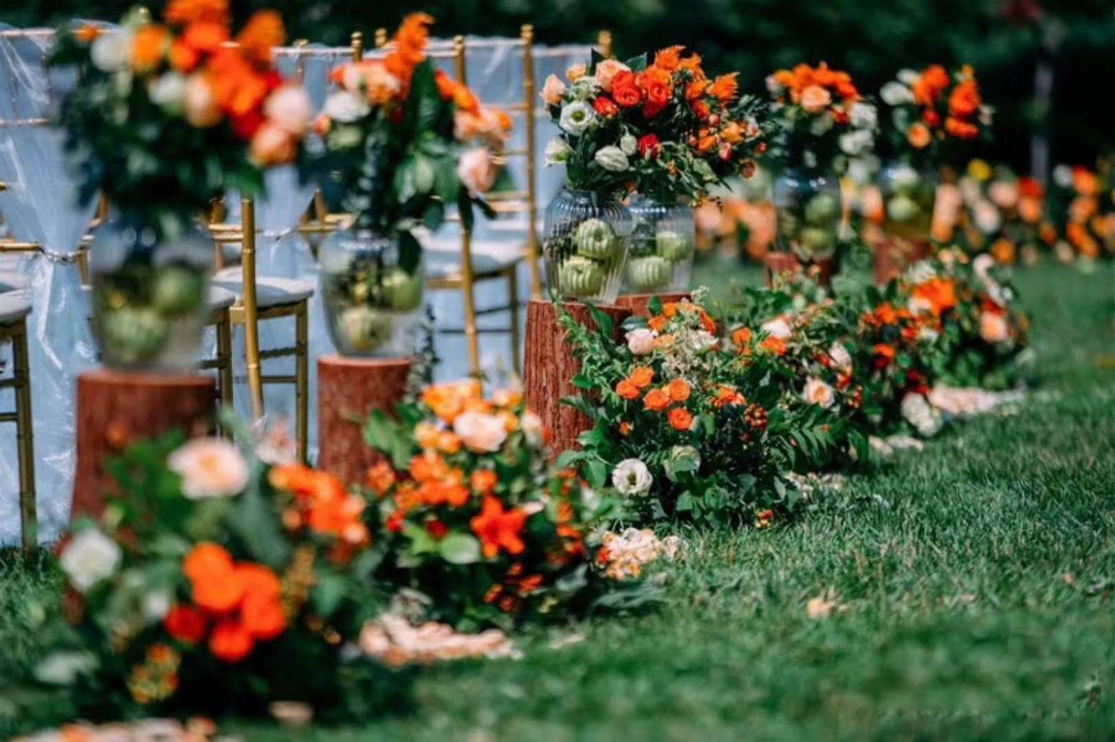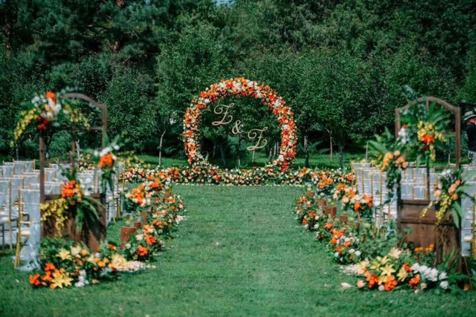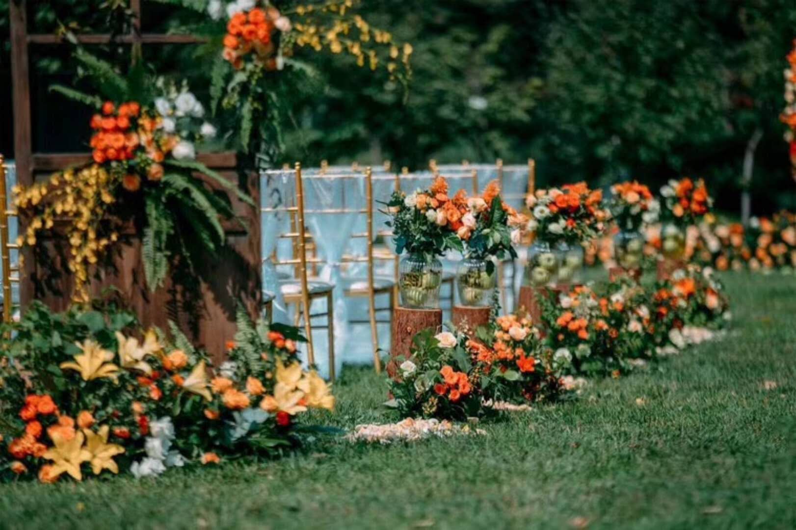 超大豪华布艺帷幔背景(复式三块背景)结合 KT 板造型/豪华布艺帷幔,高清写真喷绘,组合背景/豪华布艺背景和 KT 板造型组合背景/豪华飘顶一个,结合 KT 板造型;精美定制雪弗板花瓣装饰 1 组;设计师一对一专设计属设计 KT 板造型;豪华金色罗马盆路引和花艺装饰 8 个/花瓣龙珠灯路引 8 个(二选一);欧式时尚铁艺贵妃椅 1 套和花艺装饰;豪华浪漫高仿真樱花树 1 棵;专业钢结构 T 台 ;T 台末端方形交接仪式舞台;T 台两侧高仿真花艺花排;红地毯或主题色地毯或镜面地毯;T 台交接仪式区樱花拱门 1 座;高档水晶吊灯 2 盏;精美亚克力直筒玻璃花瓶 24个;水晶珠帘数串。