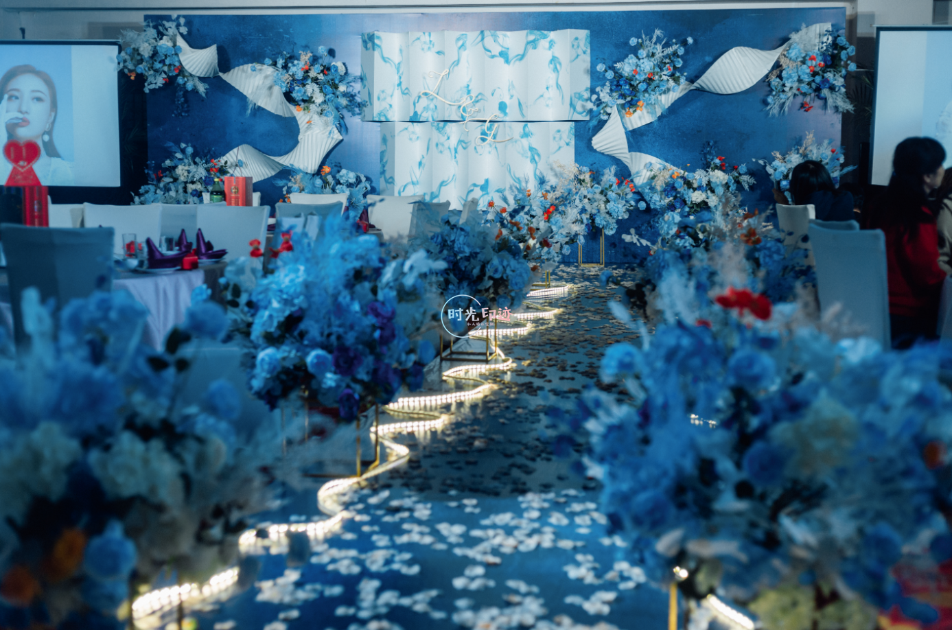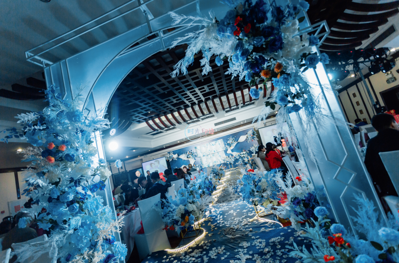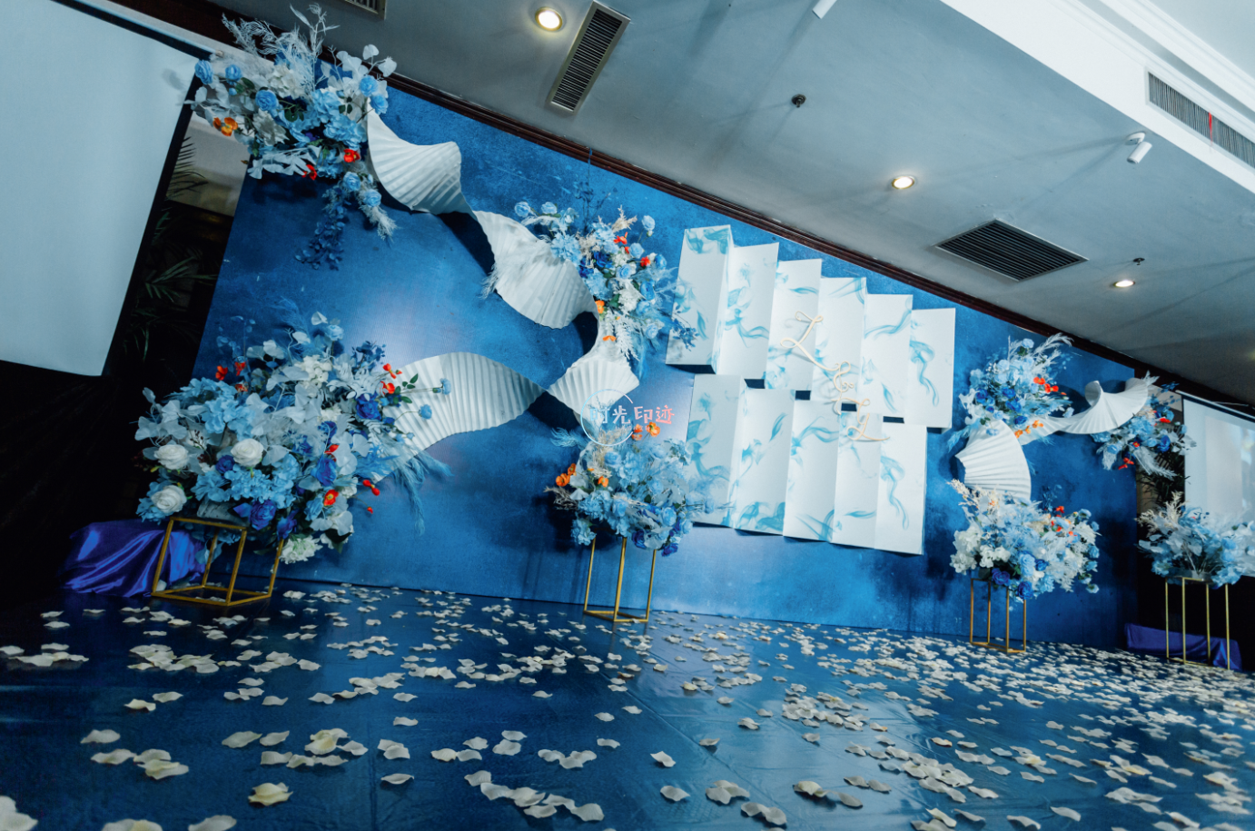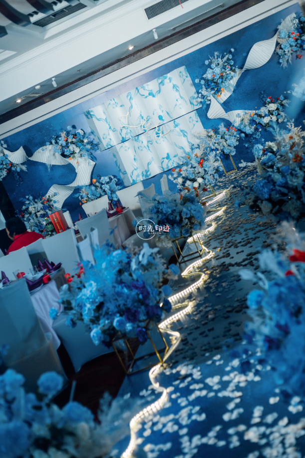 主舞台:纱幔打底,前面铁艺架子做花艺造型以及灯串+美人纱造型 舞台撒花瓣 T台:花球+跑马灯路引 交接区:亚克力方柱+罗马盆+花球