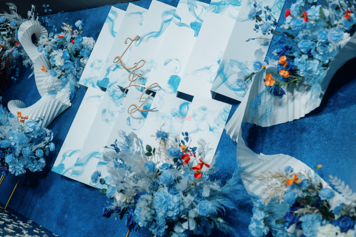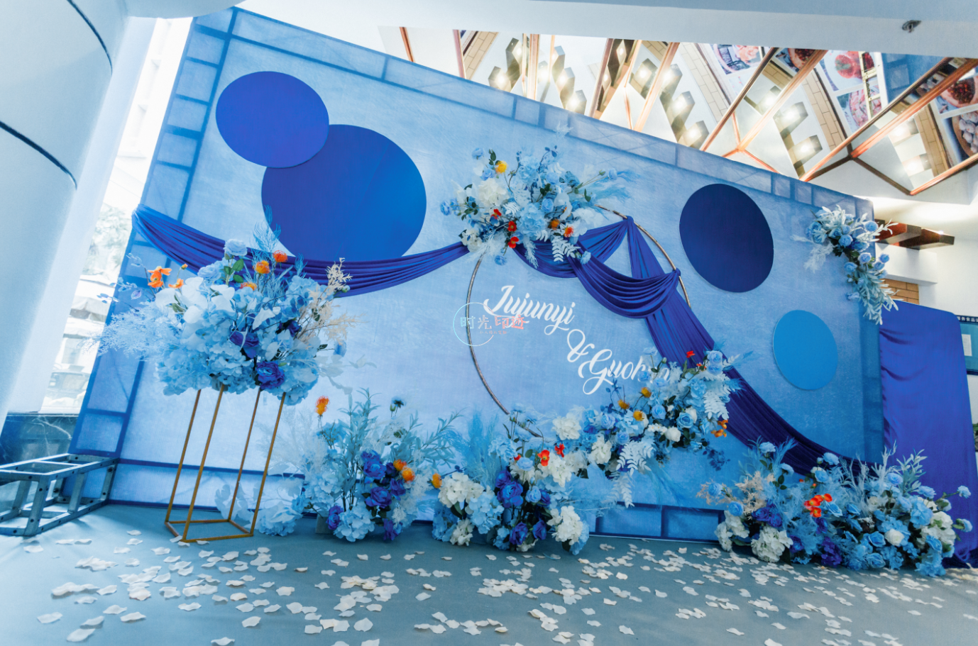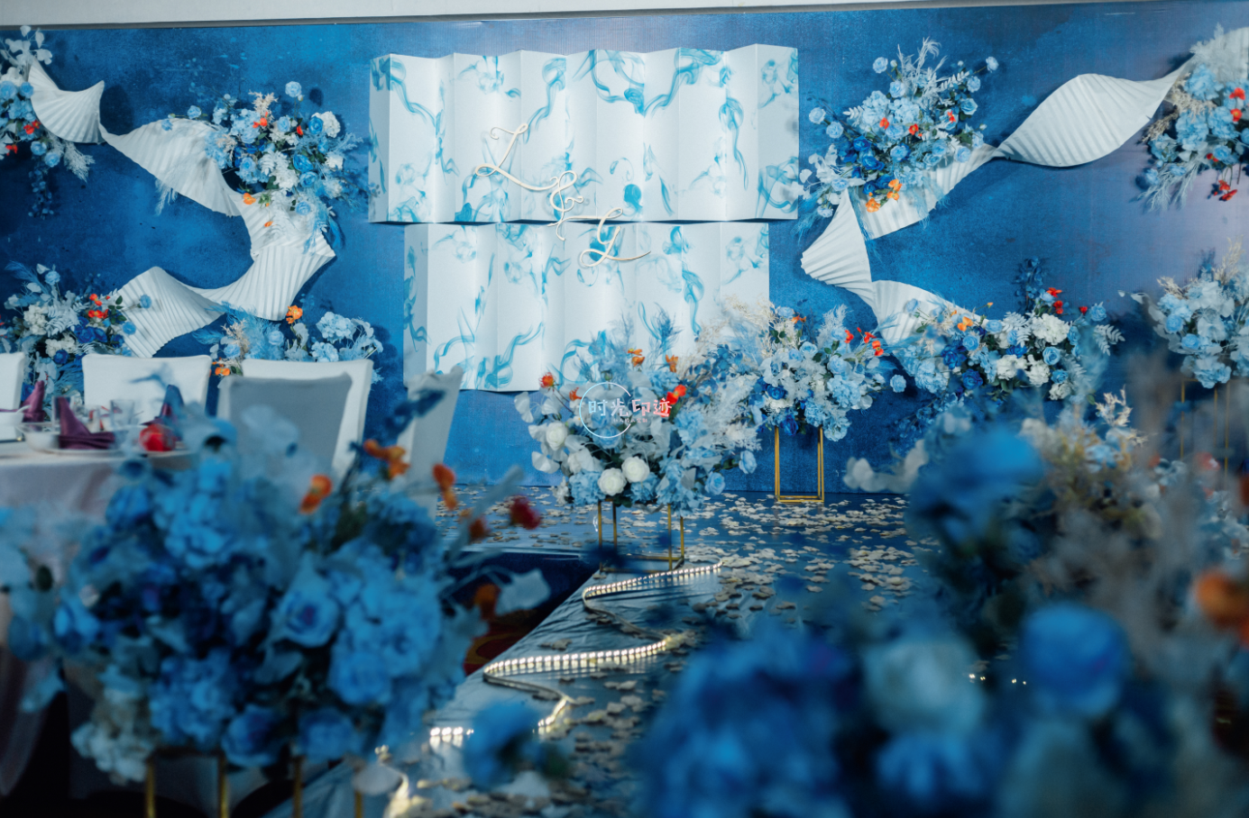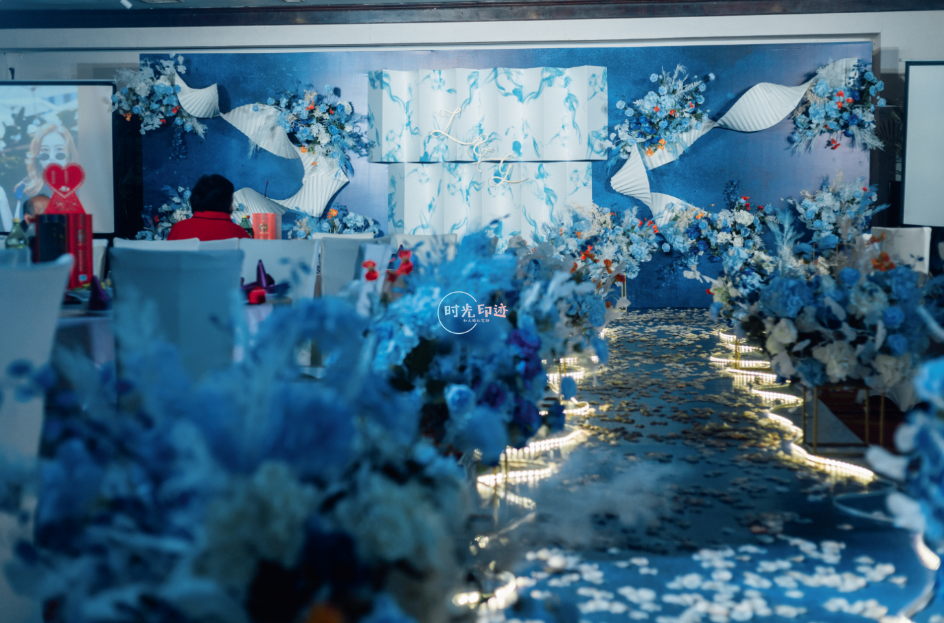 主舞台:纱幔打底,前面铁艺架子做花艺造型以及灯串+美人纱造型 舞台撒花瓣 T台:花球+跑马灯路引 交接区:亚克力方柱+罗马盆+花球