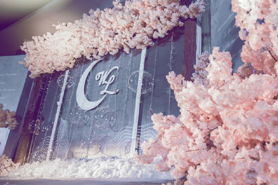 花艺全场点缀,花材多样,玫瑰、龟背叶、紫藤等数十种花材配合搭建,材质为绢花。