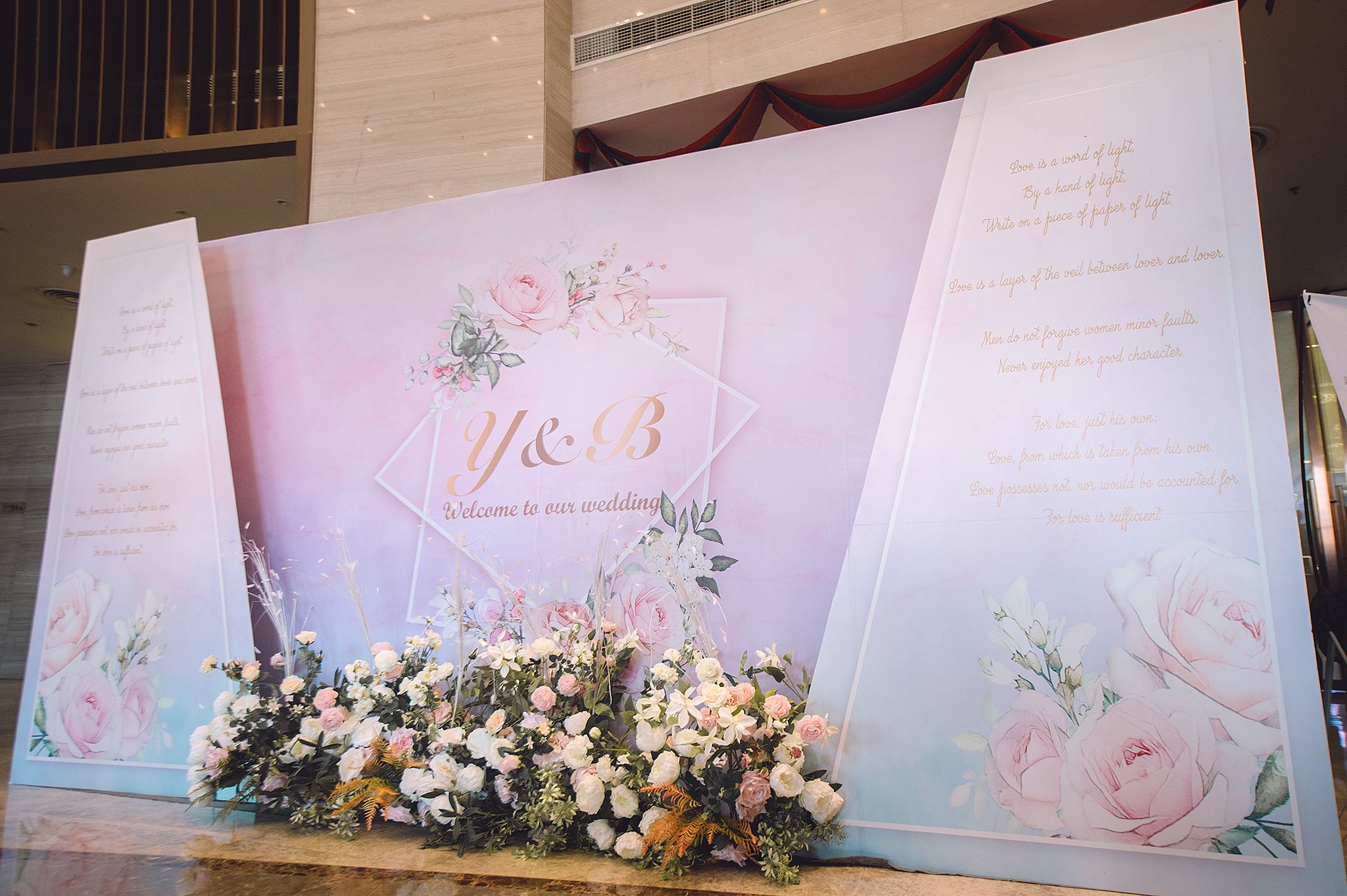 1.迎宾区背景3.5m×2.5m 2.迎宾区装饰 3.迎宾水牌