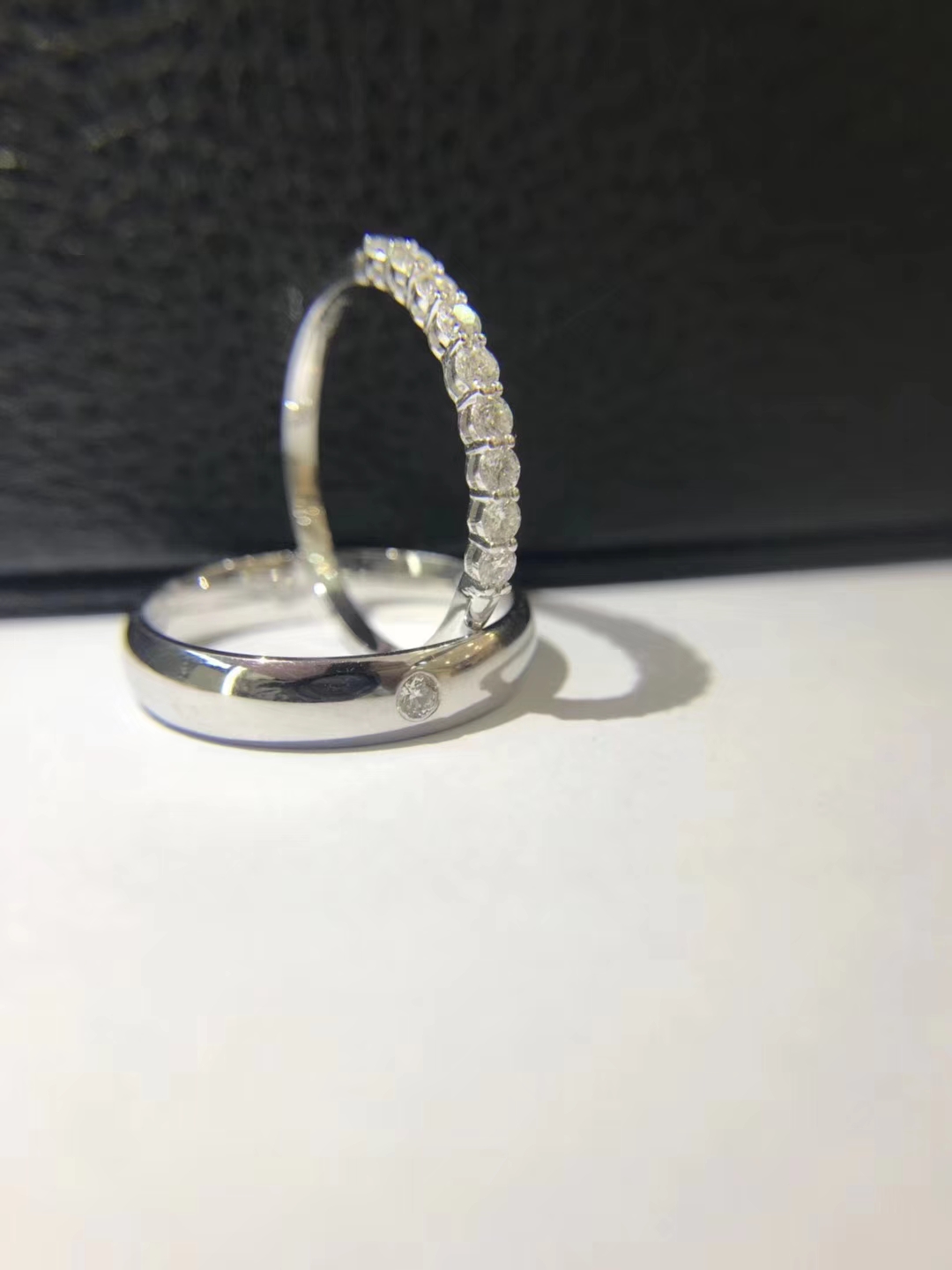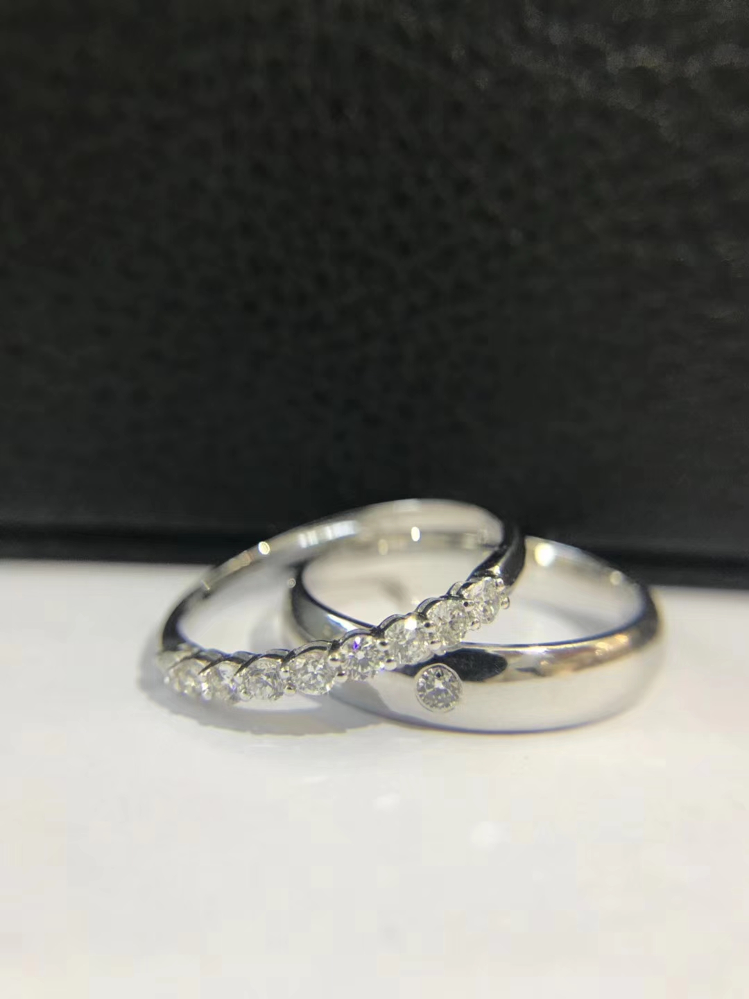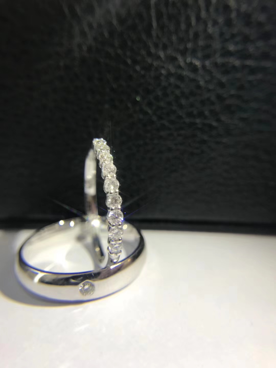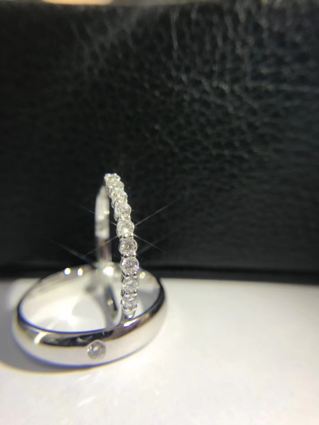 十全十美对戒,男戒外镶一颗钻,女戒外镶九颗钻,共计0.3ct,寓十全十美。