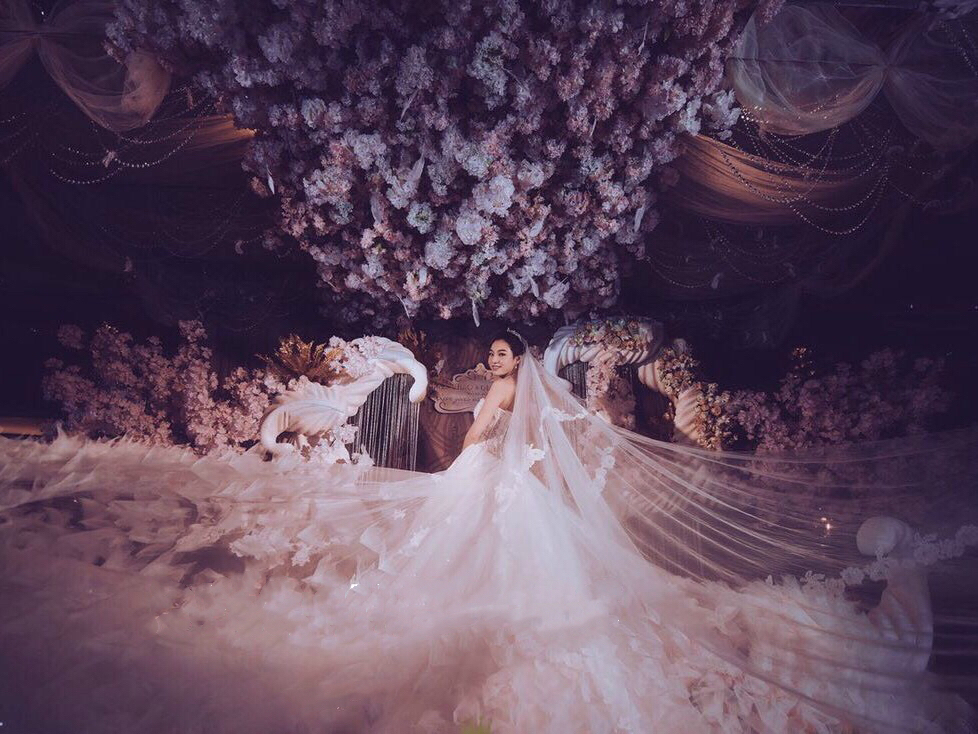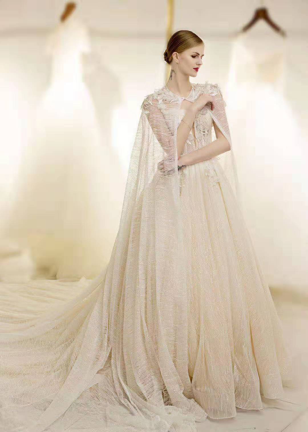 彼爱高端定制出门纱or中式出门礼服1件; 高端定制重手工拖尾纱1件; 高端定制气质敬酒礼服1件; 精美进口奢华头纱1件。