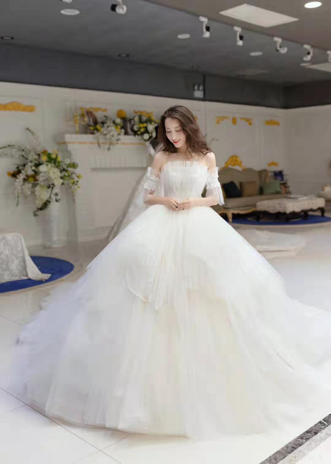轻奢出门纱or高端定制中式出门礼服1件 轻奢定制重手工拖尾纱1件 轻奢定制气质敬酒礼服1件 精美进口奢华头纱1件 精美伴娘服两件