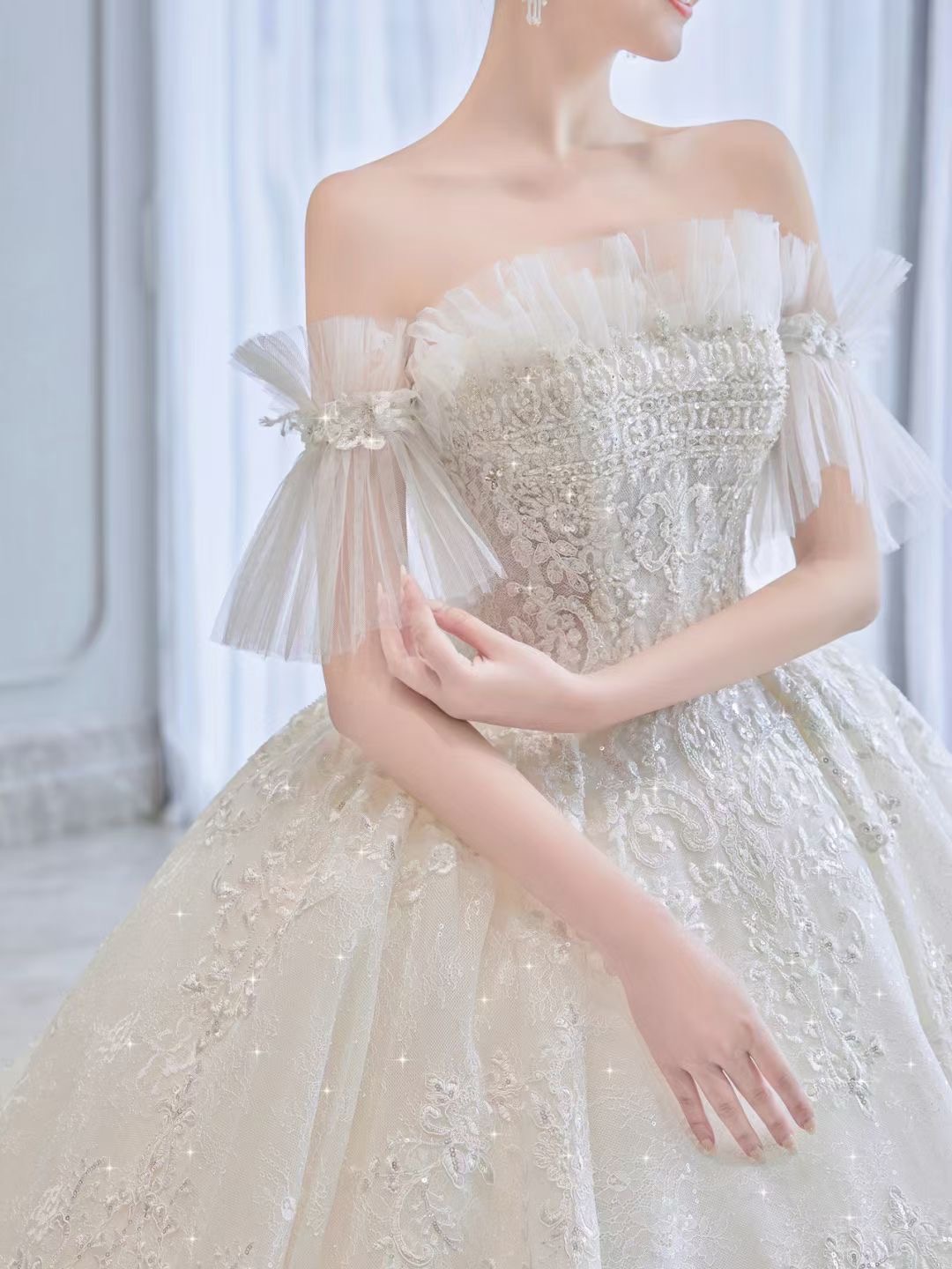 藤蔓繁花精致复古, 花枝瑰丽多姿, 蔓延在温婉柔美的裸色薄纱上, 灵动飘逸的荷叶边更显温柔。[羞嗒嗒] 丰富了整体的层次感 甜美梦幻,具有满满的仪式感~[心]