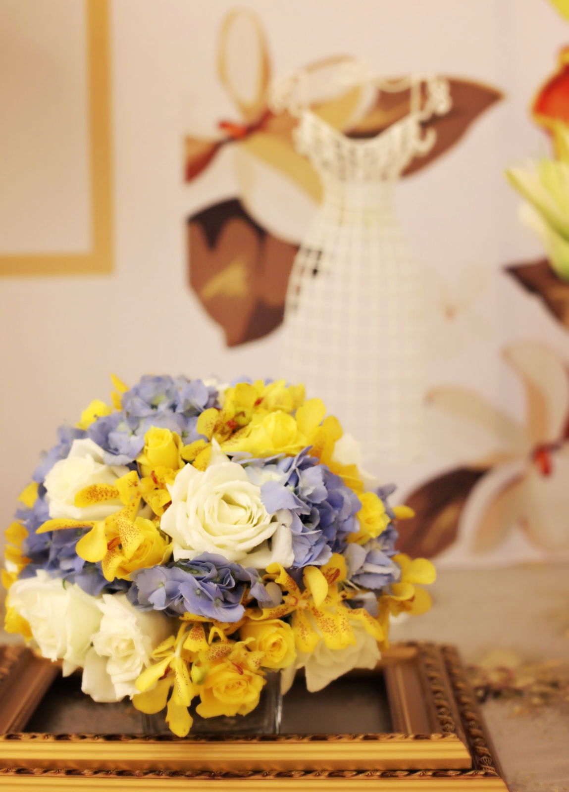 婚礼厅内布置 主舞台精美纱曼布艺背景 舞台背景支架搭建 两侧豪华路引十个 舞台精美仪式台帷幔布景 舞台仪式区鲜花布置装饰 仪式台道具(时尚烛台,许愿沙杯塔、香槟酒杯塔(二选一)) 主桌精美鲜花设计布置 精美欧式布艺绢花仪式厅 红地毯一条 舞美灯光效果 专业舞台追光灯两台 七彩大功率泡泡机一台 展示区背景效果灯四组 厅外展示区与签到台,迎宾区精美布置