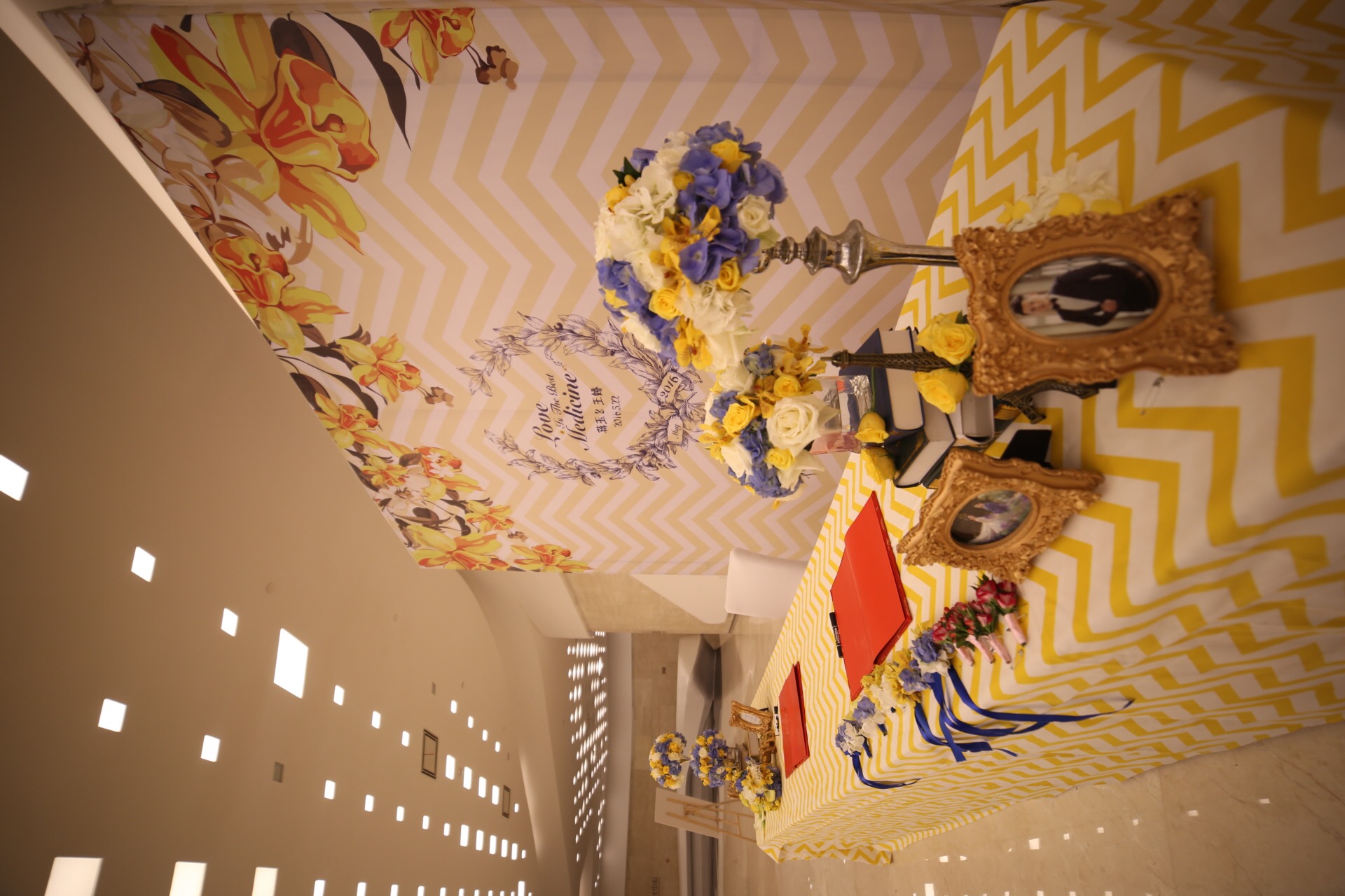 迎宾区背景纱幔布置 精美绢花花艺装饰 新人婚纱照展示 精美装饰品摆件 签到台鲜花花艺设计