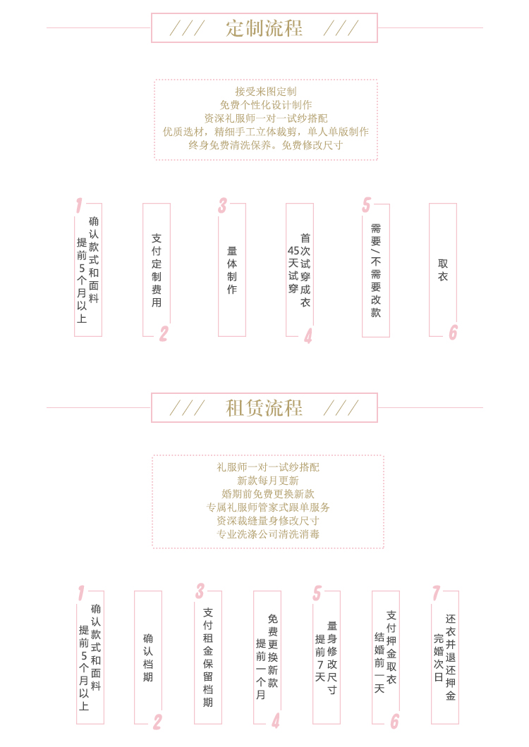 1.免费试装:店内婚纱均可免费试穿 2.拍照留念:感受个性化量身定制服务、试穿过程中拍照留念 3.专属服务:专享店内一对一VIP会员尊享服务 4.在线预约:至少提前一天预约确保试纱环境