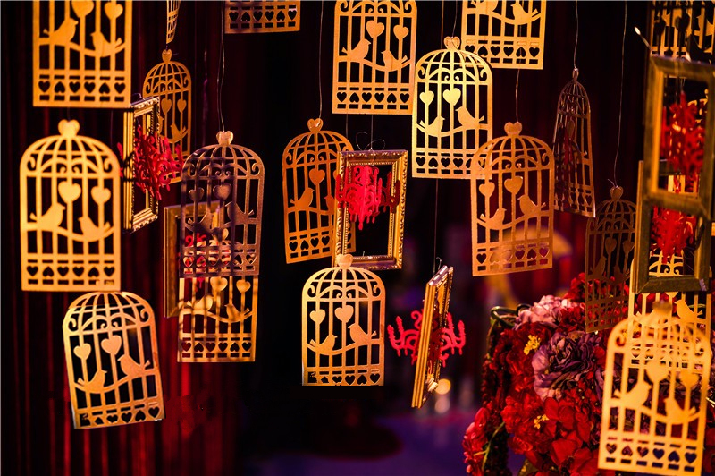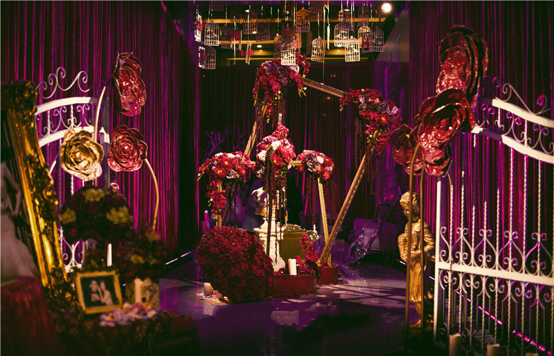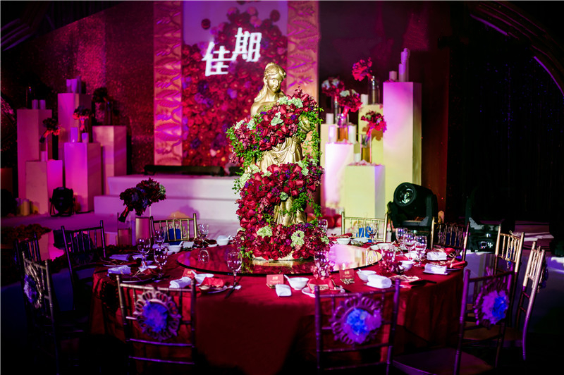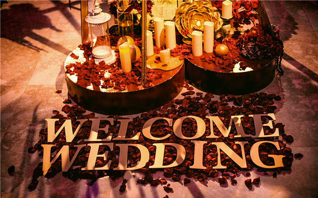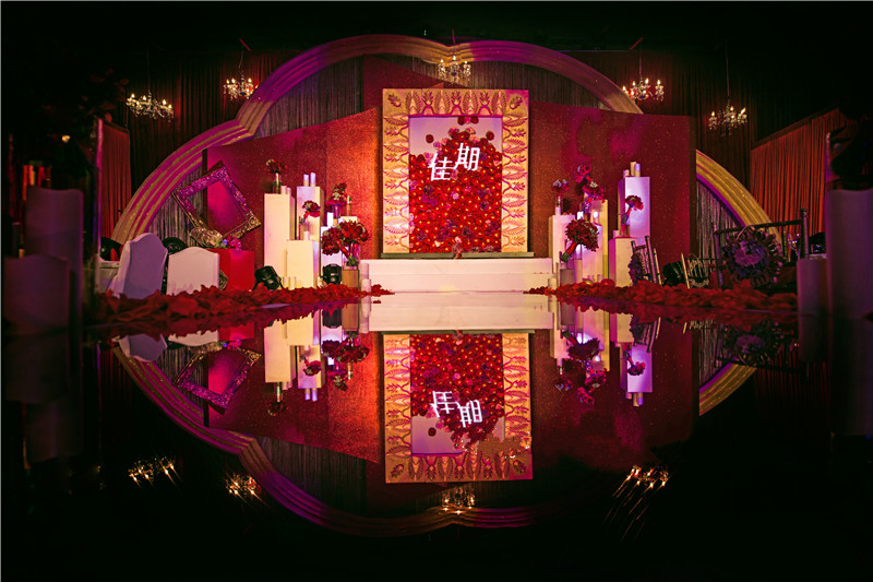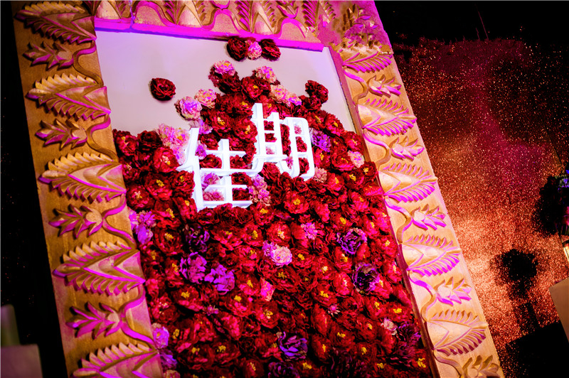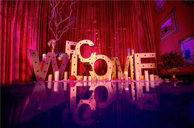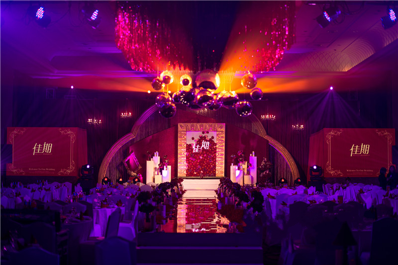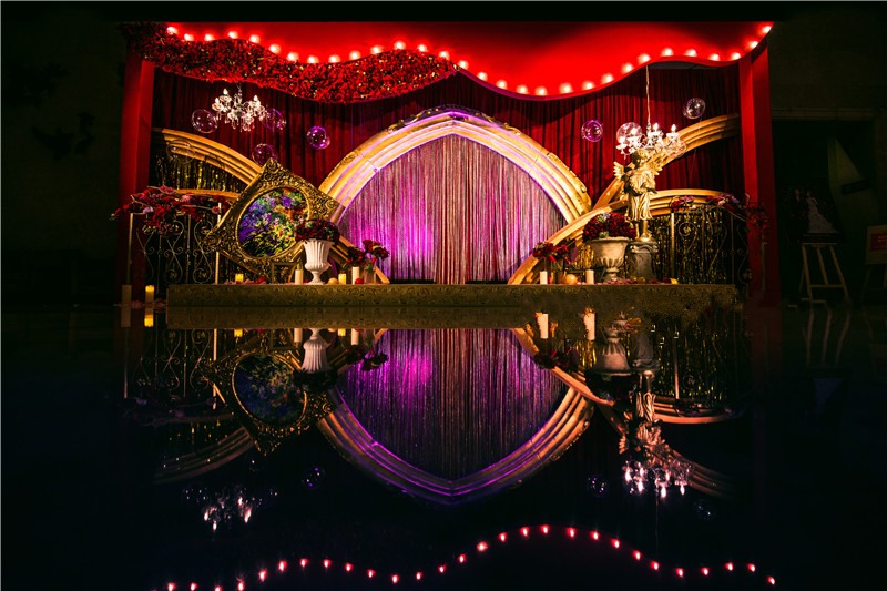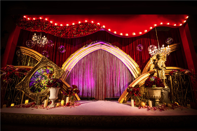 1.舞台主背景:布艺装饰(主题立体设计板造型+多层组合+主题造型装饰、专属新人主题LOGO)+LED灯光