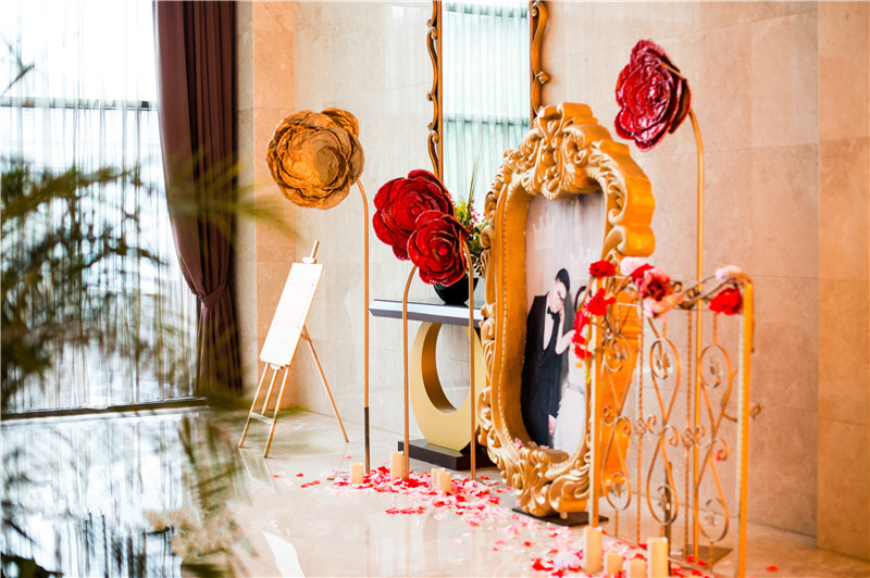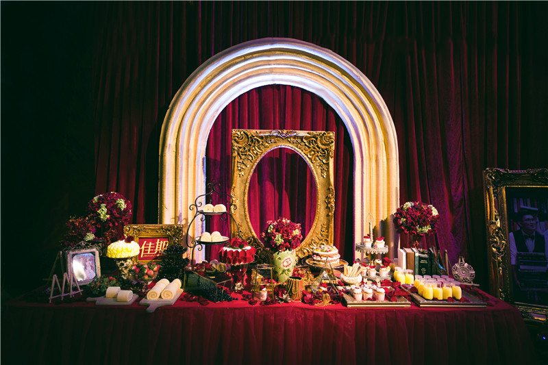 1.签到台装饰:布艺装饰桌台+新人相框摆台4个+精美摆件装饰1组