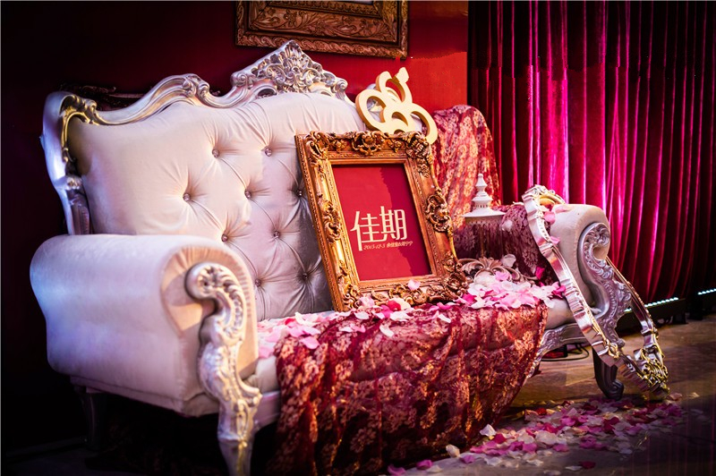 1.合影区:立体设计背景+主题装饰+主题LOGO+花艺造型+灯光点缀 (支架搭建、立体造型、专属新人主题LOGO)