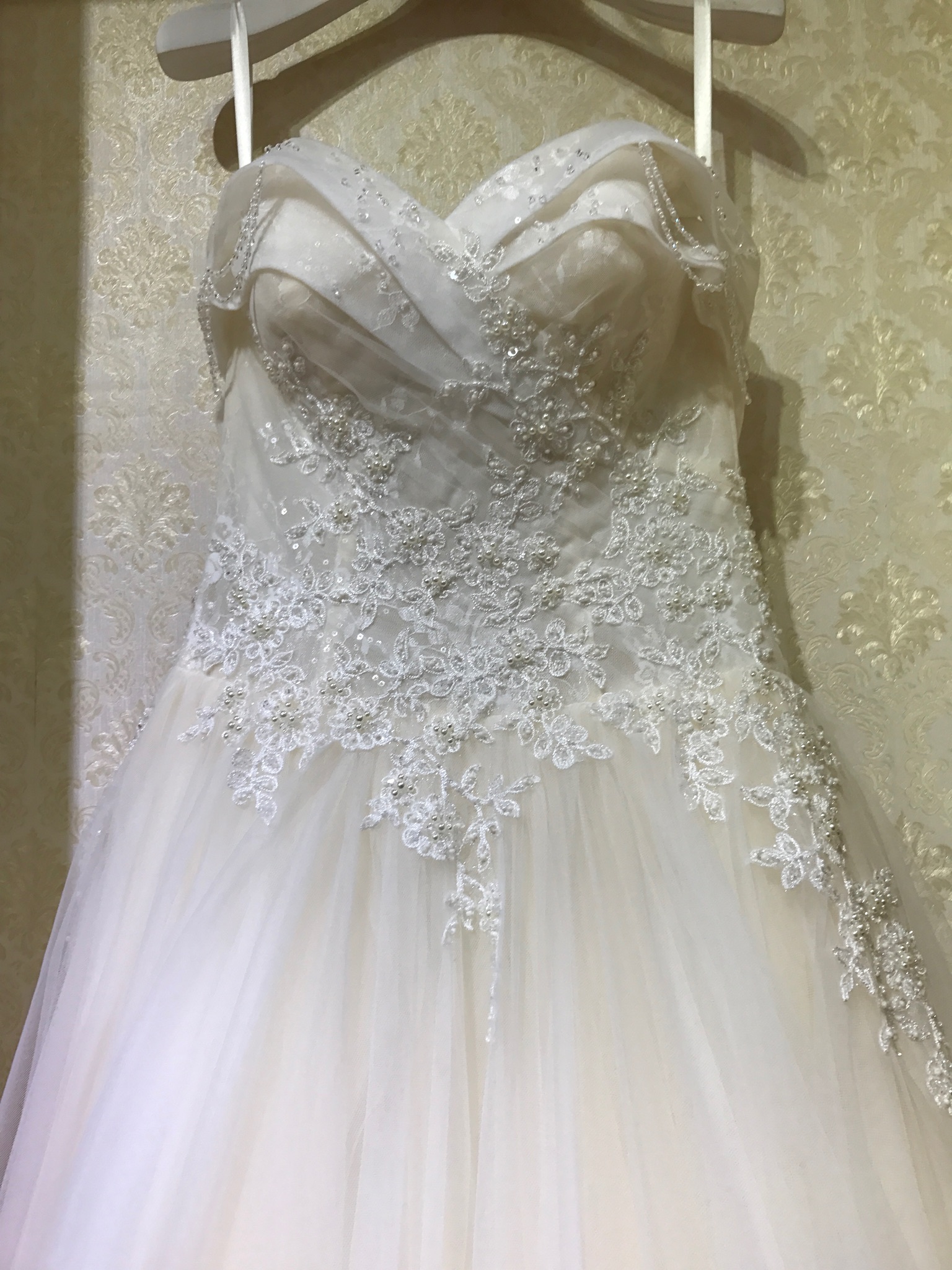 香槟色一字肩,手工钉珠
