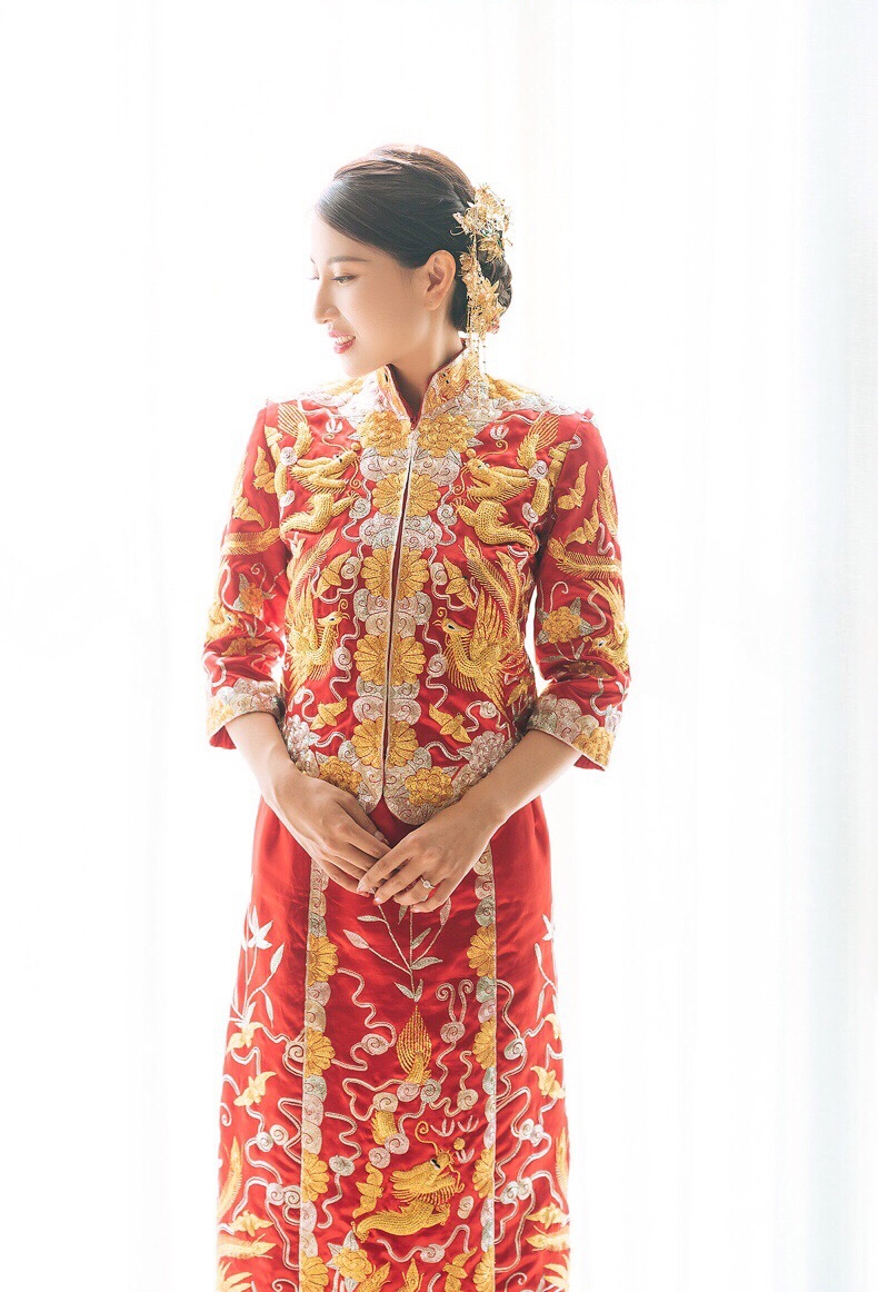 套餐内容: 1 出门中式吉服一件 或 出门齐地轻纱一件 2 设计师品牌拖尾典礼主纱一件 3 敬酒礼服一件 4 伴娘服2~4件 5 提供专业礼服师婚礼日穿纱服务