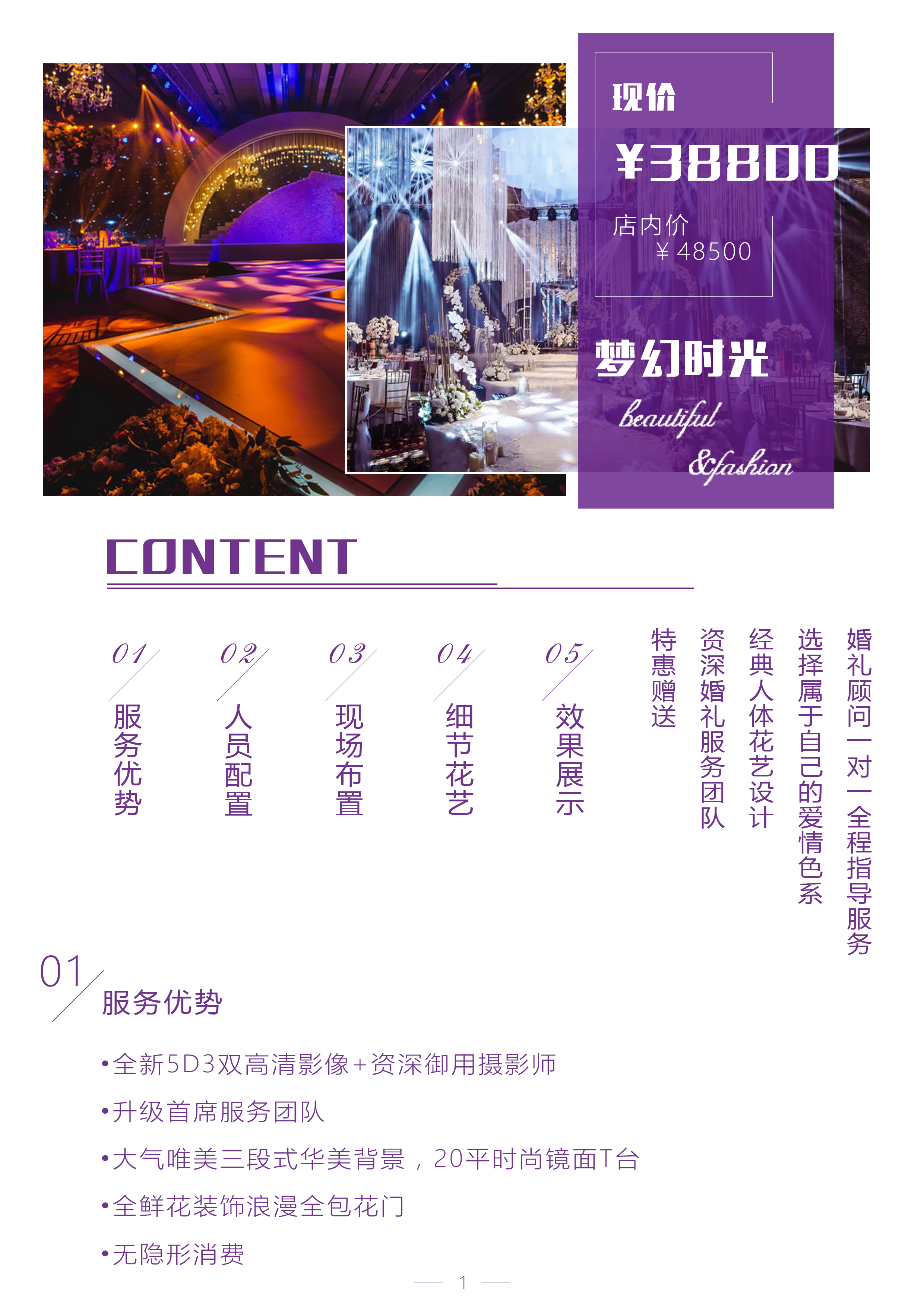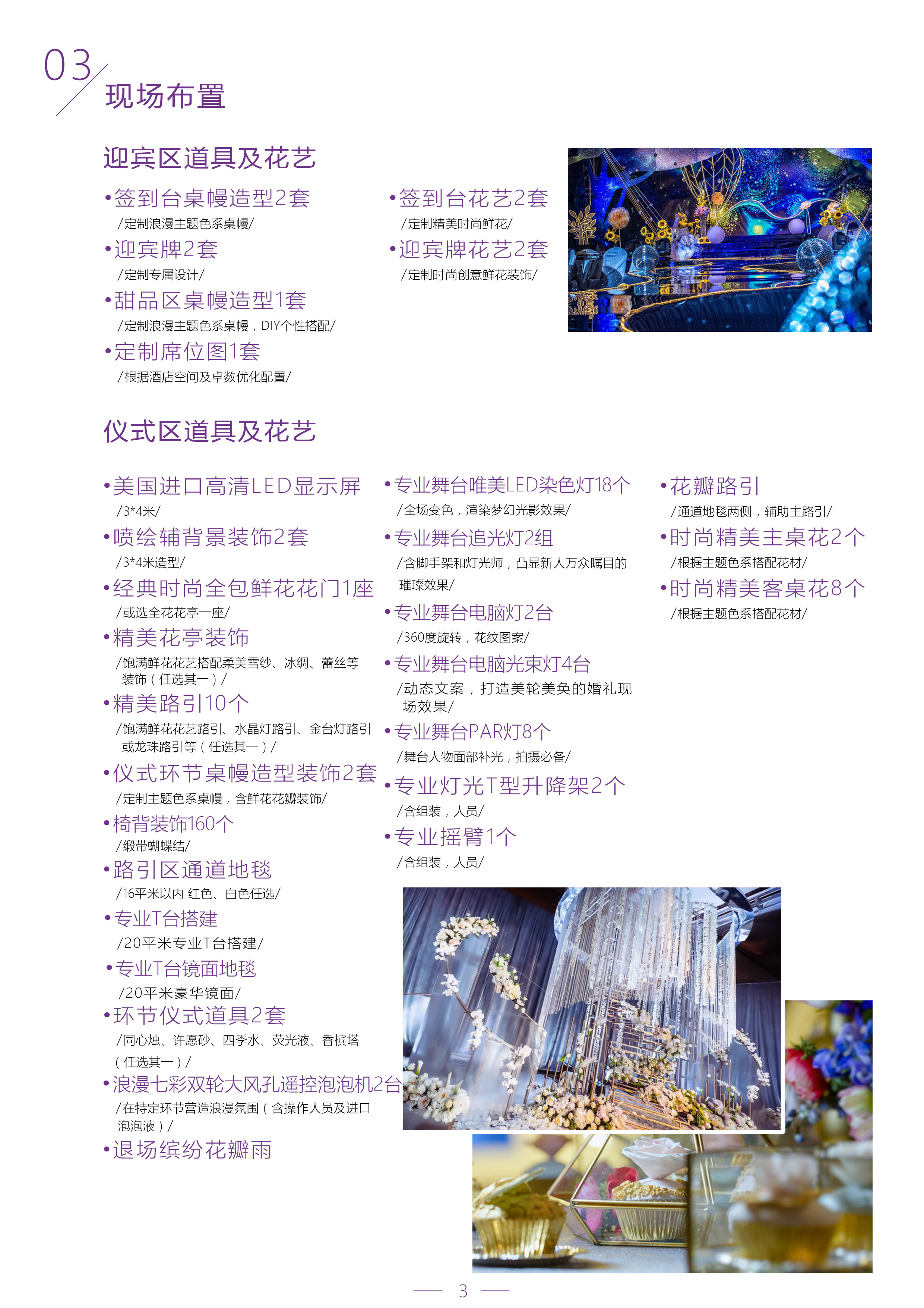 主题喷绘背景1套 纱幔背景装饰1套 经典时尚半包鲜花花门1座 精美花亭或花门装饰 精美路引8个 仪式环节桌幔造型装饰2套 椅背装饰20个 T台纯全新地毯 专业T台搭建 环节仪式道具2套 浪漫七彩双轮大风孔遥控泡泡机2台 时尚精美主桌花2个 专业舞台唯美LED染色灯10个 专业舞台追光灯2组 专业舞台电脑灯2台 灯控台设备一套 专业舞台PAR灯8个 专业灯光T型升降架2个 花瓣路引