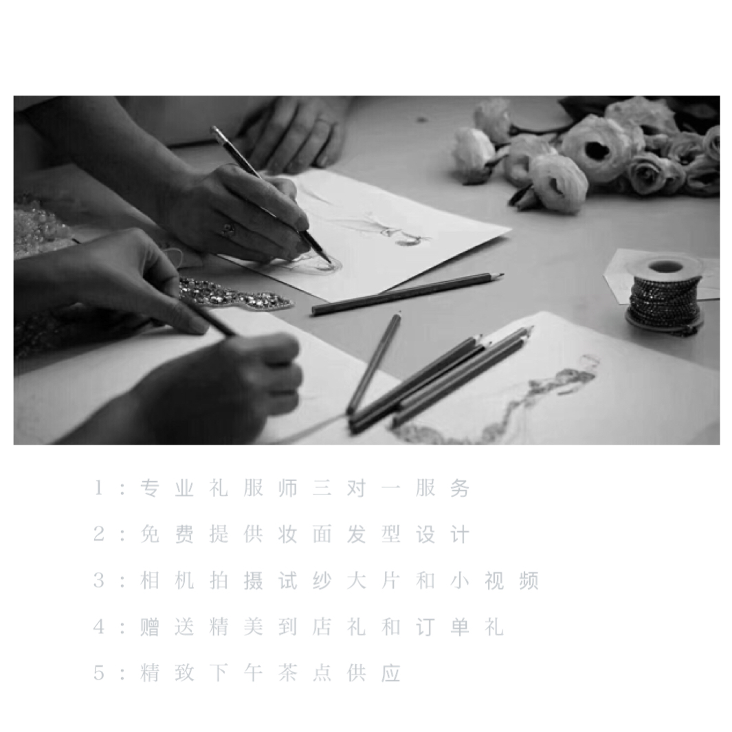 1.礼服师三对一贴心服务,预约到店无需等待,体验更好更私密。 2.试穿可随意拍照,工作人员可提供专业相机,为你拍摄处理后发给您。 3.礼服时均受过专业培训推荐独到客观。 4.专业化妆师免费淡妆试纱。