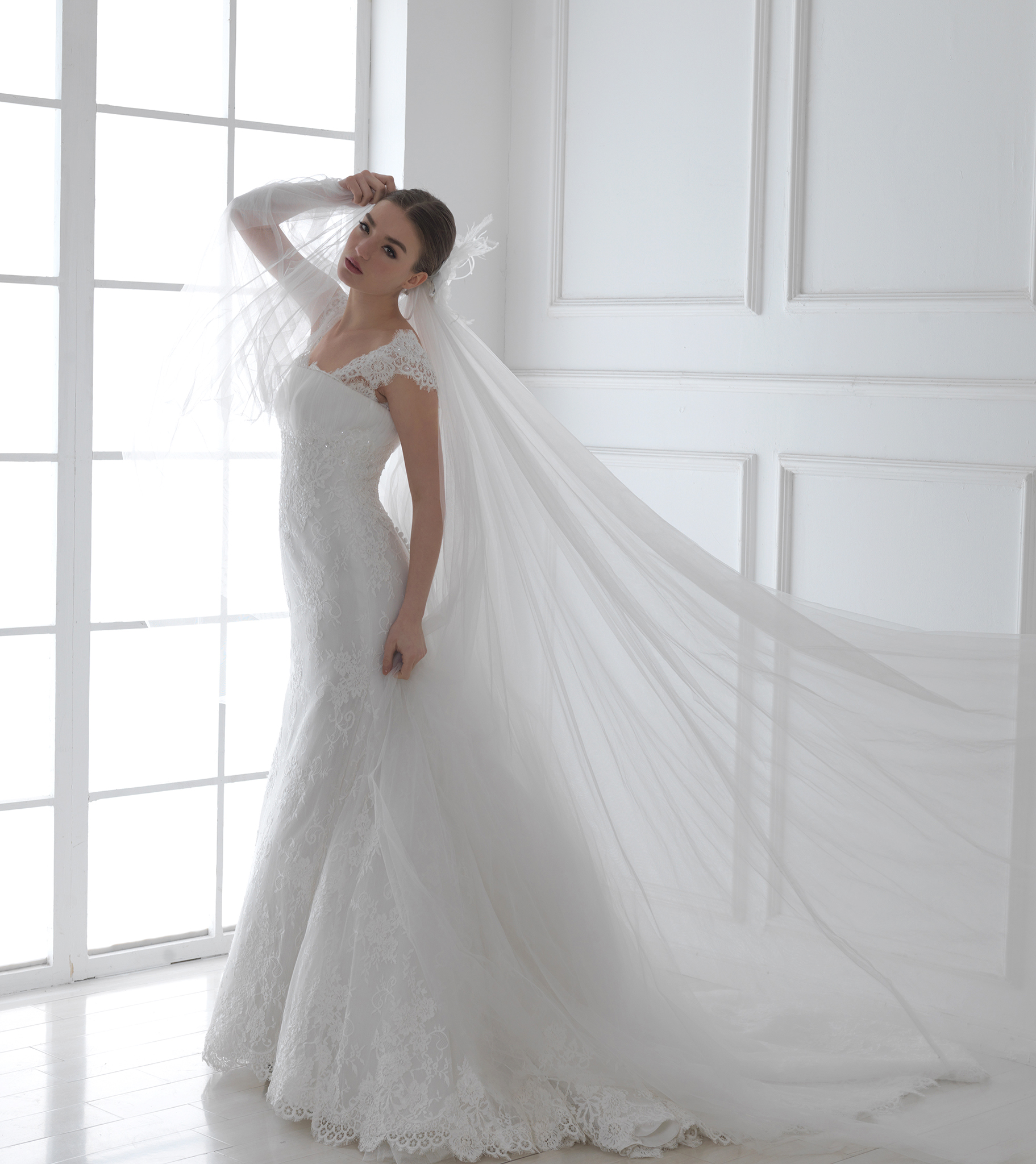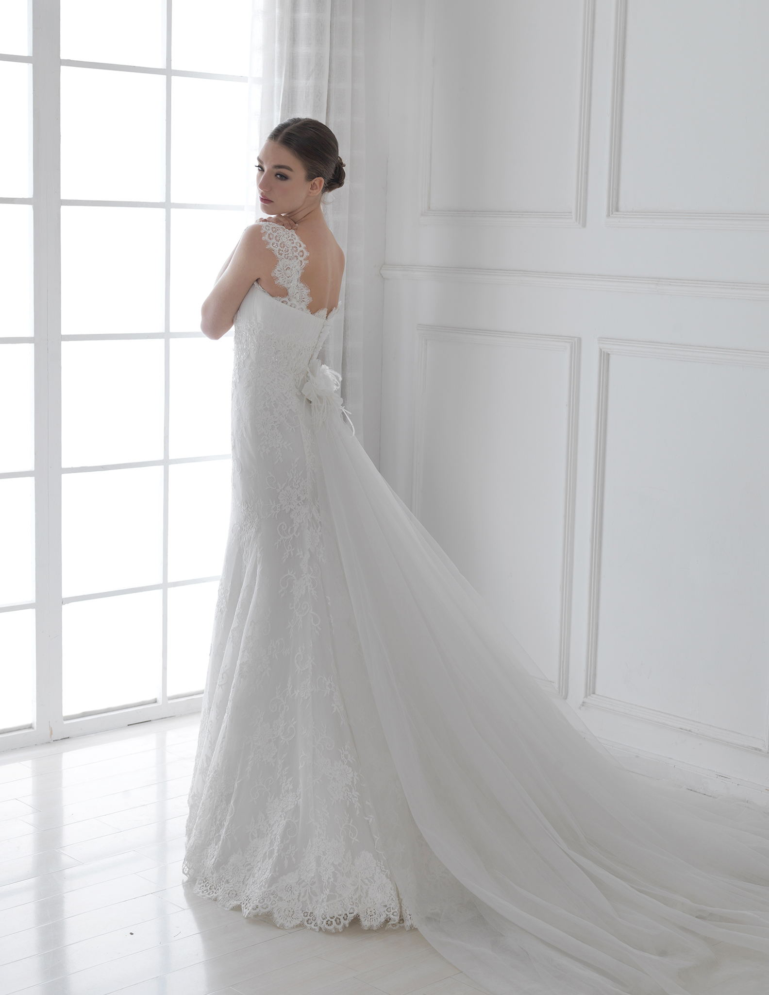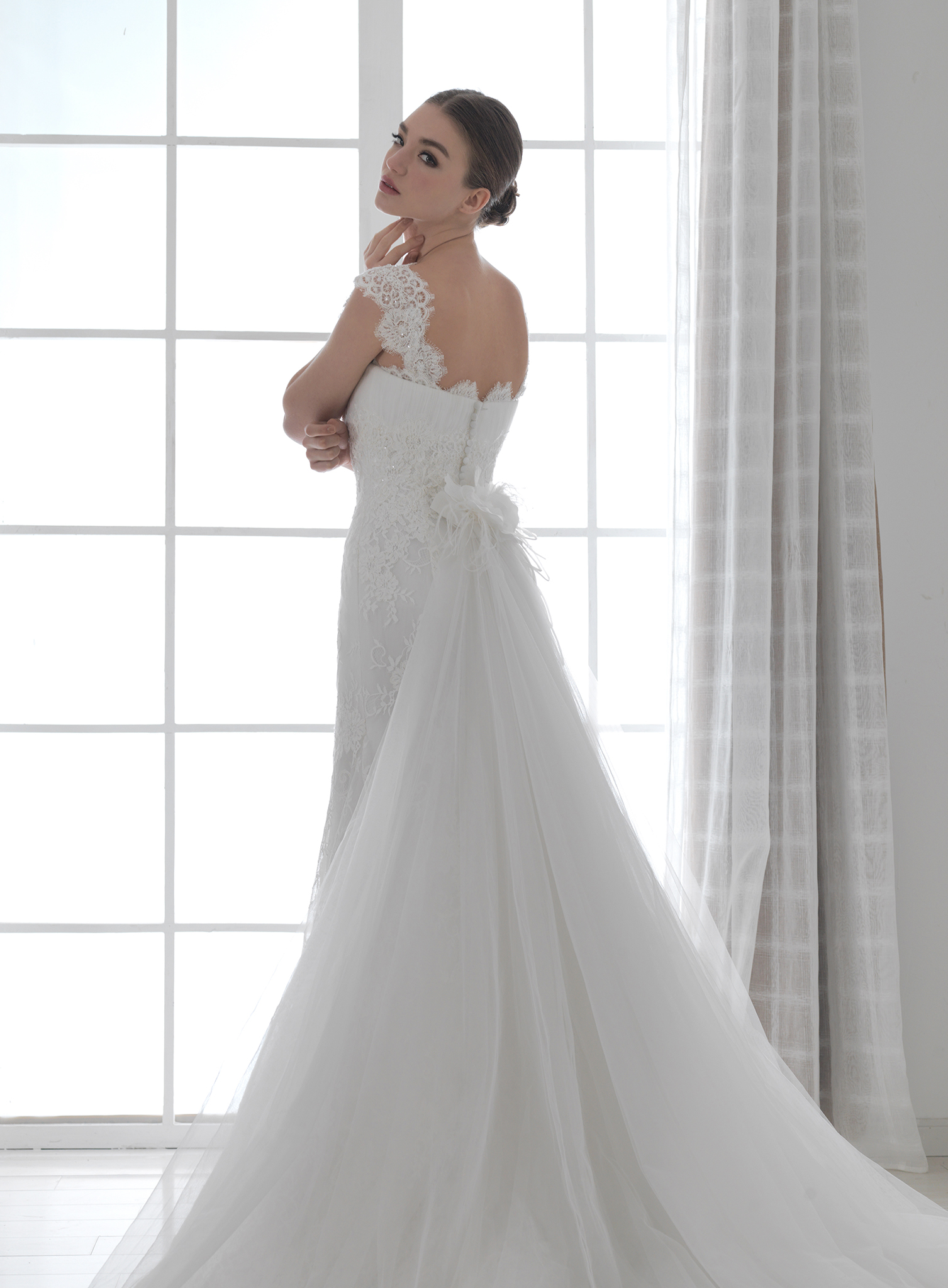 雙肩吊帶時常見於婚紗的形式,但這款吊帶婚紗不同於尋常,還可以將吊帶拉至肩部作為搭肩的款式,同時將人們的注意力吸引到新娘最性感的肩部,是一款將性感魅力發揮到淋漓盡致的搭肩婚紗。其高腰的設計不僅能遮住腰上的贅肉而且使上圍更加的豐滿,大面積的蕾絲質地,使得新娘彷彿置身於蕾絲的世界一般,蕾絲包裹住曼妙的身姿,加上我們對細節的雕琢,每一件婚紗都帶給你無限的品質感。