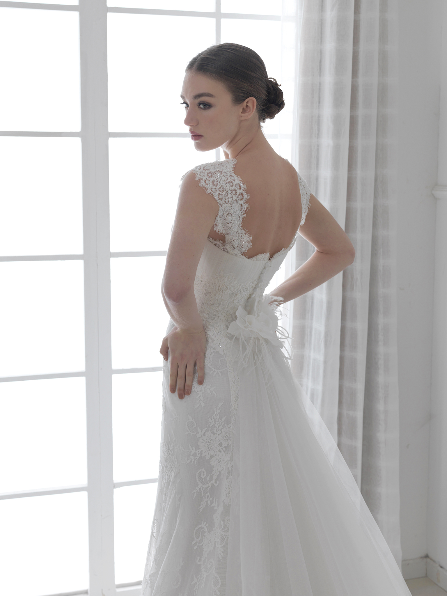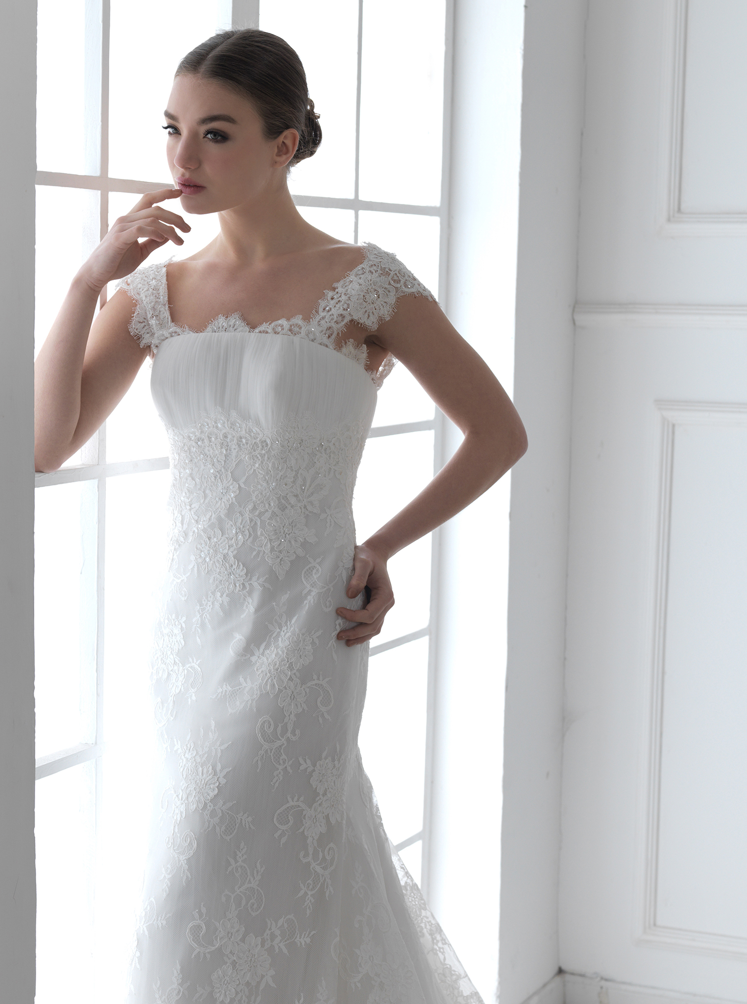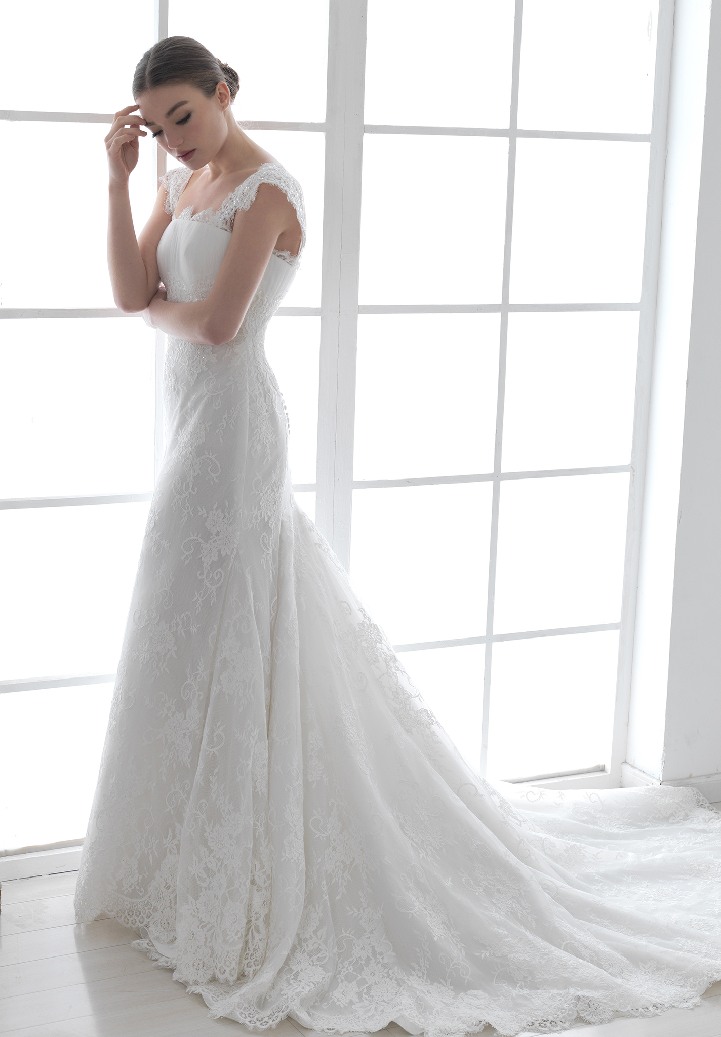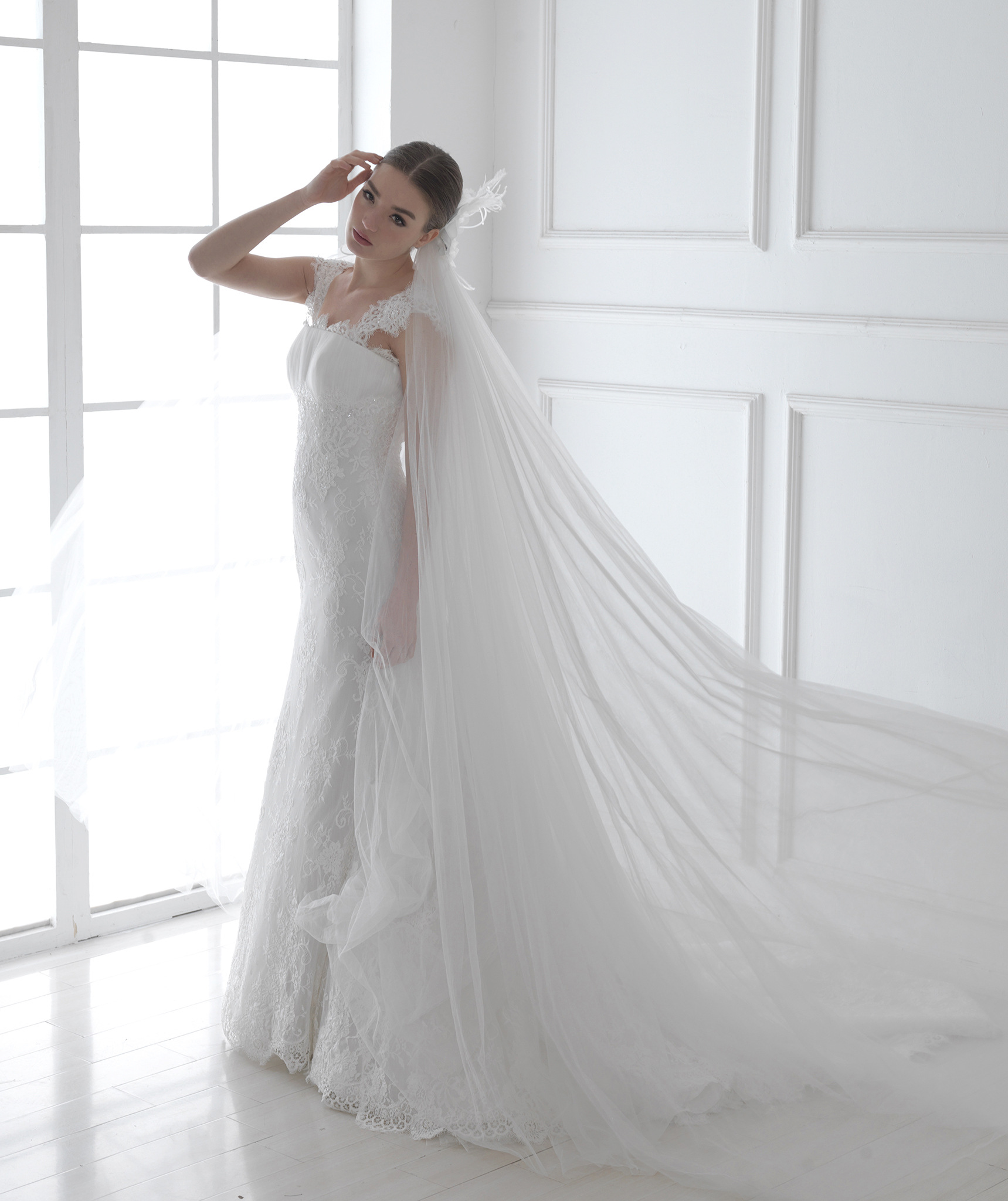 雙肩吊帶時常見於婚紗的形式,但這款吊帶婚紗不同於尋常,還可以將吊帶拉至肩部作為搭肩的款式,同時將人們的注意力吸引到新娘最性感的肩部,是一款將性感魅力發揮到淋漓盡致的搭肩婚紗。其高腰的設計不僅能遮住腰上的贅肉而且使上圍更加的豐滿,大面積的蕾絲質地,使得新娘彷彿置身於蕾絲的世界一般,蕾絲包裹住曼妙的身姿,加上我們對細節的雕琢,每一件婚紗都帶給你無限的品質感。