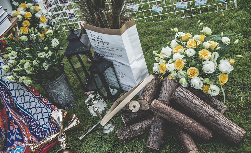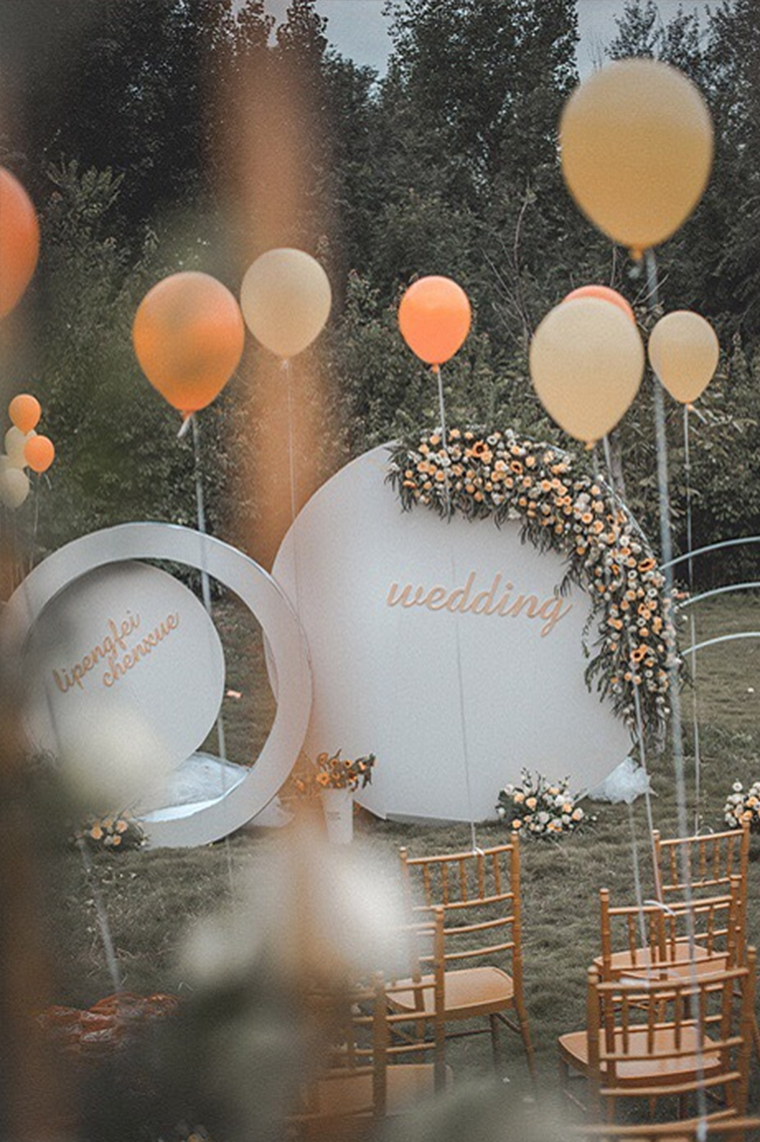 舞台定制设计绗架一组 新人名字LOGO设计 主题摆件整套 精致花艺+藤蔓+绿植装饰 幸福起点:原木门或开放式起点+花艺绿植 通道区:藤球,木桩绿植,地上花瓣,地毯铺路 西式靠椅30把 椅背纱30套 氦气球20个