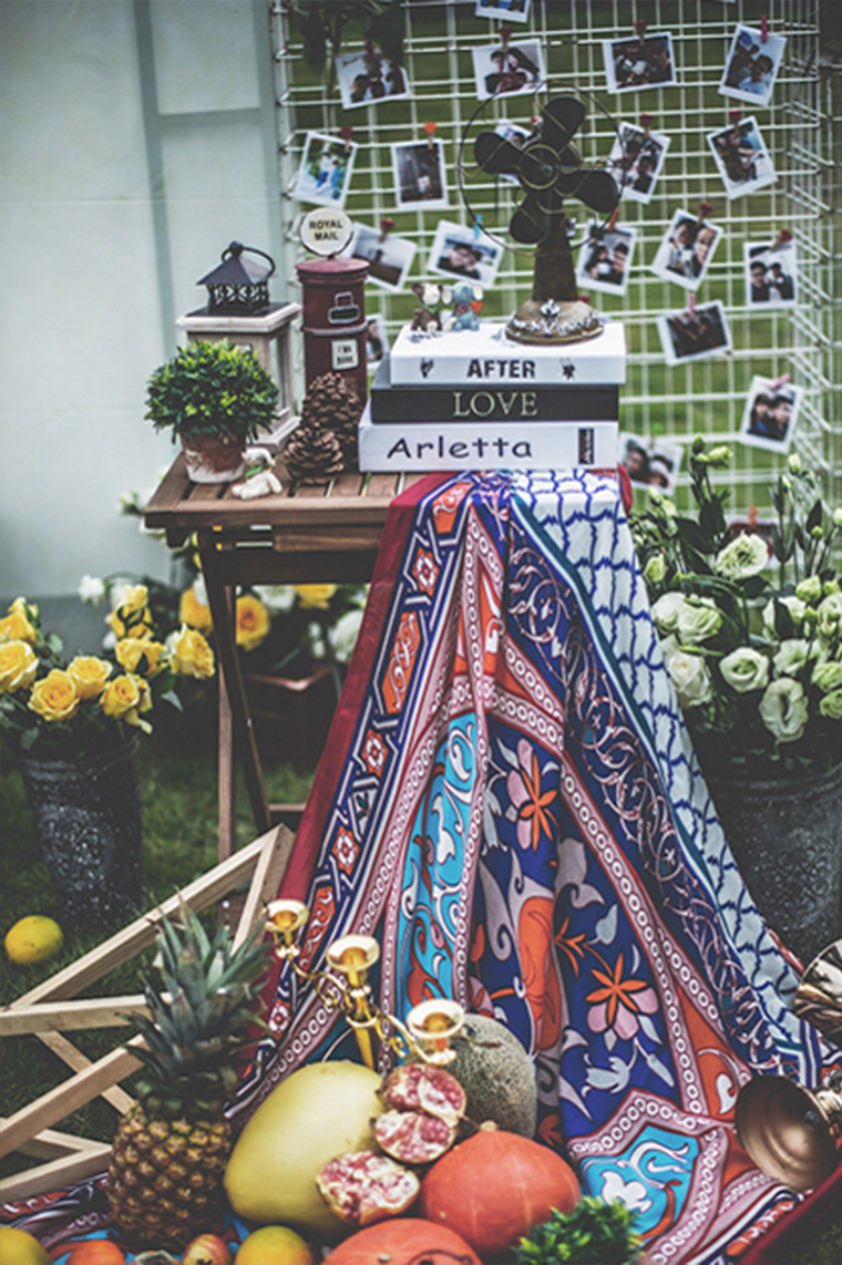 迎宾区主题设计一套 2*3+2.5*1.5喷绘设计两套 桁架支撑 氦气球60颗 迎宾区造型花艺设计 资深花艺设计师一名 迎宾区照片墙一组 迎宾牌一套