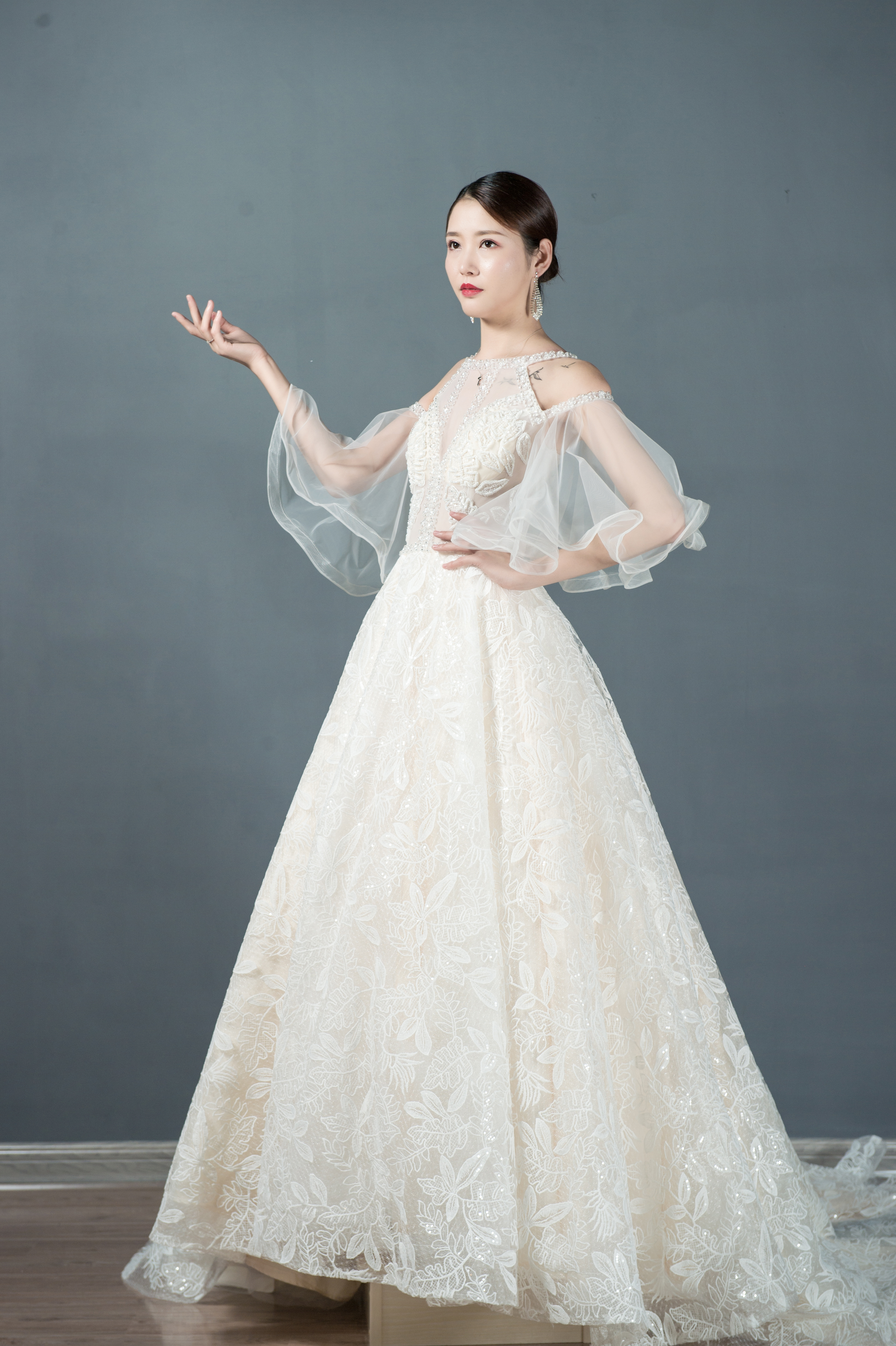 价值8888的3米长拖主纱一件 价值6380的出门轻纱一件可替换中式礼服 价值3850的豪华敬酒服一件 免费赠送高定伴娘服四件