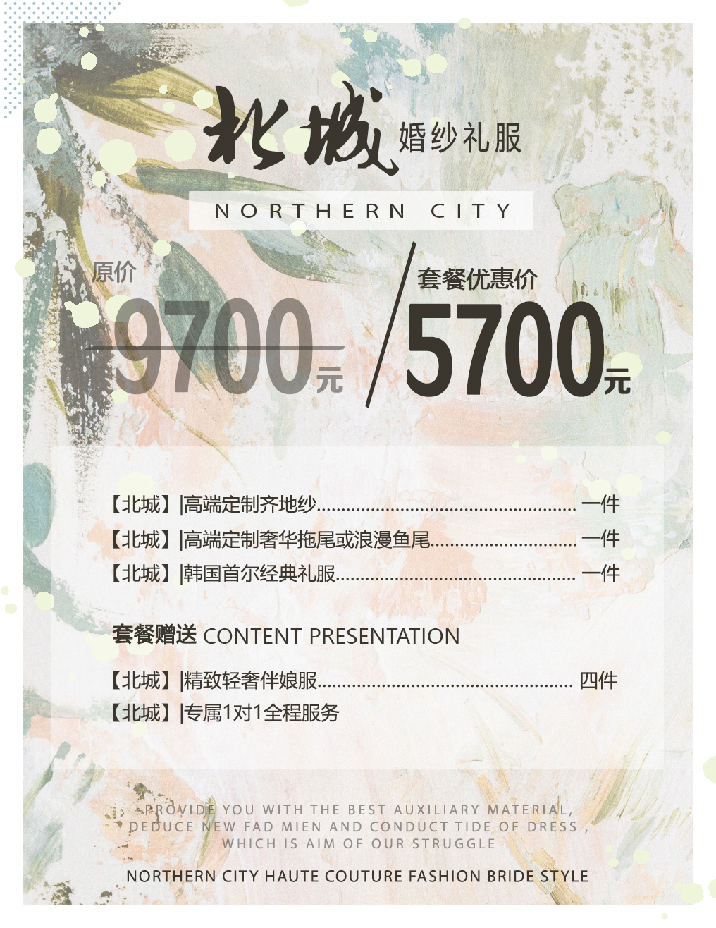 【北城】高端定制齐地纱一件 【北城】高端定制奢华拖尾或浪漫鱼尾一件 【北城】韩国首尔经典礼服 赠送: 【北城】精致轻奢伴娘服四件 【北城】专属1对1全程服务