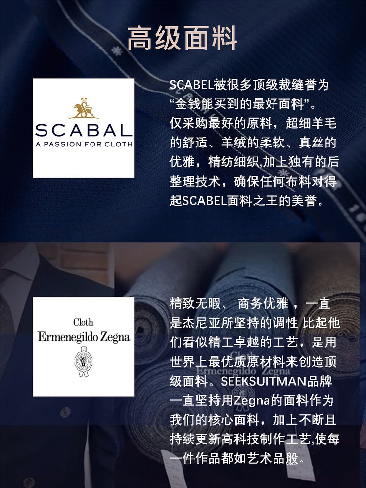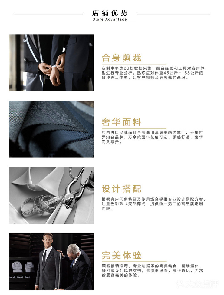 设计师一对一服务,提供最适合你的方案 千种款式与面料可供挑选,海量样衣任你试穿,精细量体,手工缝制